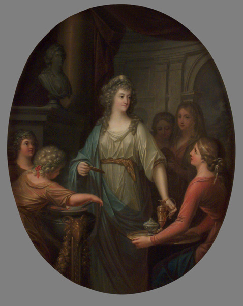 Oljemålning på duk. Stående helfigur, fas höger. Omgiven av fem unga flickor. Vit tunika, blå mantel. I vänstra handen liten guldtallrik, högra fattar en guldkanna från en bricka, hållen av en av flickorna. På ramens baksida med blyerts "Prinsessan" samt "Skokloster". Limmad oval spännram. Skrivet på lapp på spännramen: "M.A. Stenbock 1812". Dubblerad duk. Förgylld, oval ram, krönt av lilla riksvapnet i romb med draperad mantel och prinsesskrona. Ramlistens bredd 85 mm. På ramen skriven 1800- talslapp: "Sofia Albertina prinsessa, konung Adolf Fredriks dotter, som Abedissa af Qvedlingburg" (1787-1803). Tillhörande lapp: Portrait af Högsalig Hennes Kongl. Höghet Prinsessan Sophia Albertina. Skänkt till Hans Excellens, Herr Grefve Magnus Brahe. År 1840 Wördnadsfullt af M. A. Stenbock.