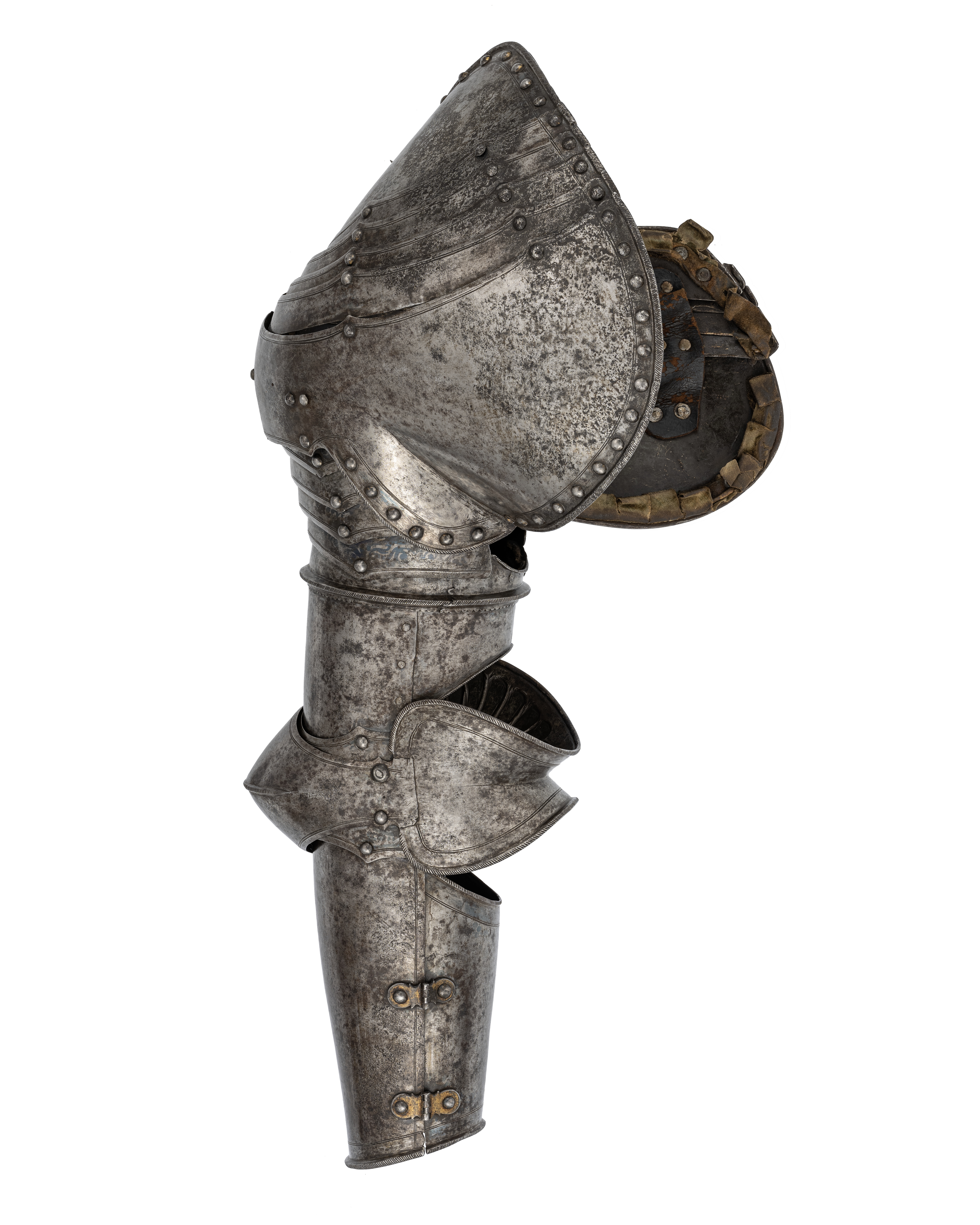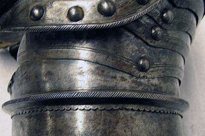 Driven stålpåt, utsidan med blånerat mönster mot blankpolerad bakgrund. Axelstycke av sammanlagt sex delar. Upptill ocn nertill två större skenor med i mitten fyra mindre. Övre skenan välvd med rundad urtagning för halsen, lutande framåt med högre kant mot ryggen. Över axeln två rektangulära hål för rem, mellan dessa nitad sölja. Yttre hålets kant driven uppåt i lätt förhöjning, för att underlätta remmens ändbeslag att få plats. Nedre plåten välvd med urtagning för armen och över bröst och skuldra utdragna partier, vinklade i lätt välvda och uppåt riktade vingar mot armarna. I skenornas övre kanter fem utdragna spetsar. Yttre kanterna omvikta, rundsmidda och med filade snedställda linjer, dessutom nitar i rad och skuren linje. På insidan kantband av läder överklätt med lambrkängbård av grön sammet. Överarmsdel i åtta delar. Två rörformiga skenor sammanfogade med drivna koniska åsar löpande i varandra och bildandes en i sidled rörlig led. Åsen med snedställda linjer och nedre kanten tandad. Mot insidan urtagningar för armen. I övre skenan sex välvda skenor placerade omlott, med öppning mot insidan uppåt ökande i bredd. Armbuckla i ett stycke, utåt diriven till rundad spets, avsmalnande åt sidorna och utåt övergående i hjärtformig mussla på både ut- och insida, mot utsidan något större, b 122 mm. I armvecket smalnar musslan till en V-formig skena som förbinder de bägge musslorna. Musslans kanter omvikta, rundsmidda och repstavsfilade, i mitten driven dekor liknade palmblad. Från palmbladets nedre ände utgår en tvärs över musslan löpande repstavsfilad ås. Över och under bucklan en mindre skena med övre kant utdragen till tre låga spetsar. Underarmsdel, rörformig av två halvor, nedåt svagt avsmalnande. Fästade i varandra med förgyllda gångjärn på insidan och tapp genom hål på utsidan. Inre skenan kortare med upptill rundad urtagning. På insidan rester av läderband under nitarna. Dekor: Heltäckande blånerat slingrande rankverk mot etsad och polerad blank bakgrund.