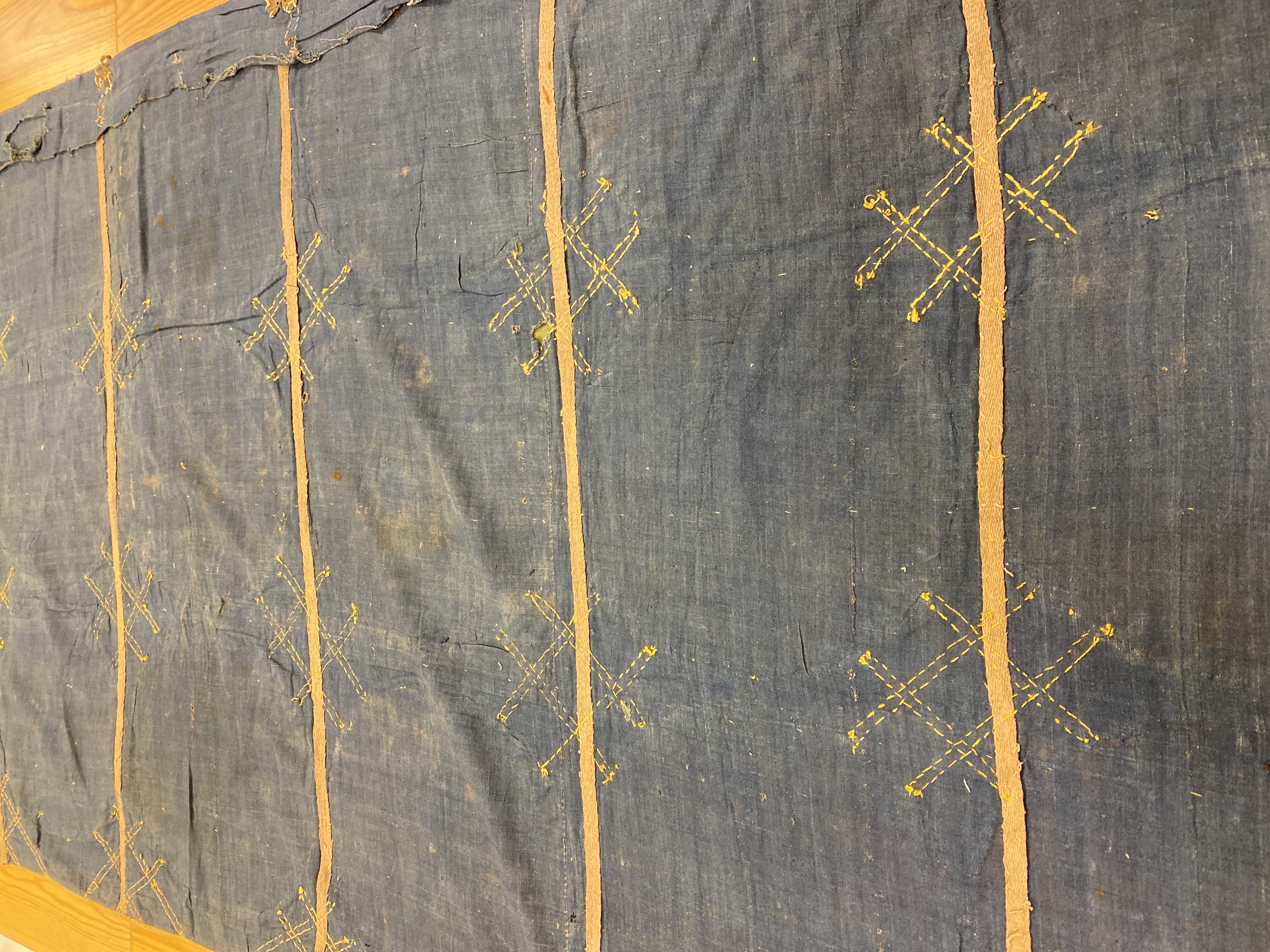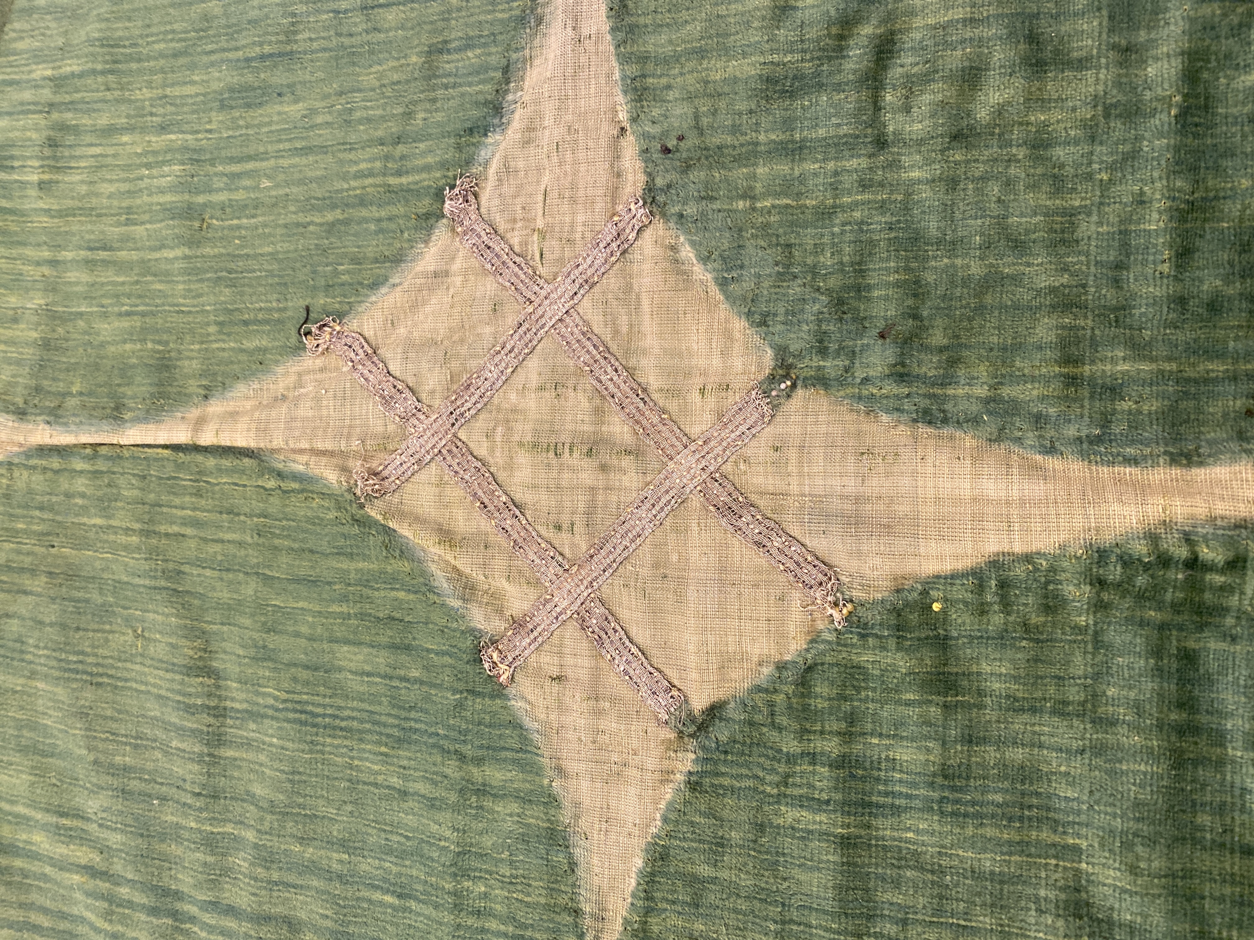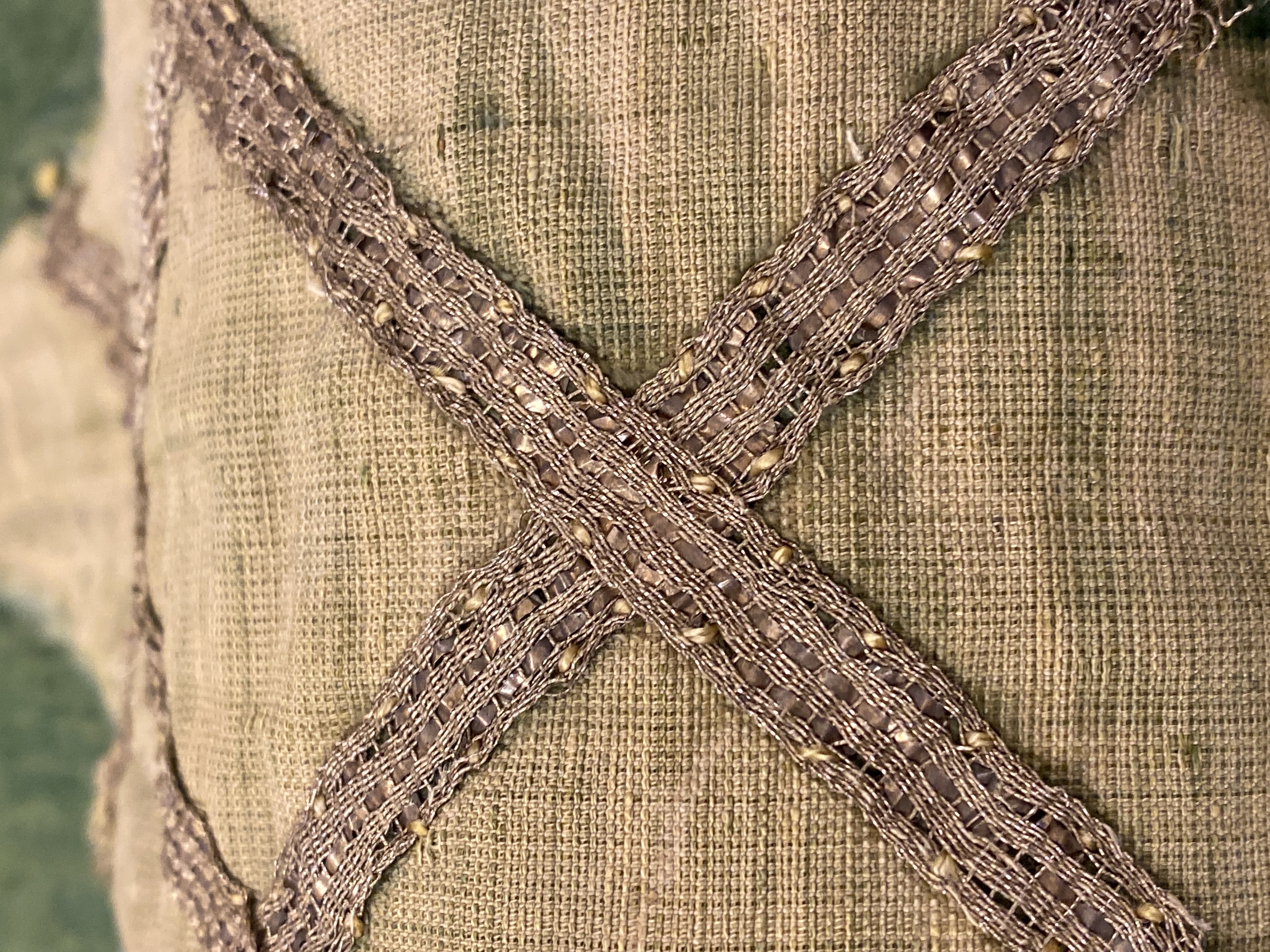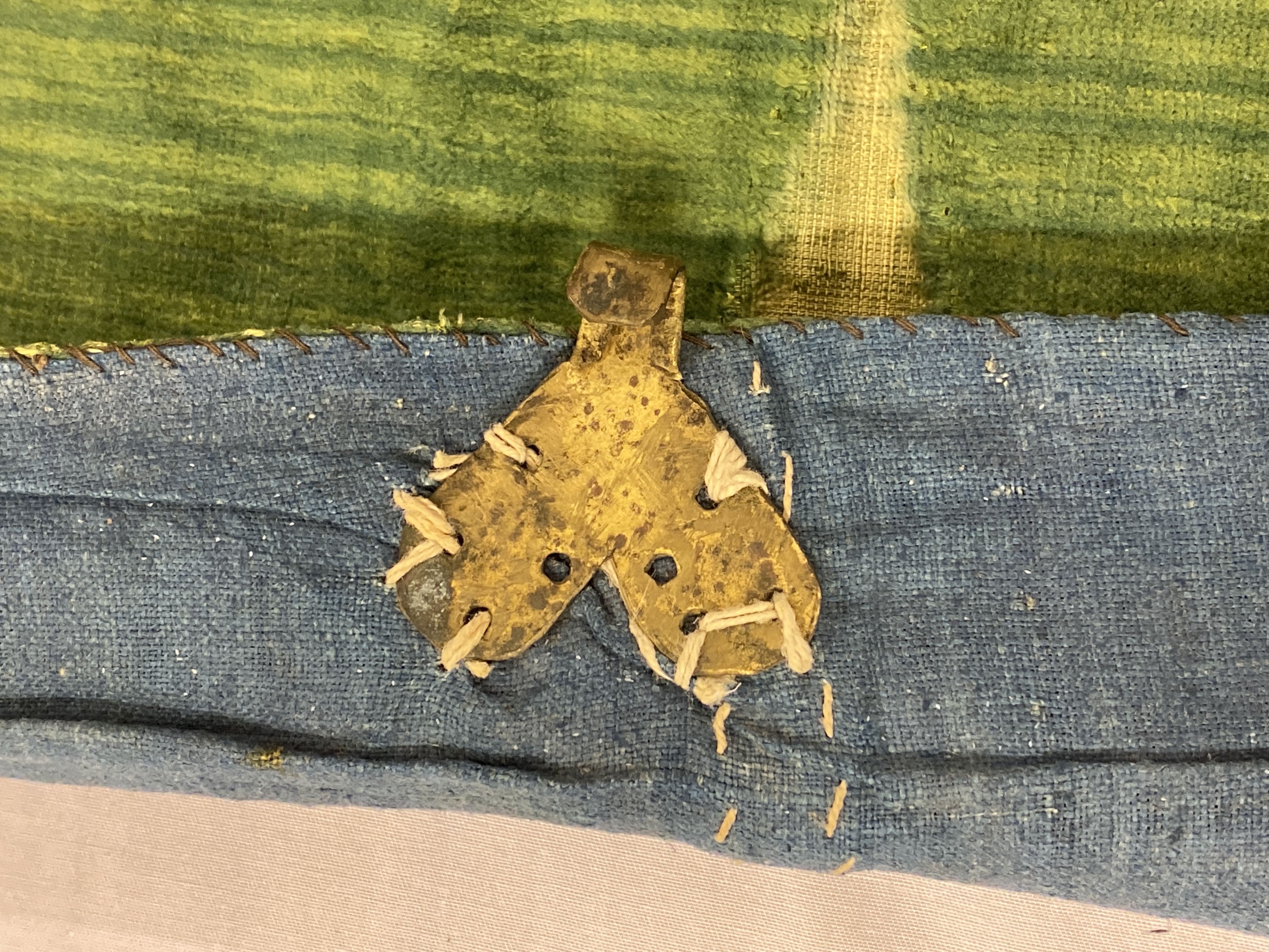 Grön sammet, mycket skarvad. Märken efter de sk ÒBiskopkullarundlarnaÓ. Silverband. Blått linnefoder. Inköpt 1871.