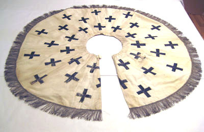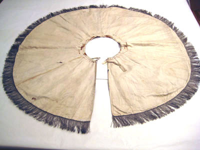 Rundskuren kjol av två våder vitt siden med foder av vitt linne. Med grevliga ätten Sinclairs hjärtvapen målat med svart färg strött över kjolen. Kantfrans av silvertråd, 80 mm lång. I midjan tunnel med dragsko av 25 mm brett linneband. Vidfästad rektangulär etikett med bläckpåskrift: "Gripsholm 1945 // nr xxx:5 // gv fr.Sinclair // Adolf Fredriks torg // 1777".
