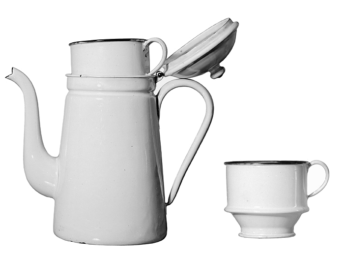 KAFFEPANNA (brygg-) med påstratt Av vitemaljerad stålplåt. Konisk, med handtag, pip och fällock samt något skålig botten. Kring mynningen en utstående stav, nedanför denna en kälformig inknipning. Handtag av en flackstavigt hopvikt plåtremsa och bågformigt utsvängt. Pip S-formad, avsmalnande uppåt, med något kluven mynning. Lock kupigt, med stavformig kant, hög sarg och liten tryckt hjässknopp samt med gångjärnet vid handtaget. Höjd: 24,1 cm.; diameter: 13,5 cm. Påstratt: Övre delen cylindrisk, med handtag och utstående stavformig bräddkant i blått, nedtill en starkt utstående stav; nedre delen snett indragen nedåt samt med nedre kanten avslutad i en utstående stav. Handtag flackstavigt och bågformigt. Höjd: 8,9 cm.; diameter: 10 cm.
