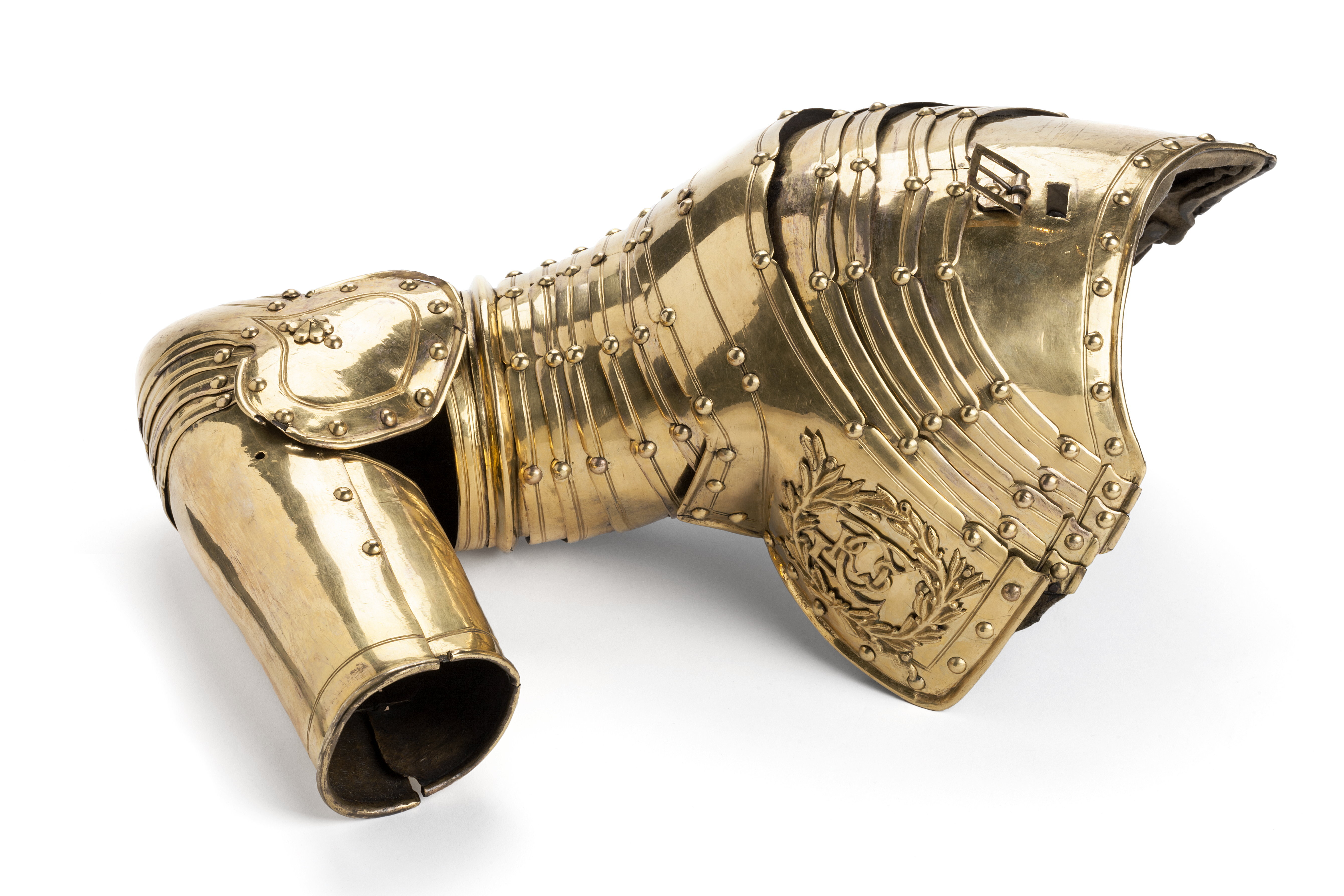 Höger axelstycke med armskena tillverkad för Pfalzgreve Johan Casimirs begravningsrustning 1652 och omgjord för Johan Gyllenstierna och Karl X Gustavs begravningsrustning 1660.