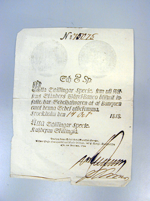 Sedel av papper med vattenmärke: "RIKSENS STÄNDERS // BANCO SEDEL" samt tre kronor. Två prägelstämplar, samma som på nr 9620. Vid överkanten tryckt N:o samt skrivet med bläck: 75075 (första 5 ändrad från anann siffra). Nedanför prägelstämplarna tryckt text: "Sch. 8 Sp: // 8 Schillingar Specia, som uti Rik- // sens Ständers Wäxel-Banco blifwit insatte, har Sedelhafwaren at af Banquen // emot dena Sedel utbekomma. // Stockholm den 14 Oct. 1818" (14 Oct. skrivet med bläck). "Åtta Schillingar Specia // Kahdexans Skillingiä." Nedtill samma varningstext mot förfalskningar som på övriga sedlar samt två otydliga underskrifter. Av den tryckta texten är Sp:, Banco, Specia, Banquen, och Stockholm tryckta med antikva, resten med frakturstil.