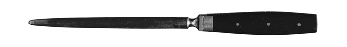 BRYNSTÅL Av stål med träskaft. Nästan rundstavigt och fint längdräfflat, vid inre och yttre änden en kort slät oräfflad del, mellan stål och skaft en kälformig hals. Skaft med platta sidor, något rundade kanter och spolformig kontur samt bestående av en från halsen utgående skafttunga, belagd på vardera sidan med en skiva av ebenholts; skivorna fästa vid skafttungan medelst tre genom det hela gående mässingsnitar; på inre änden på vardera sidan ett tennbeslag. Längd: 28,3 cm. Stål, diameter: 1,1 cm. Skaft, längd: 11,5 cm. Svensk tillverkning; Eskilstuna Jernmanufaktur AB.