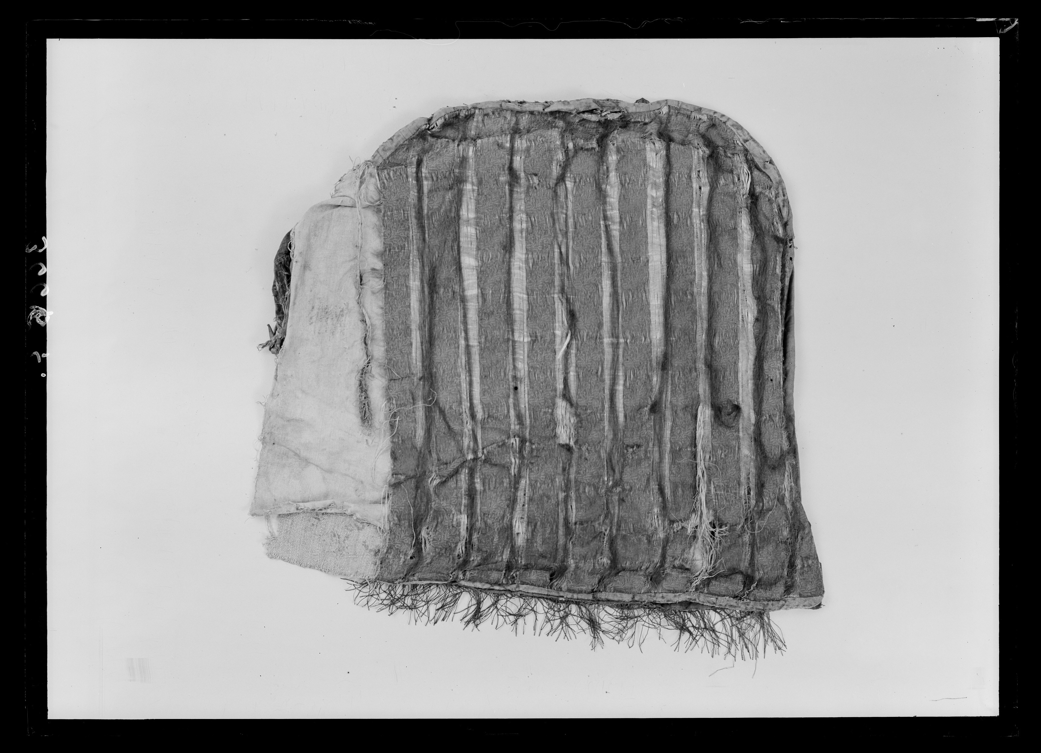 Ovalt formad med en rak kant nedtill. Av silveraktigt sidentyg med påsydda band, 40 mm breda, av vävt silke, svart botten med guldgula blommor. Mellan varje band sitter svarta band av tunn svart silkestråd. Baksidan är klädd med röd linnelärft med ett band nedtill av blå lärft. På bandet sitter en frans av tvinnad guldtråd (60 mm). I övre kanten två hällor av naturfärgat linne. Två små spännen i övre kanten. Dessa sitter fästade på två läderstycken. Själva spännena är av gulmetall troligen förgylld koppar eller mässing, kvadratiska med konturerade ändar, emaljerade med grön färg och med en infattning föreställande en lilja eller voluter. Från ena sidan skjuter en rundad kant av röd sammet ut på vilken sitter ett läderband som knutits ihop på mitten. Kantad av gul sammet som troligen varit röd ursprungligen. Fodrad med grov naturfärgad linnelärft samt vadderad med ett fibermaterial med en tunn yta av brunt skinn.