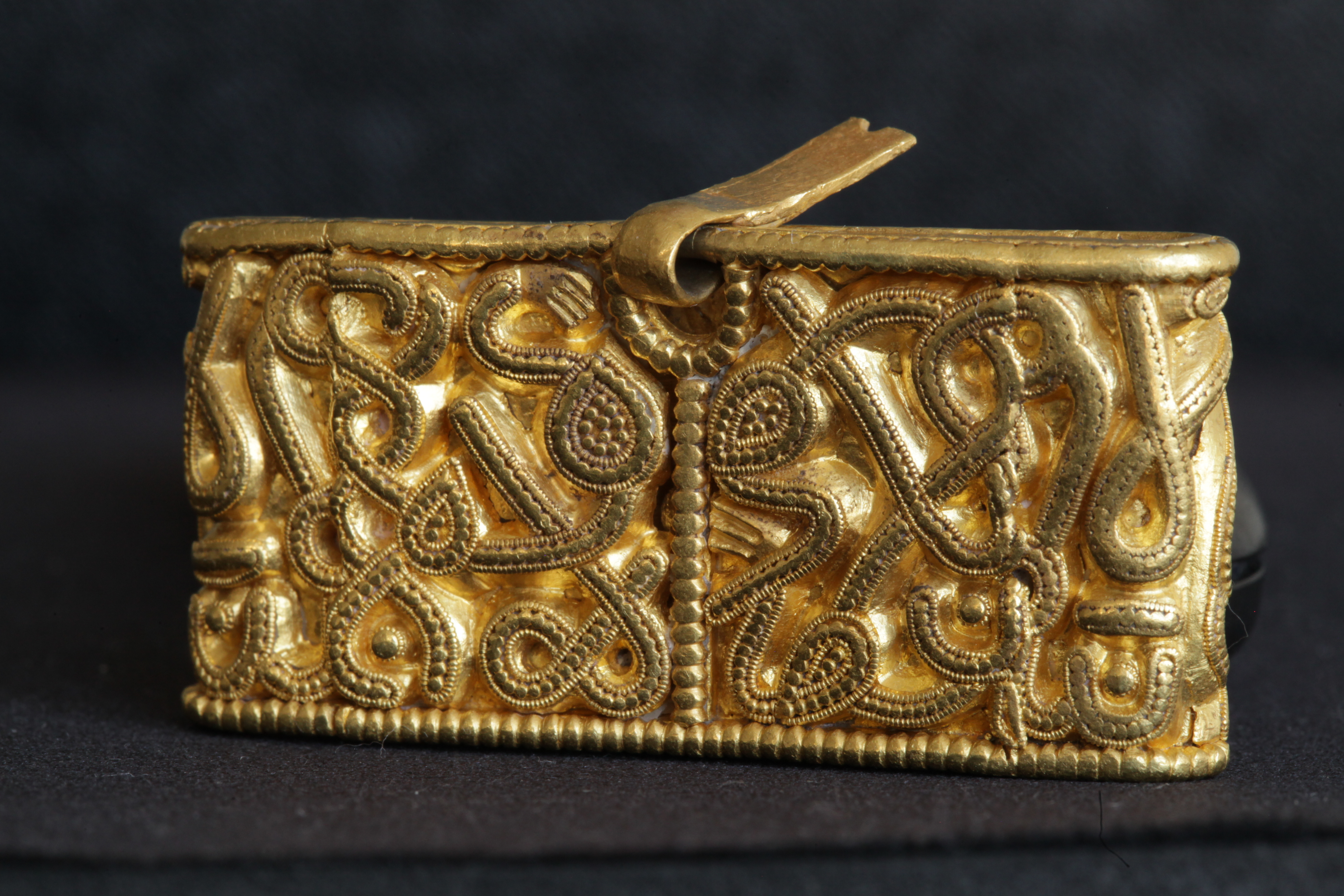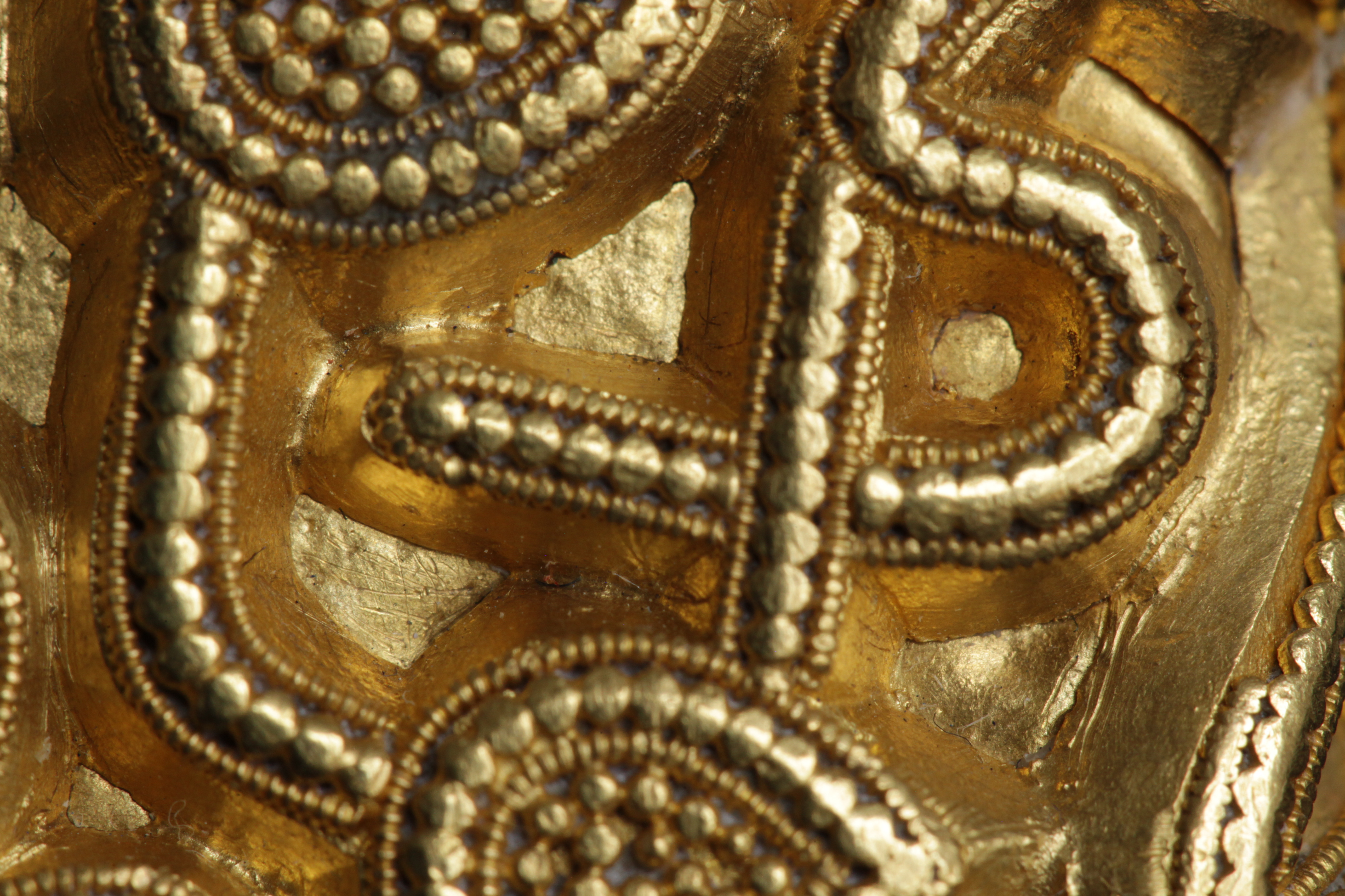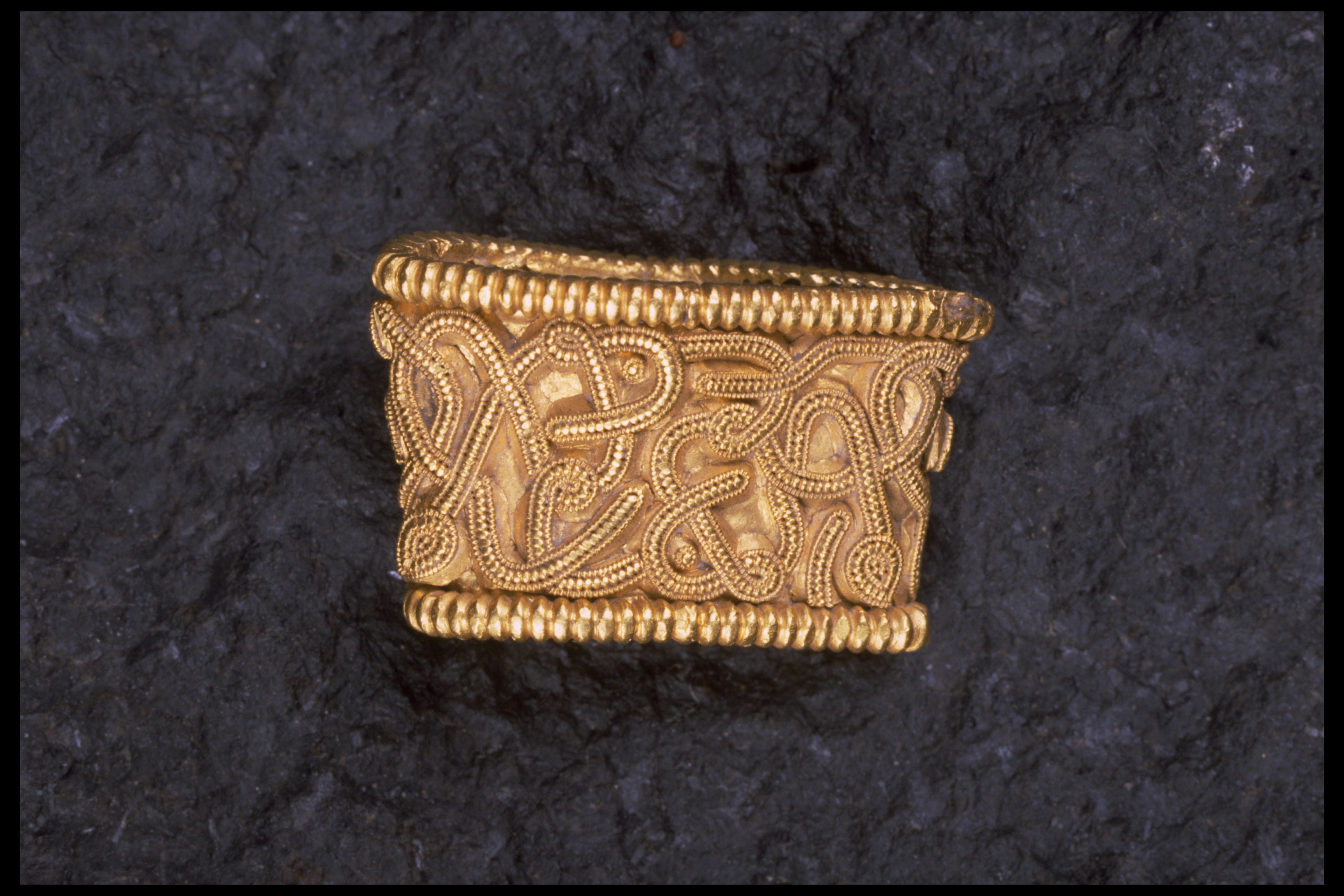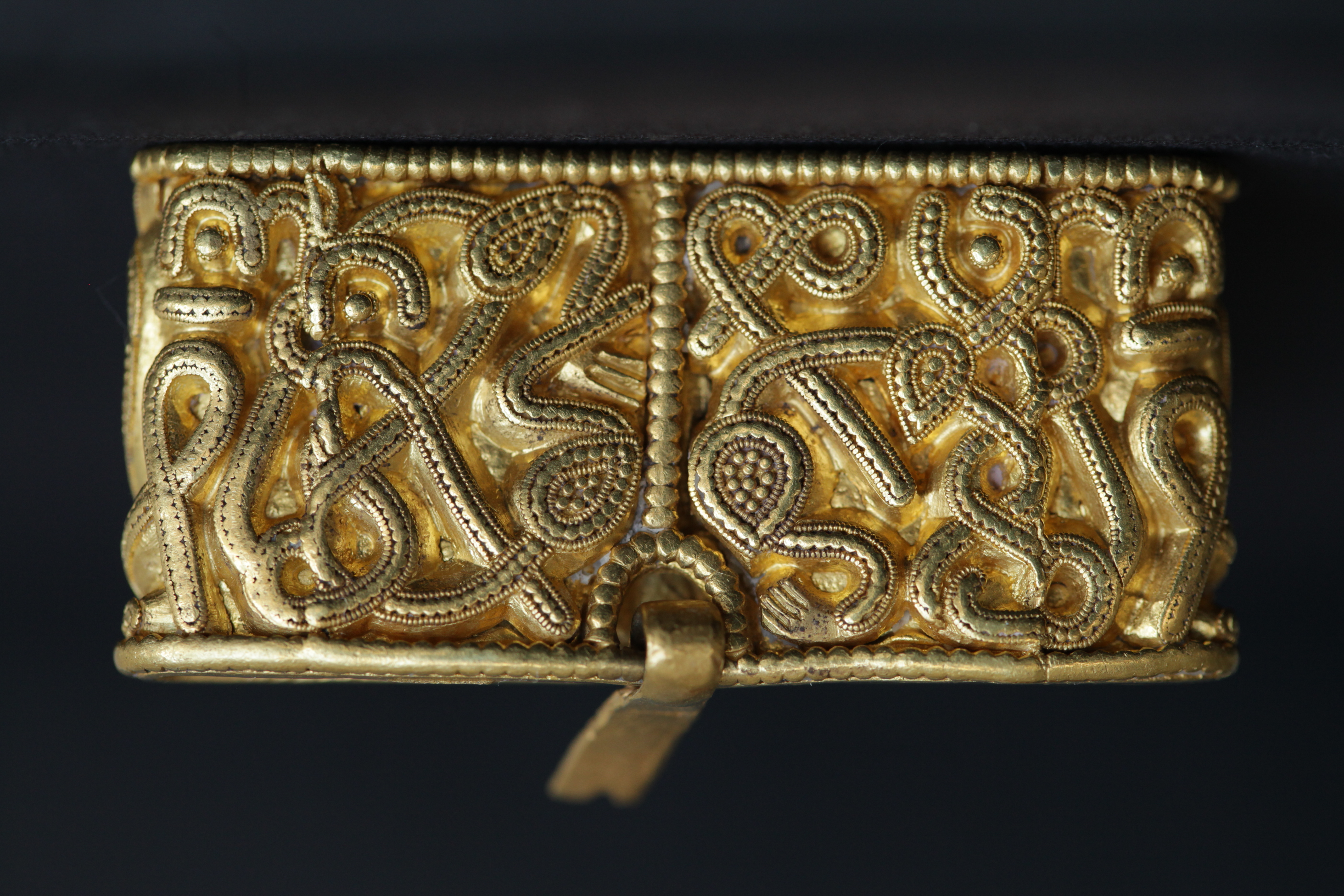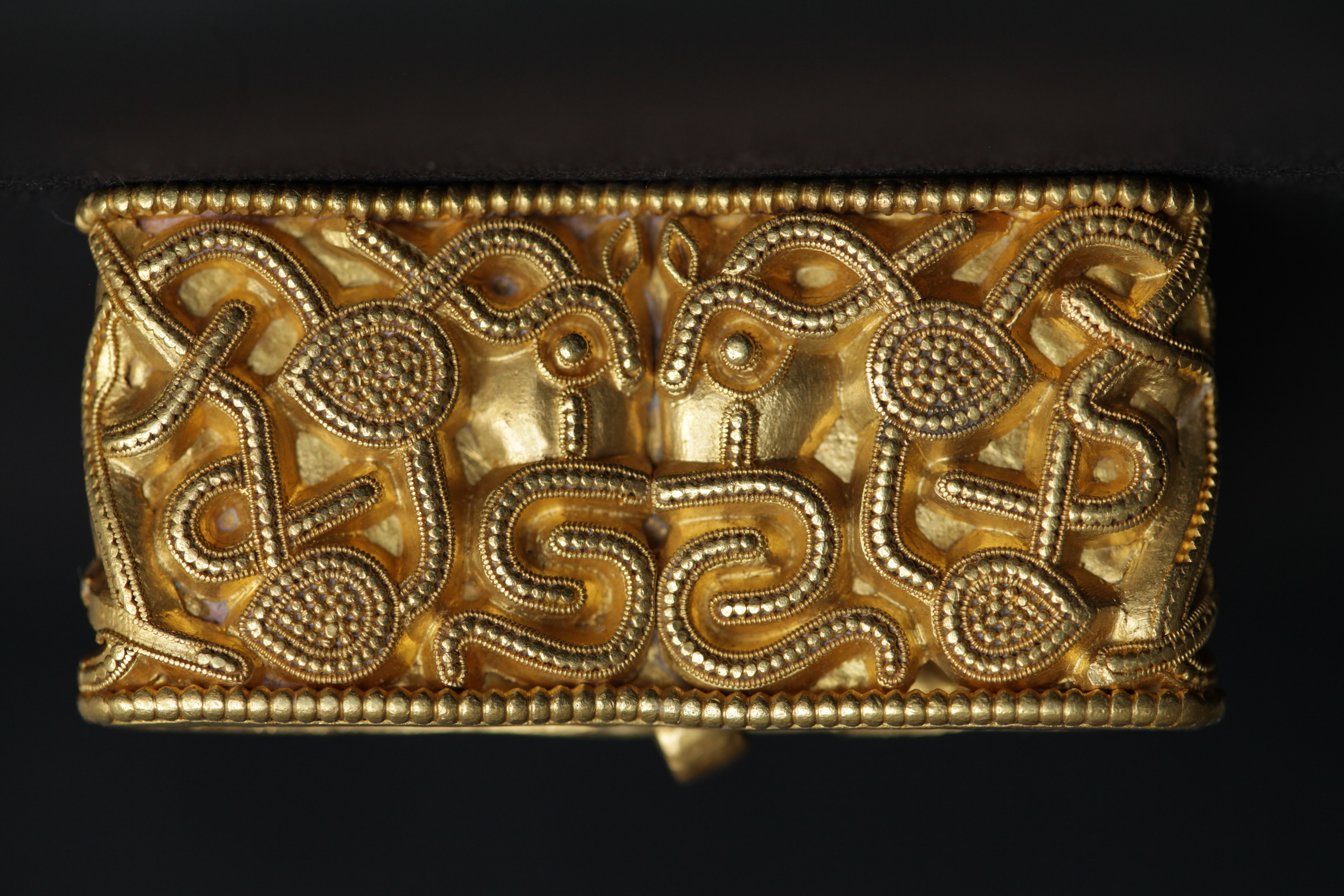 Svärdsslidebeslag av guld med filigransarbete.