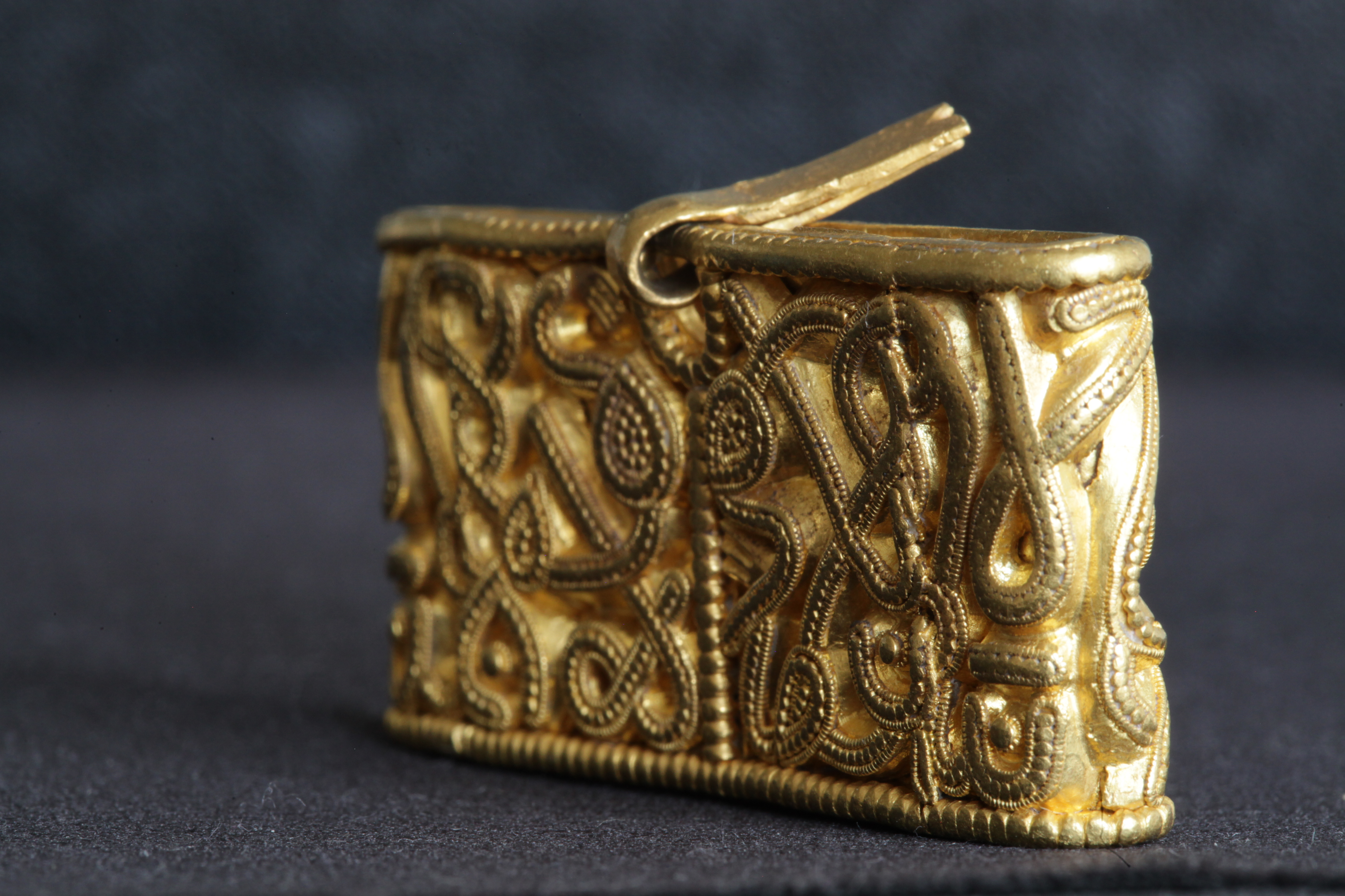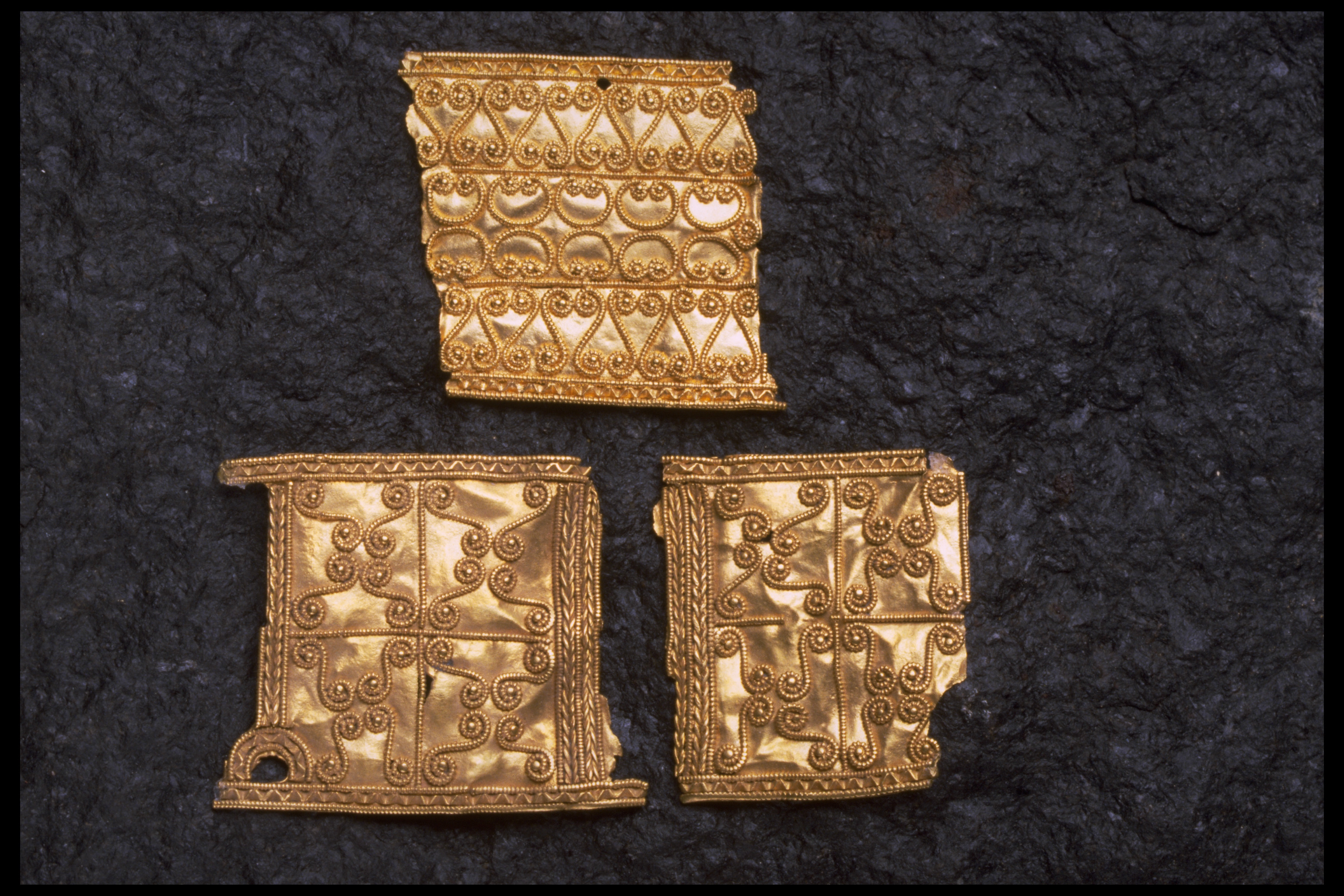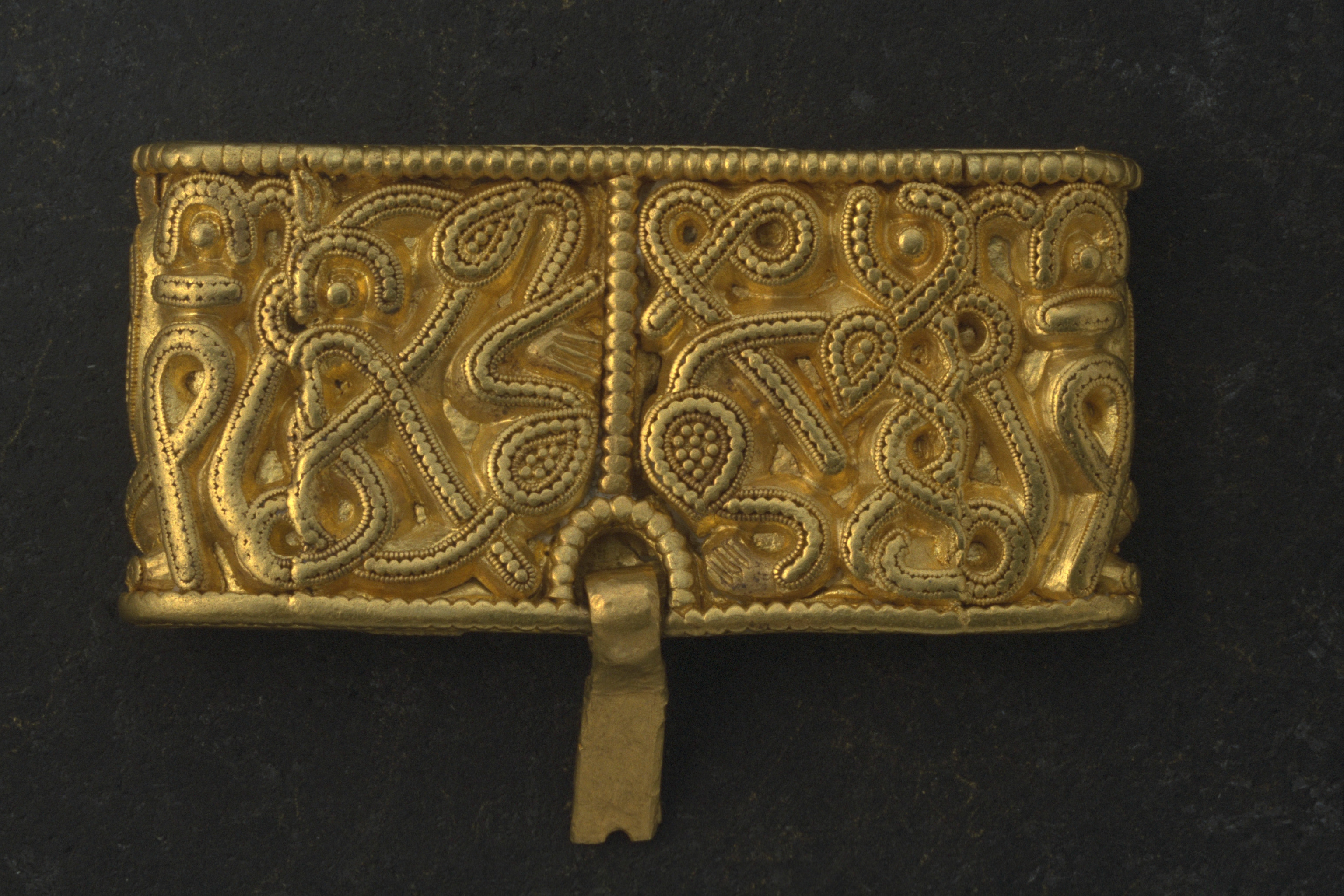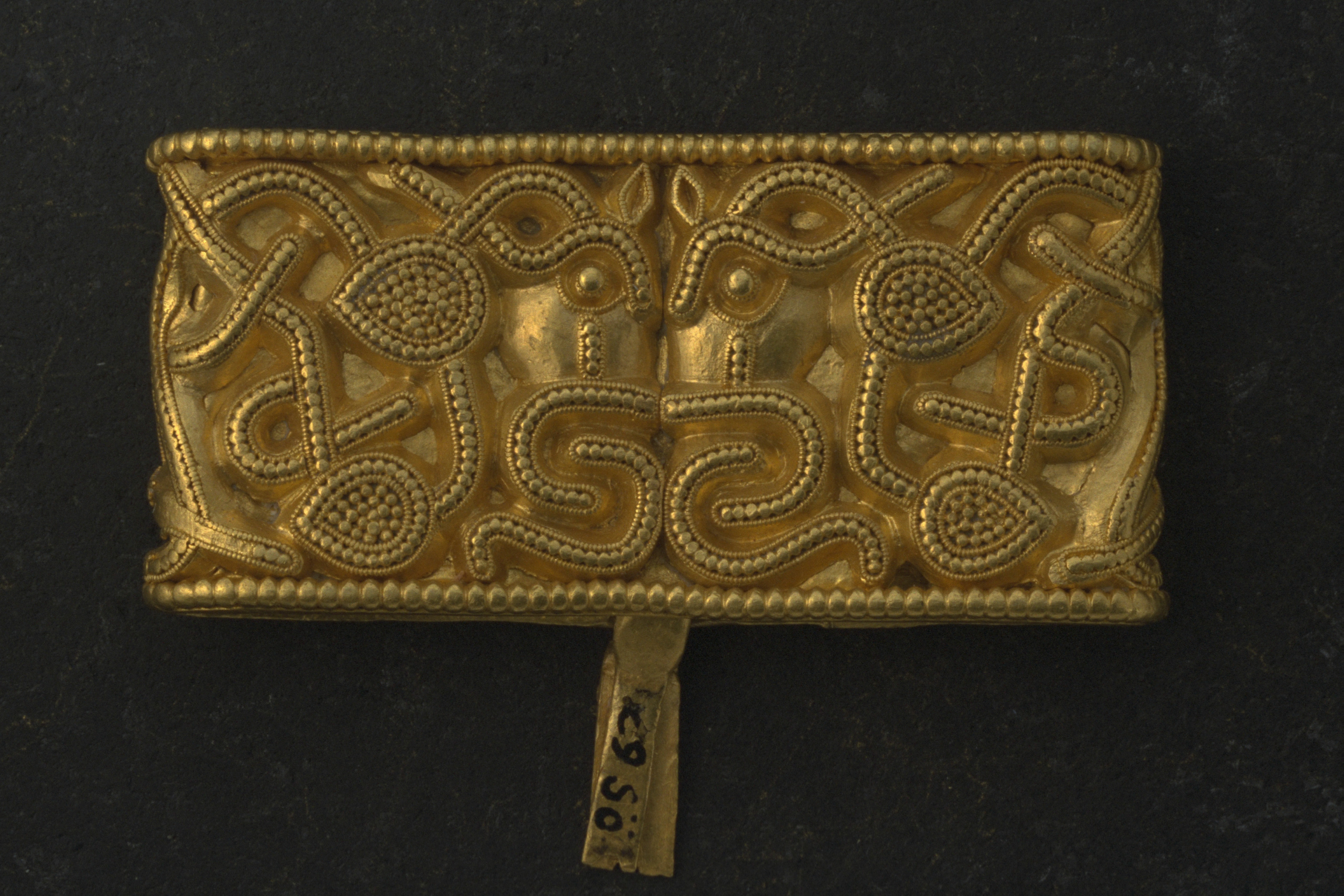 Svärdsslidebeslag av guld med filigransarbete.