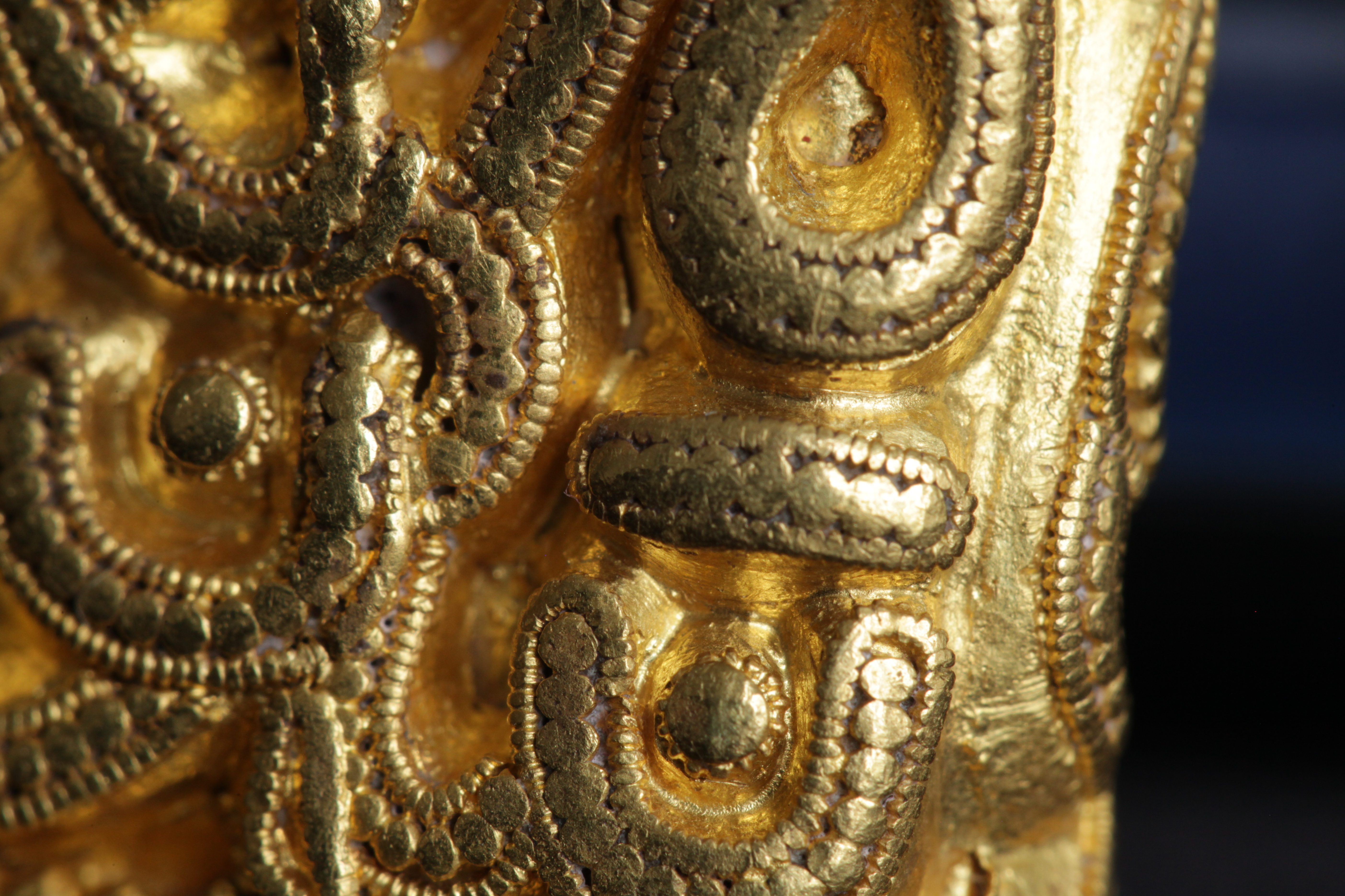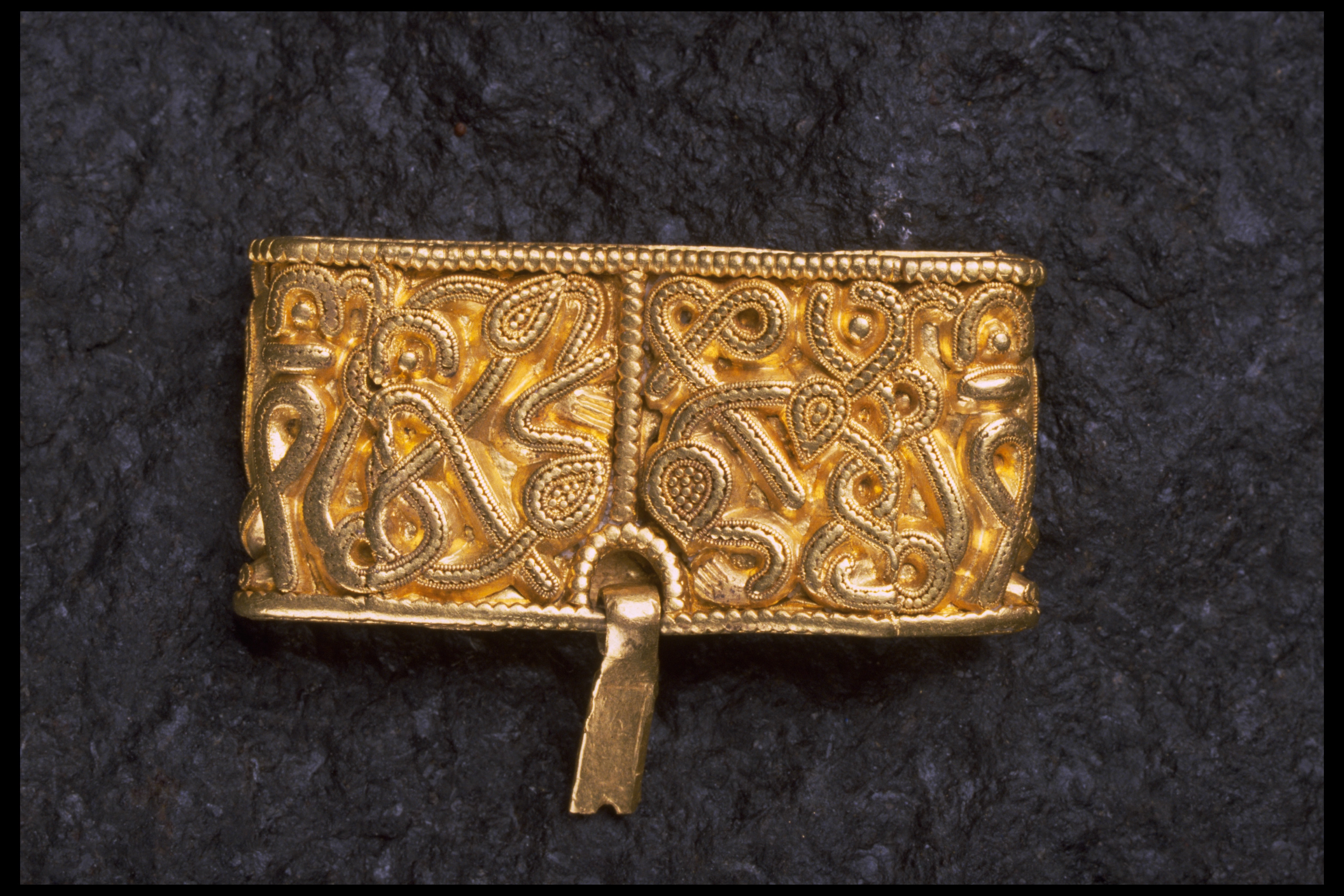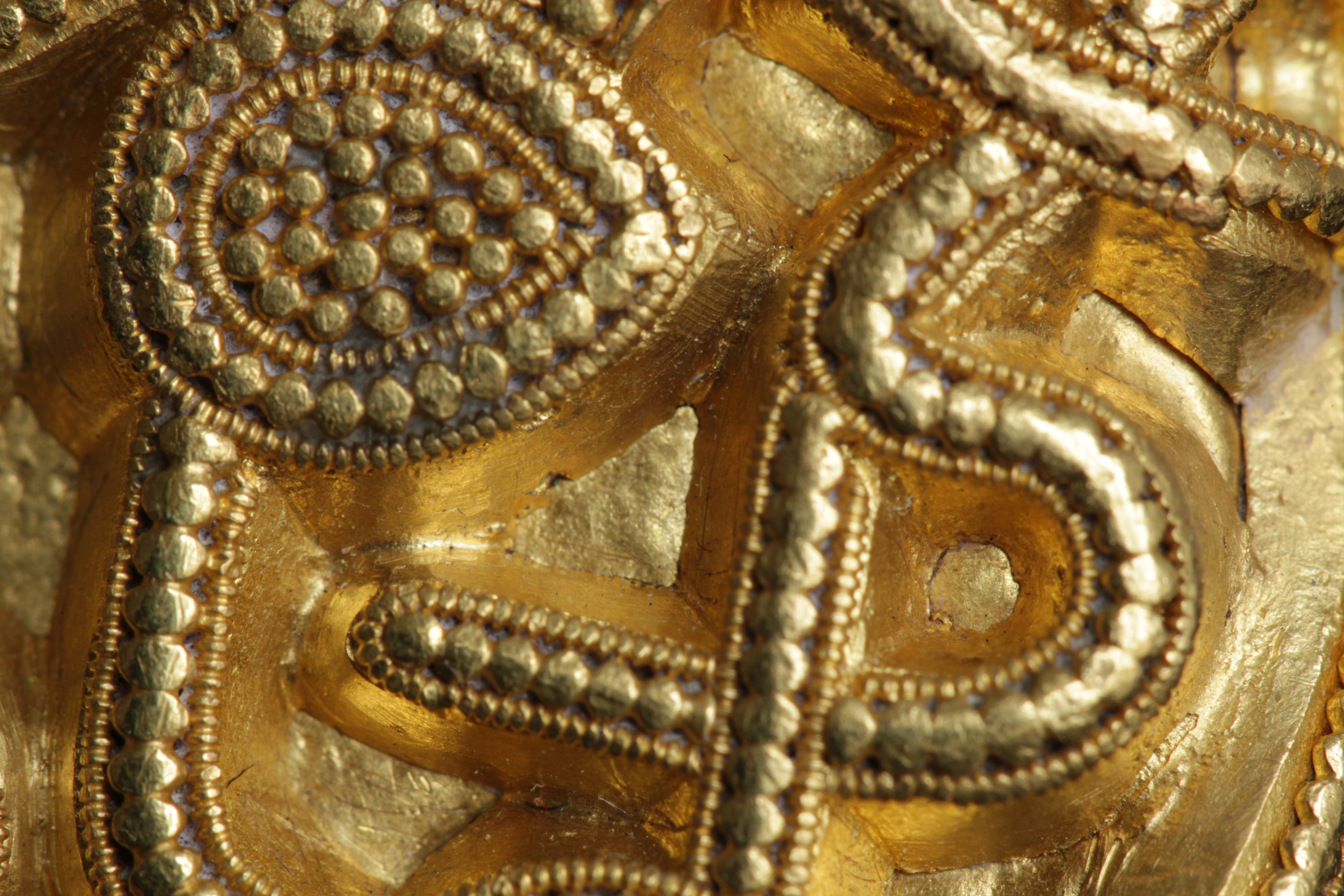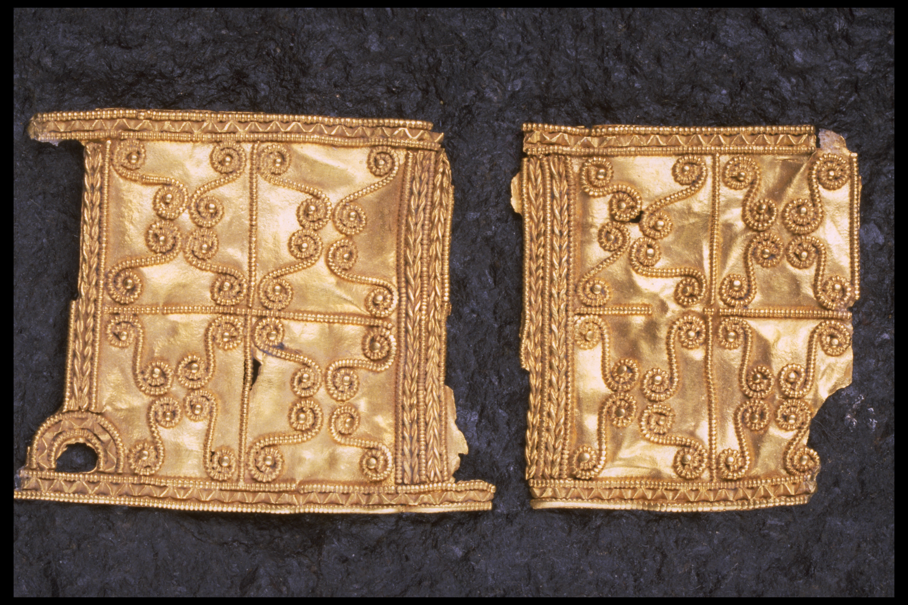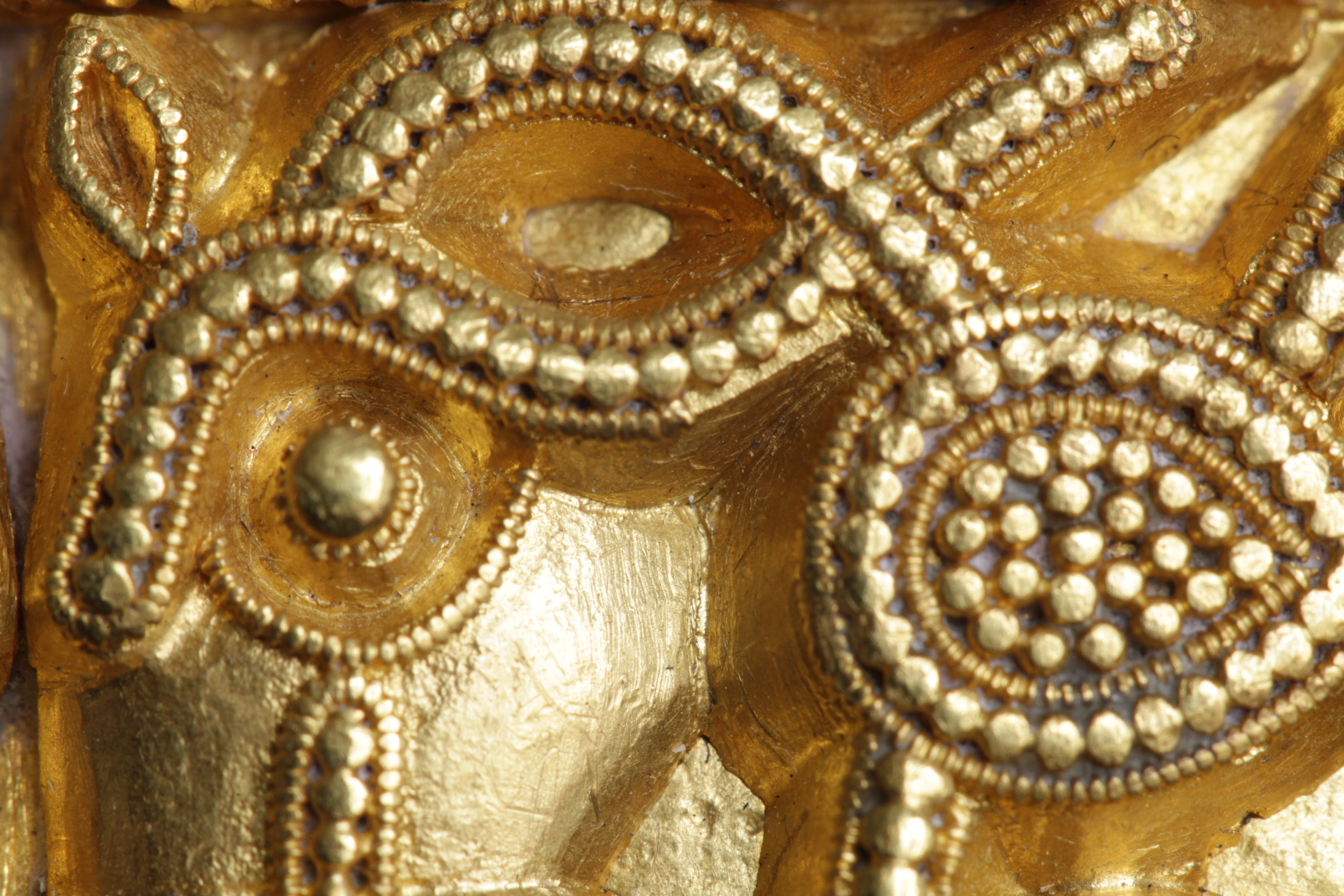 Svärdsslidebeslag av guld med filigransarbete.