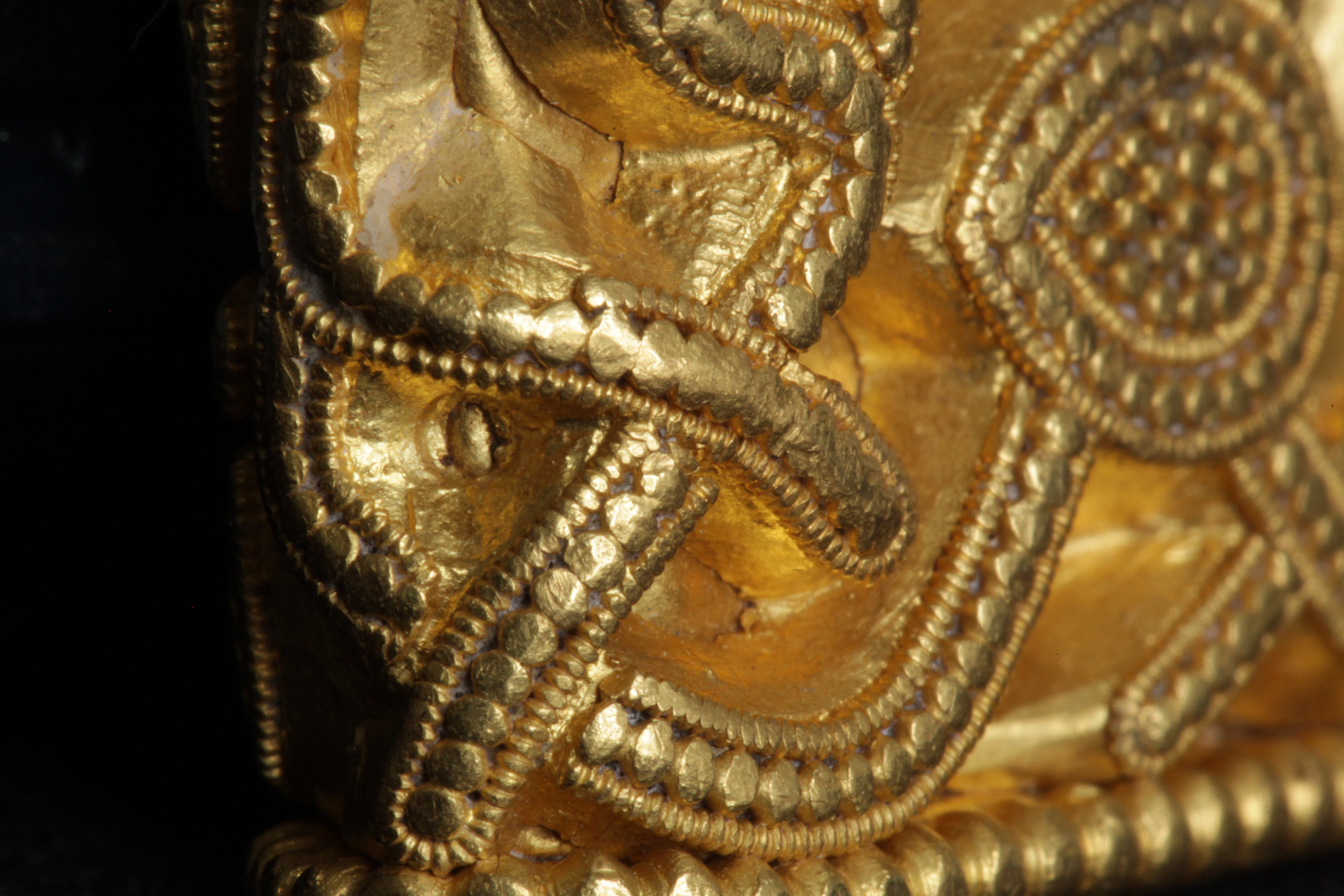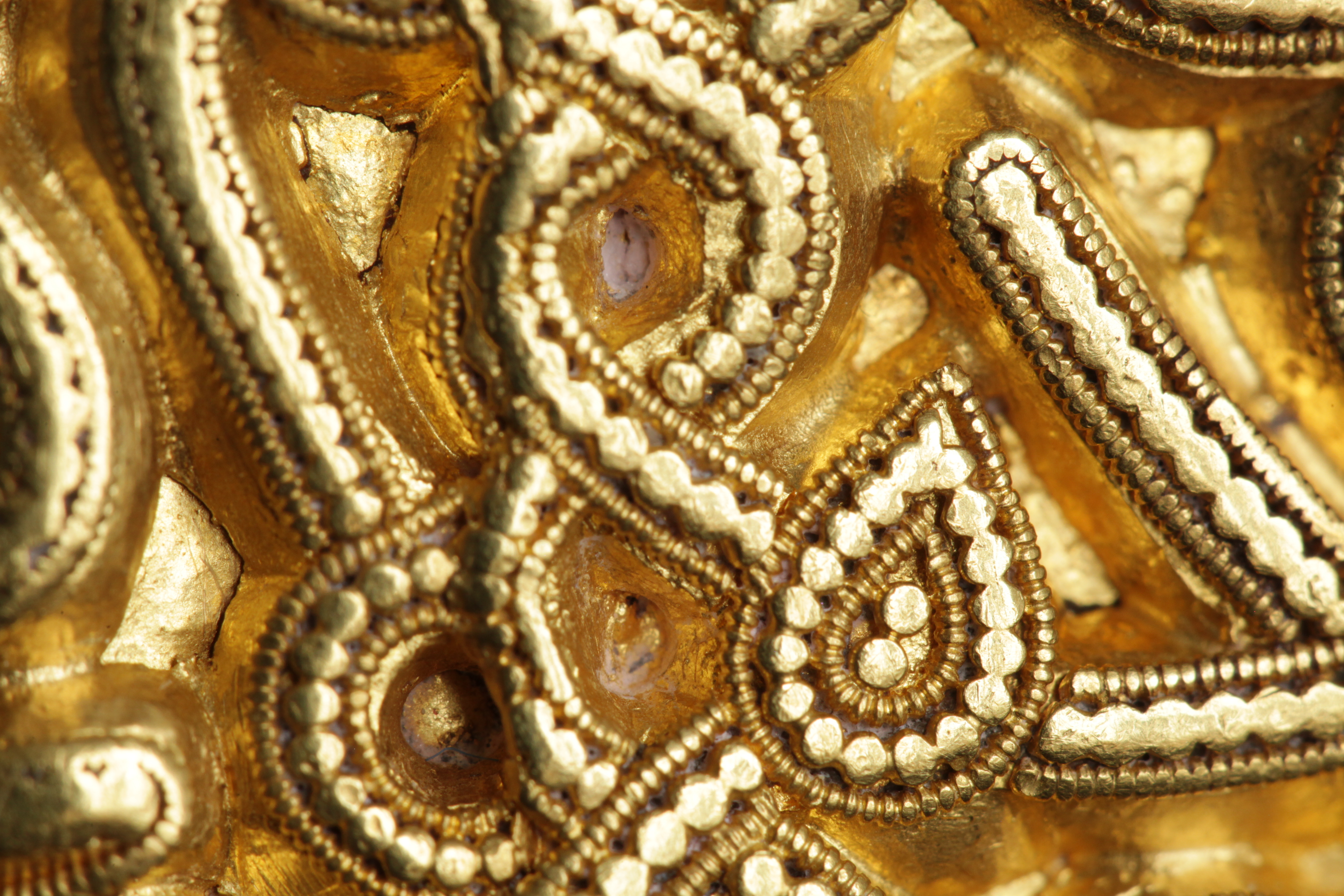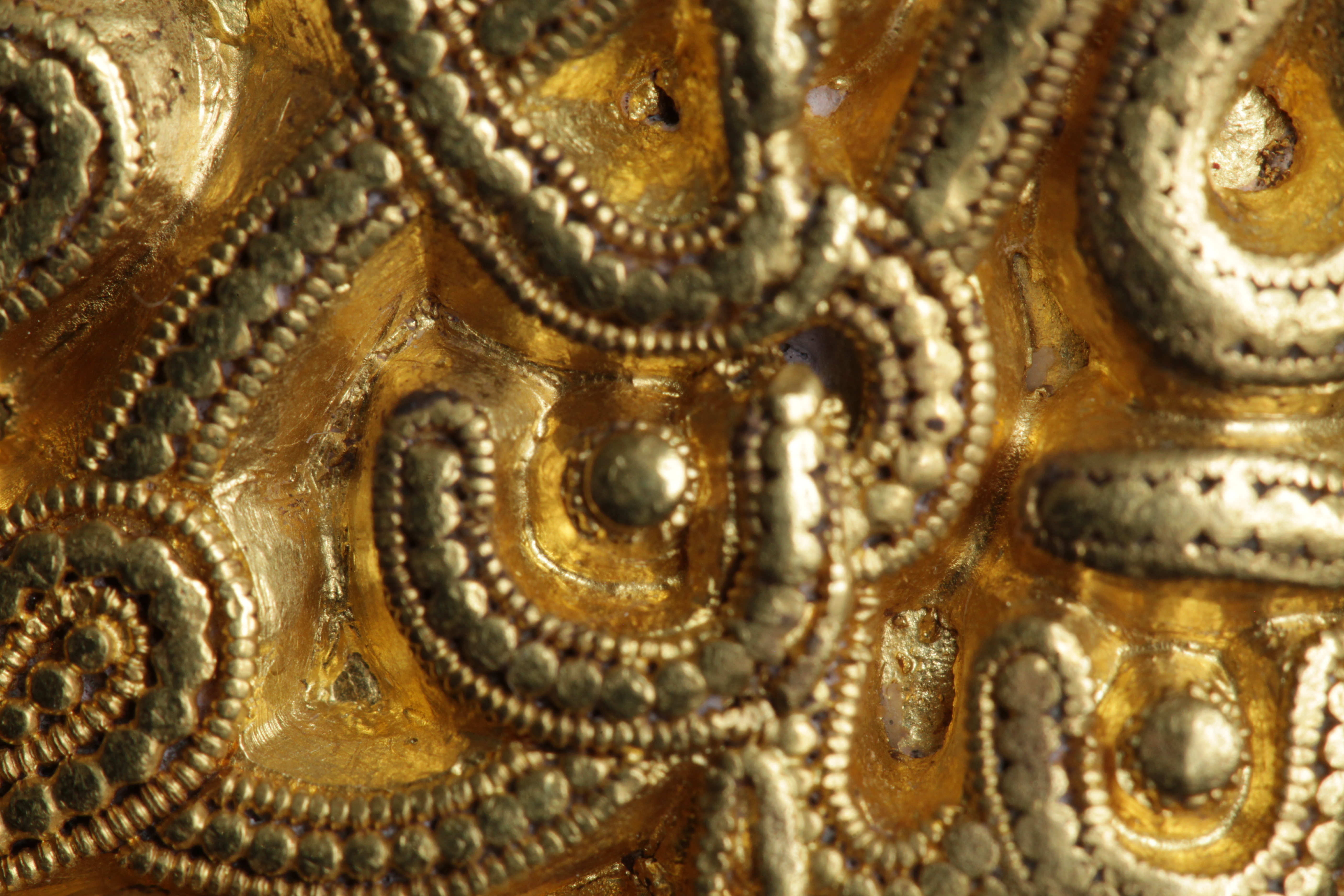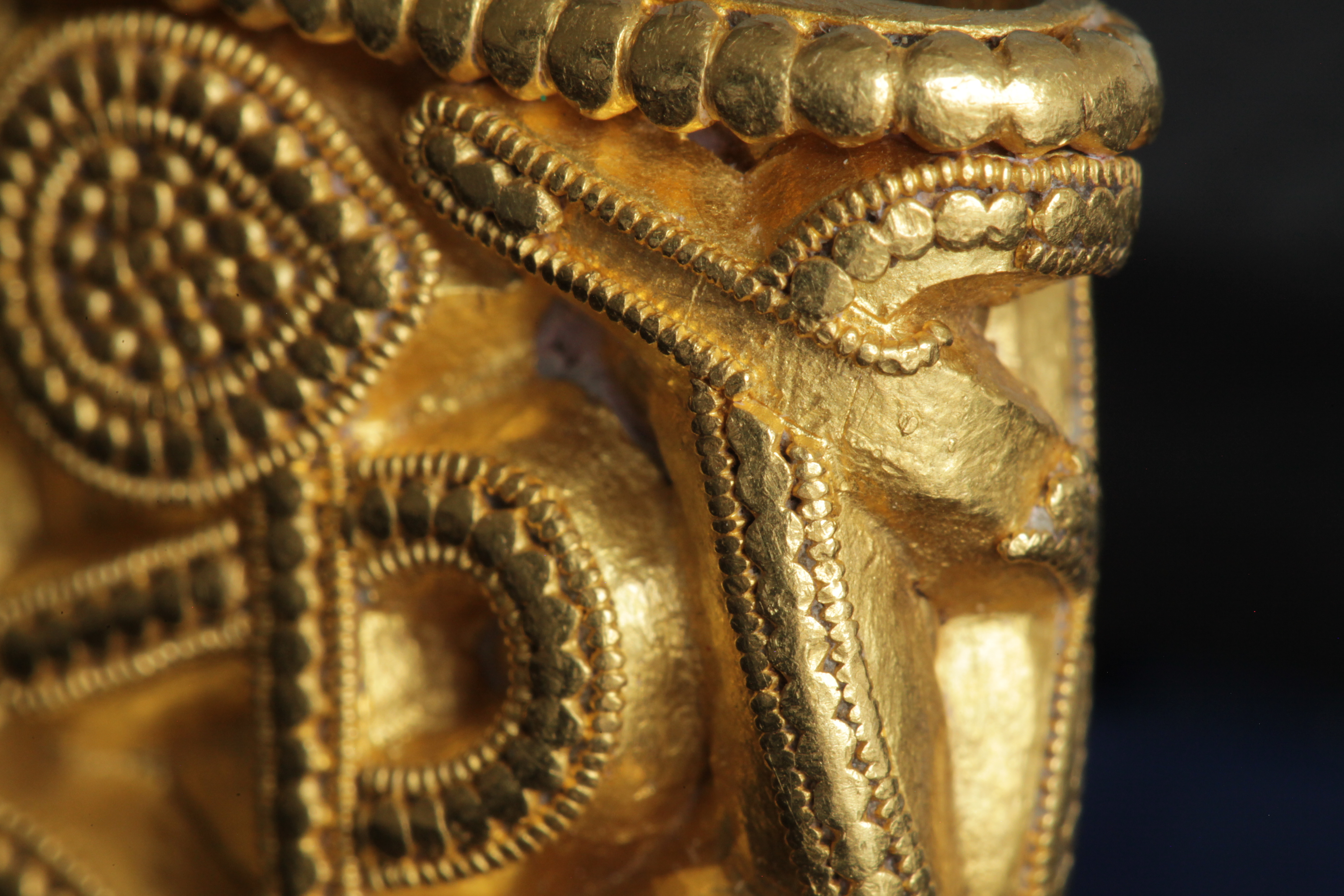 Svärdsslidebeslag av guld med filigransarbete.