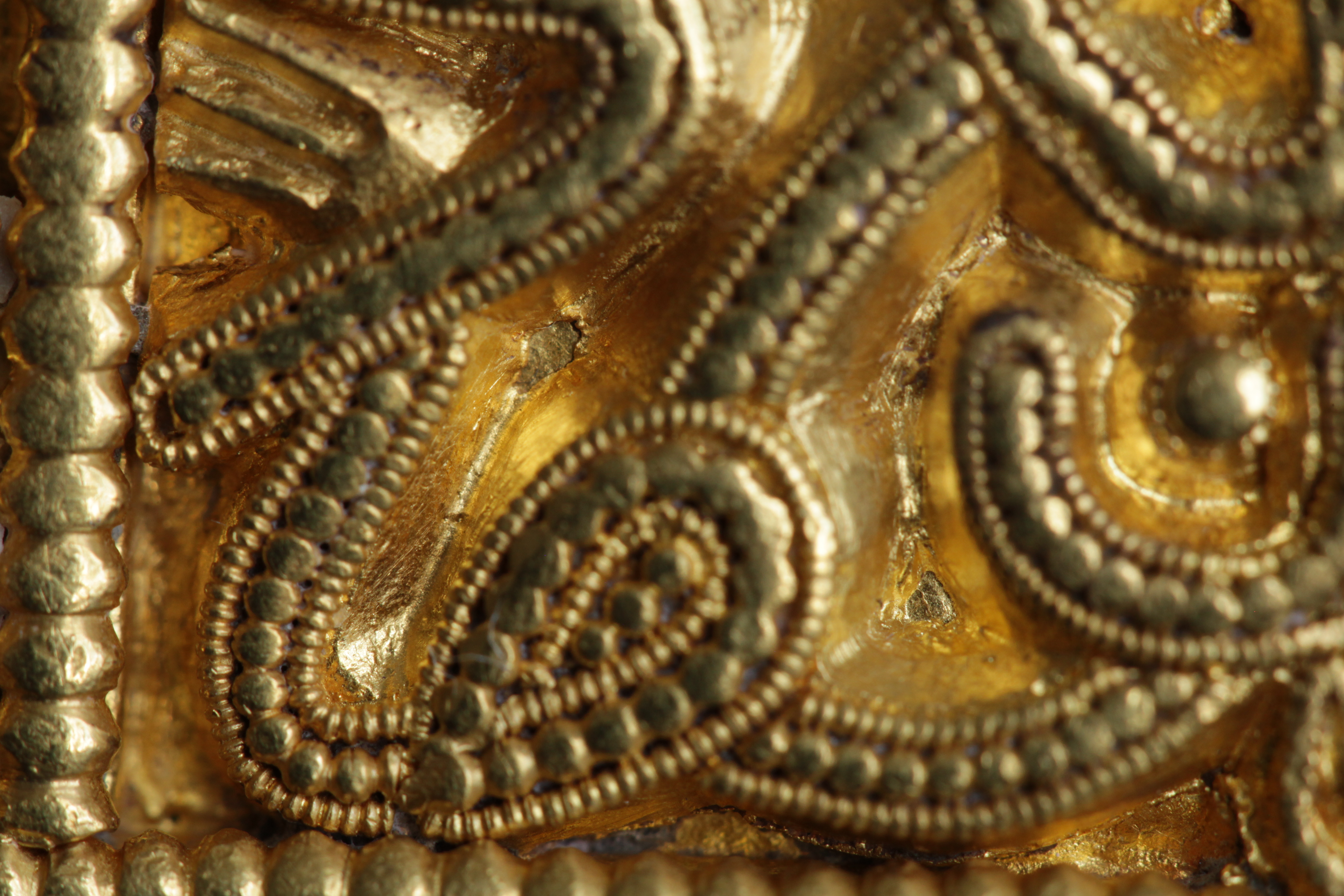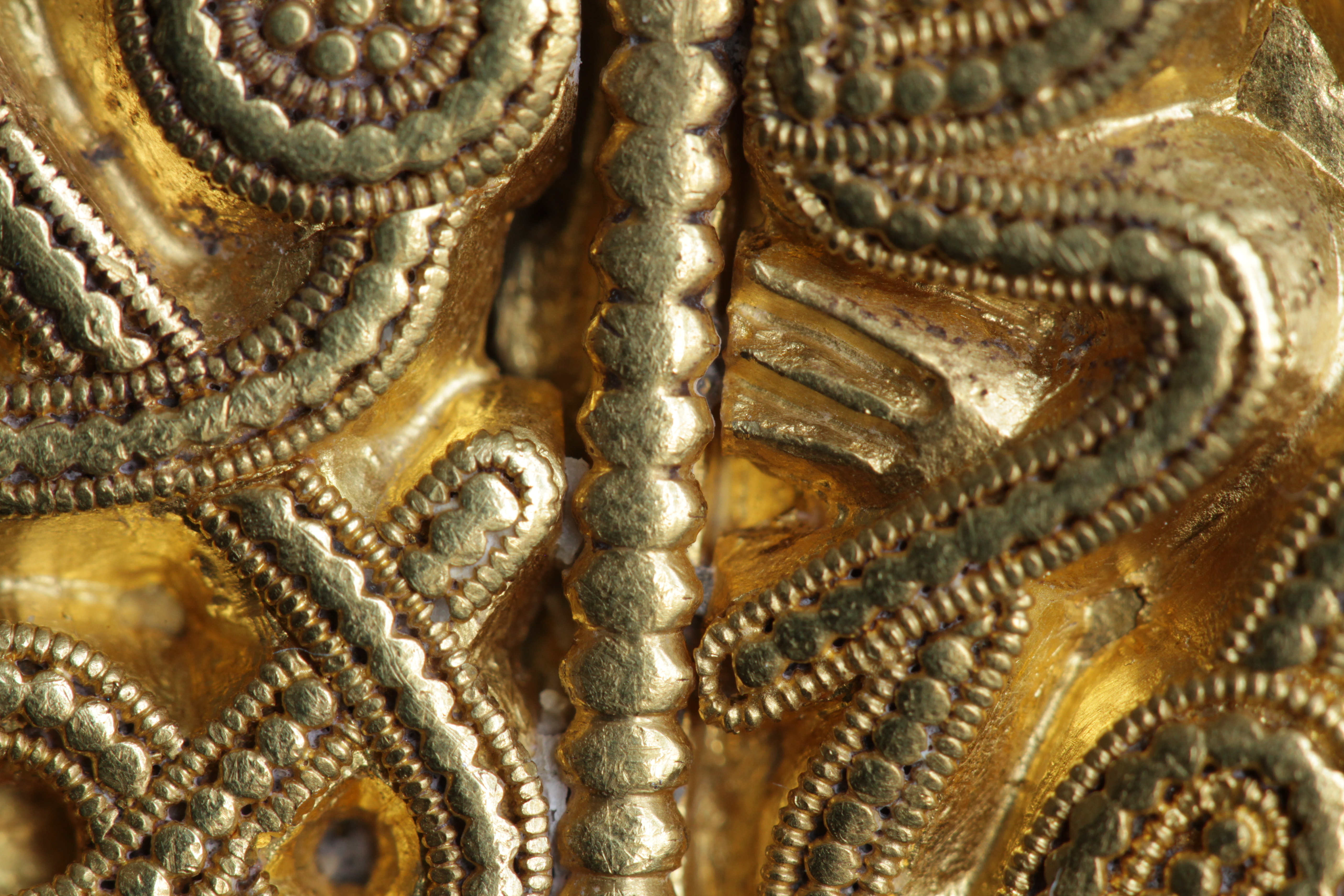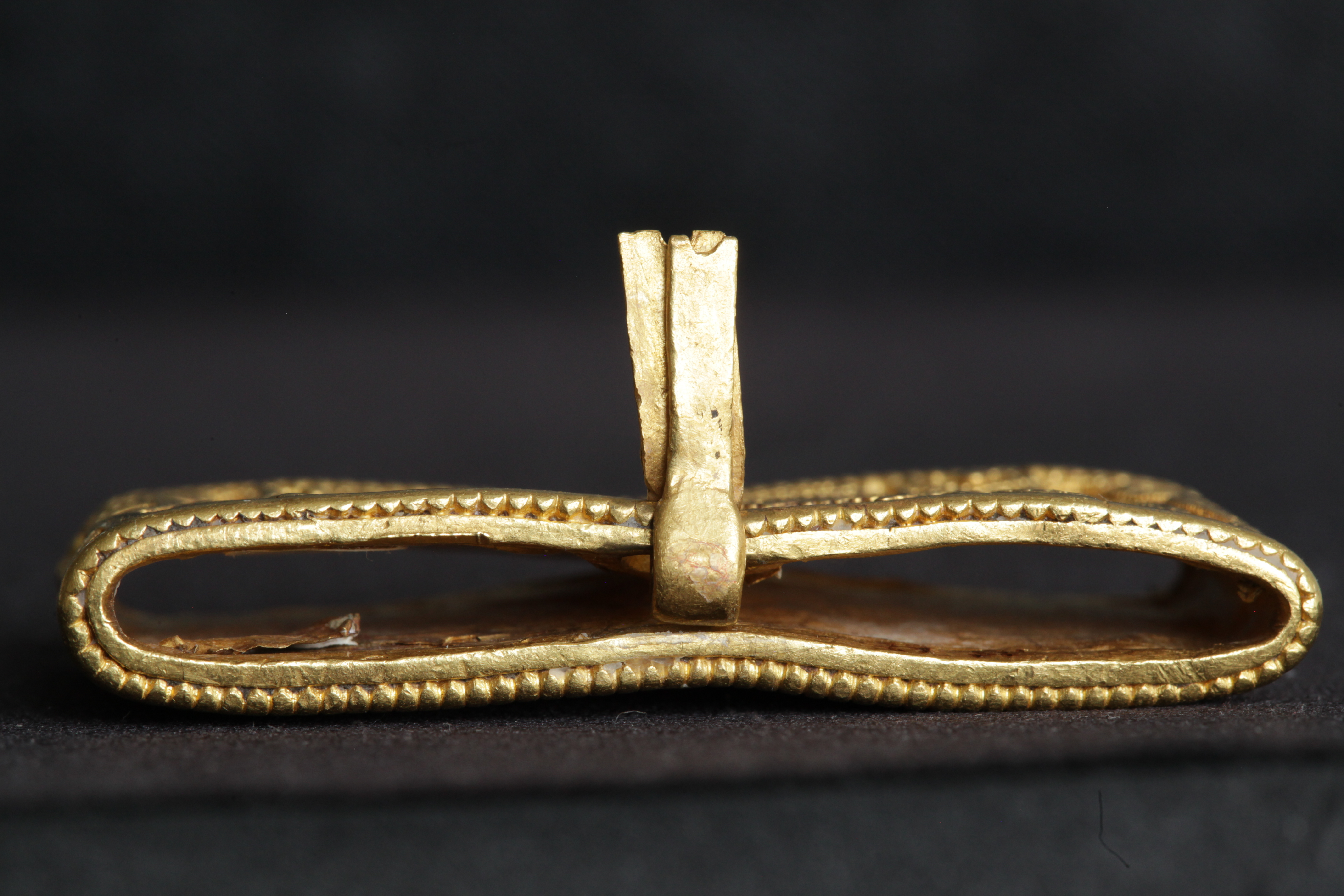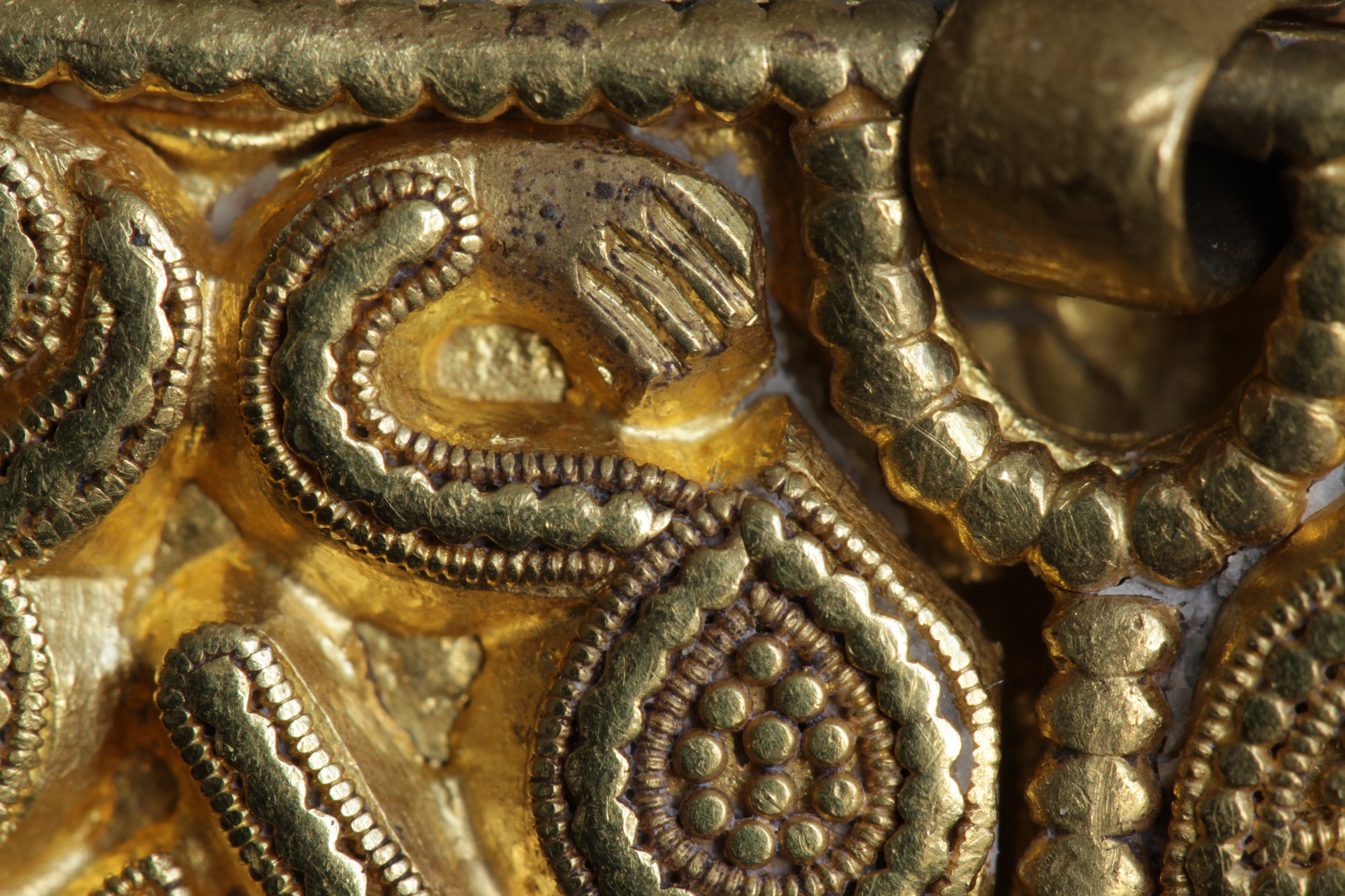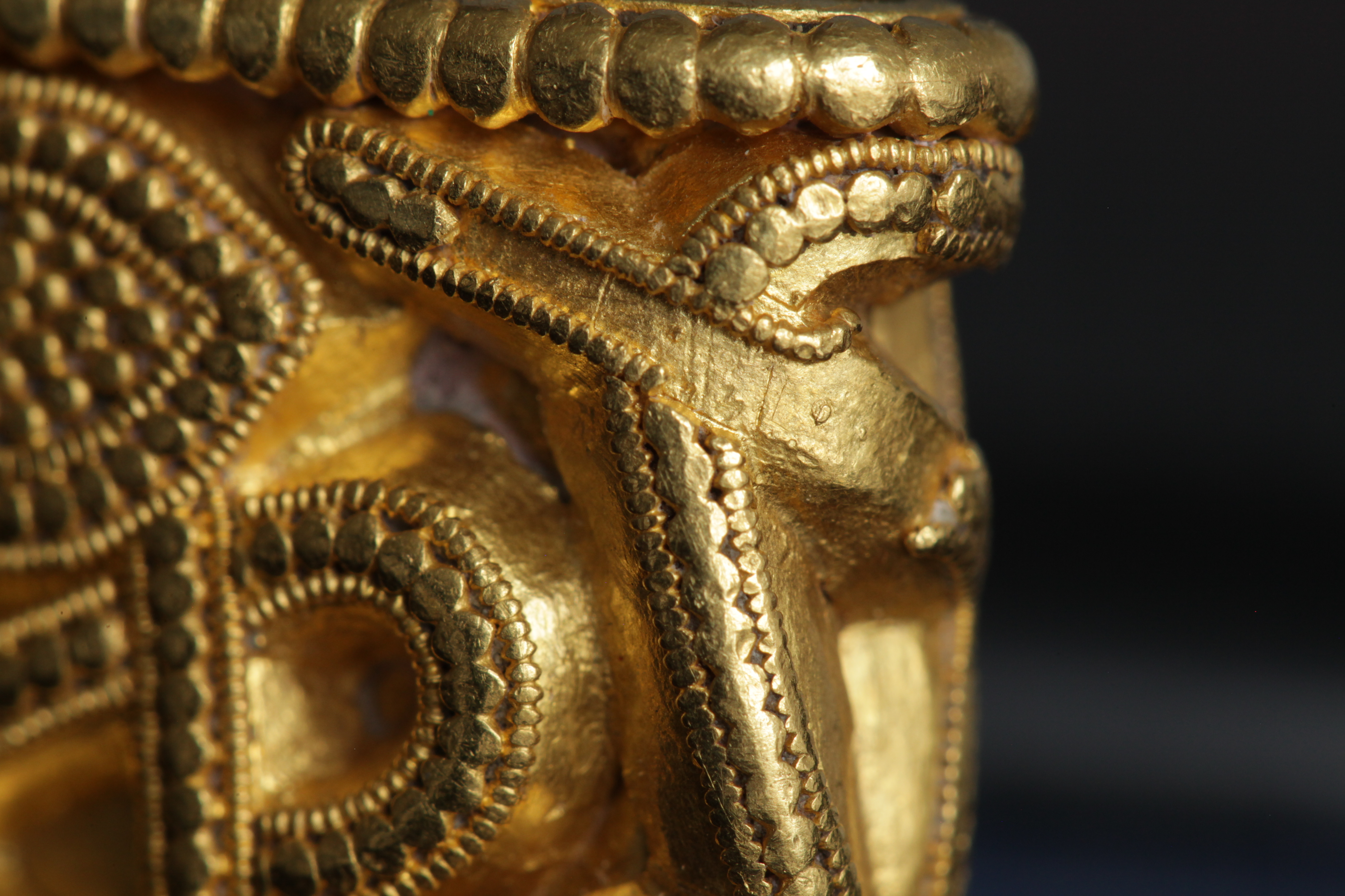 Svärdsslidebeslag av guld med filigransarbete.
