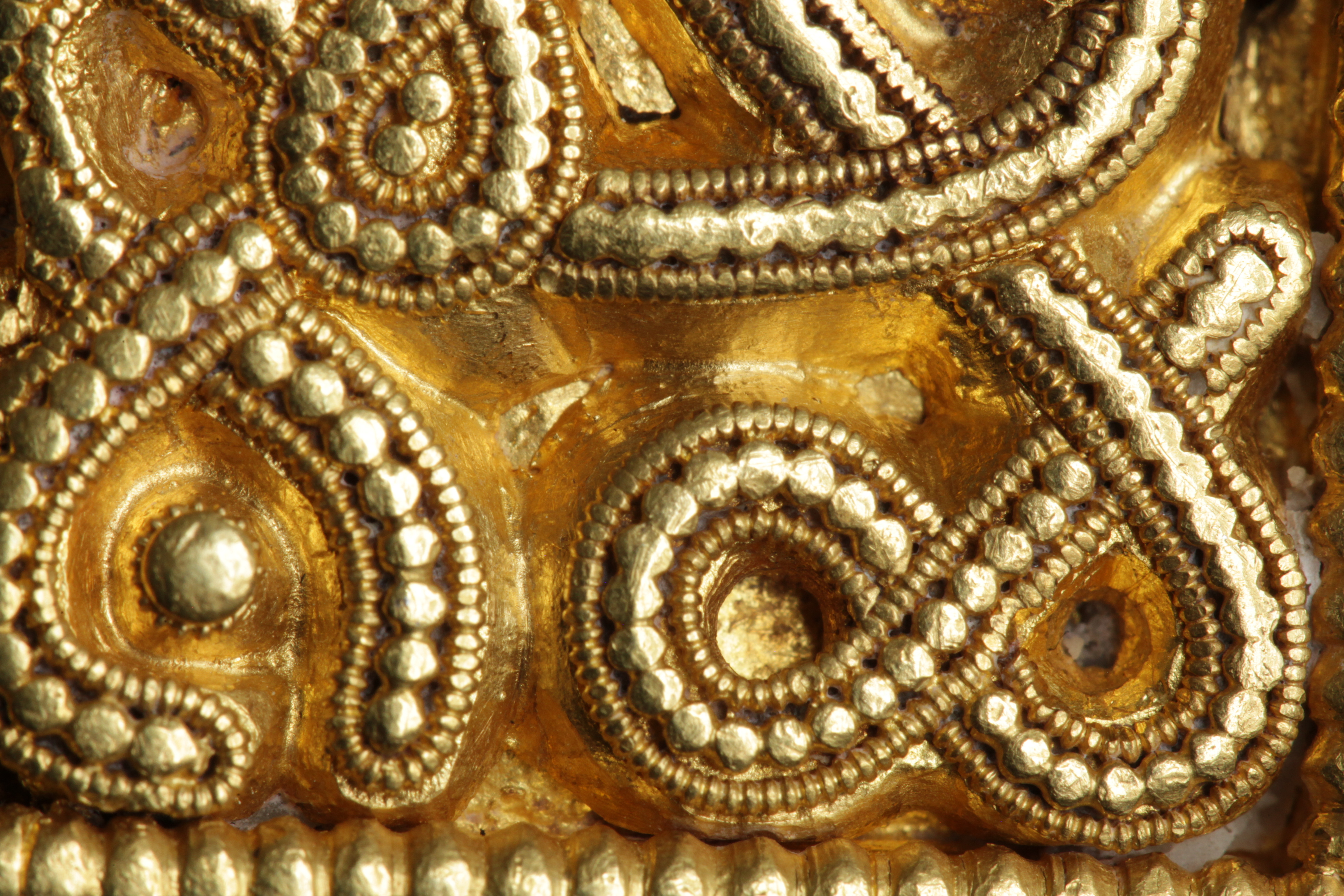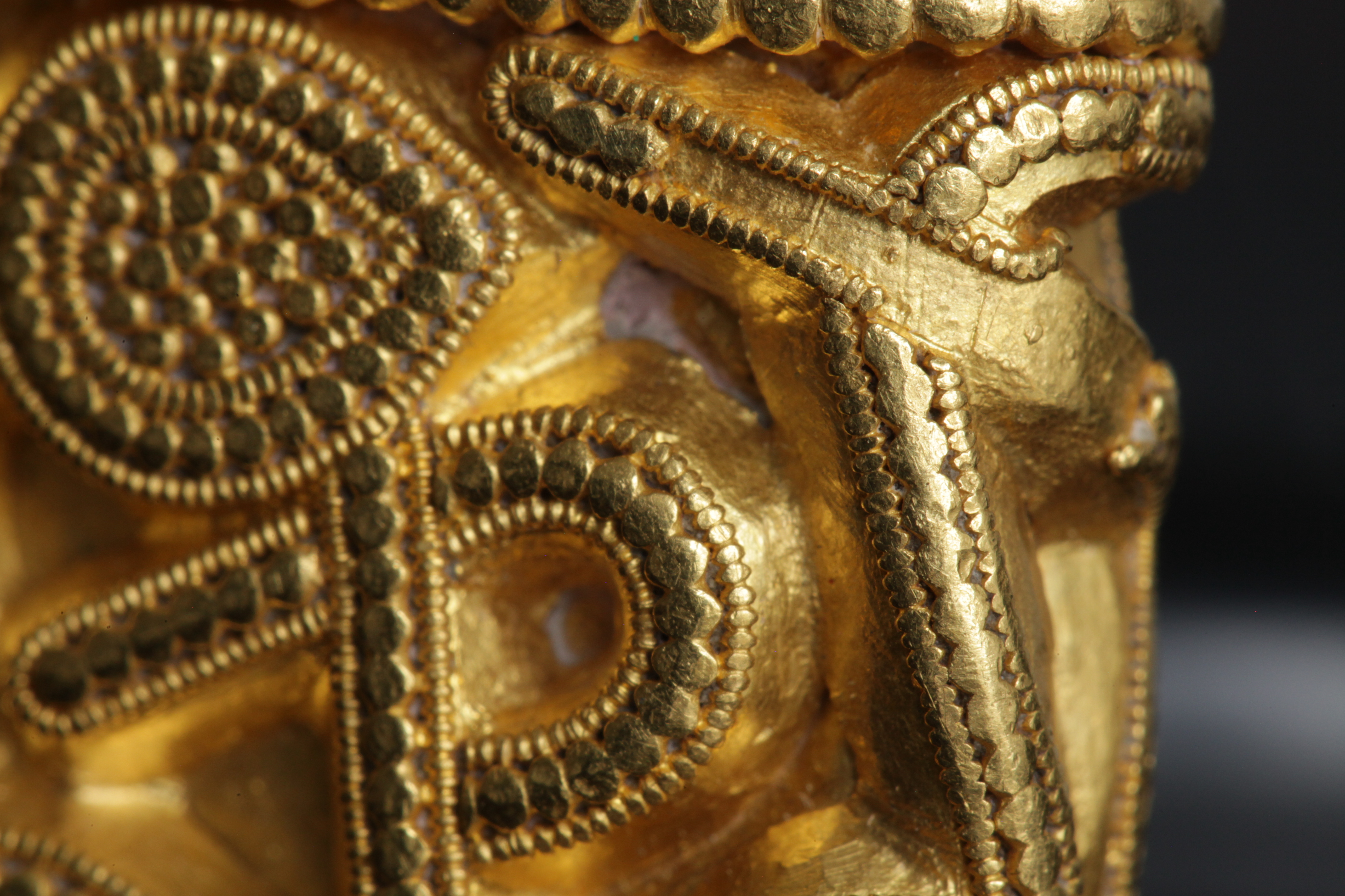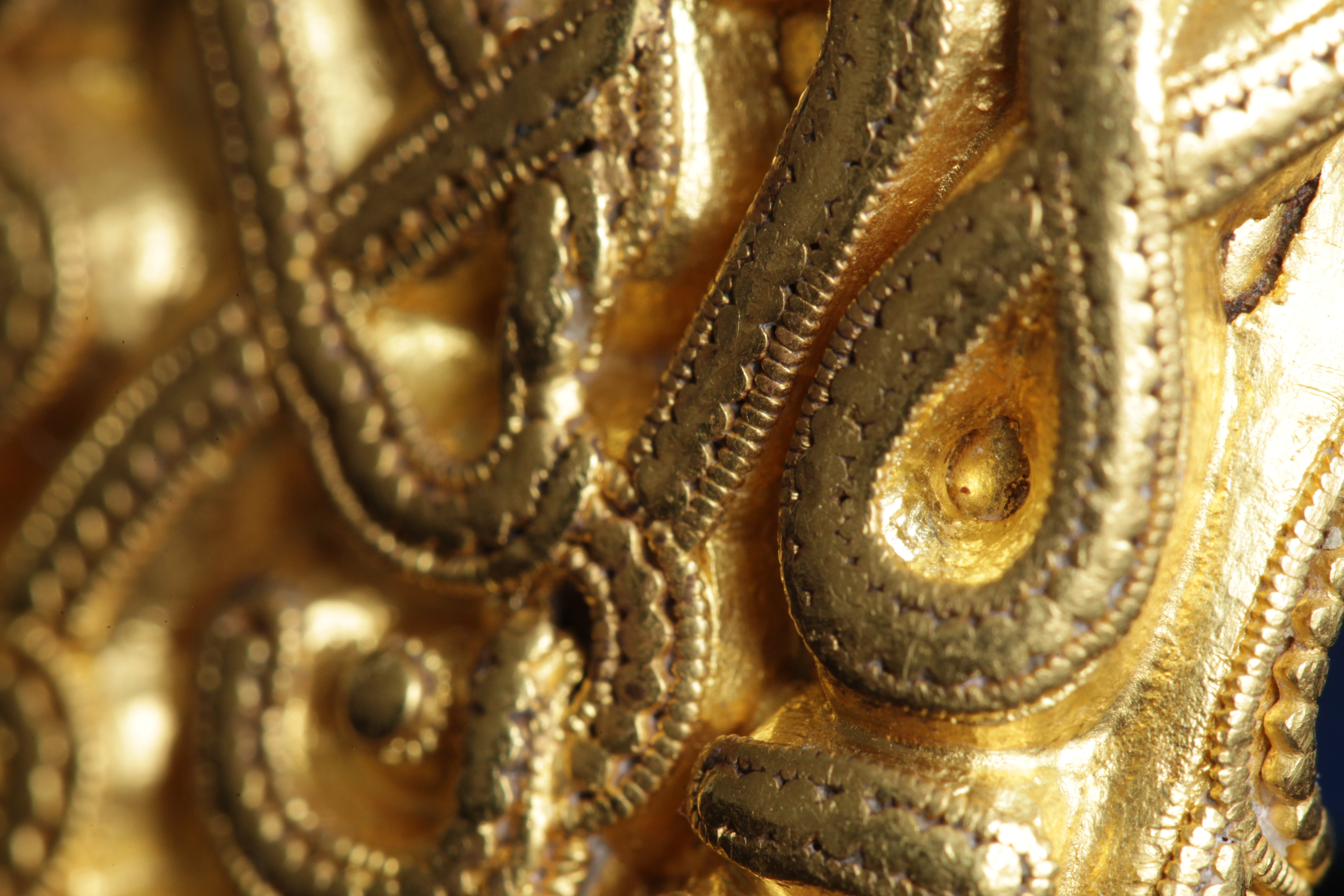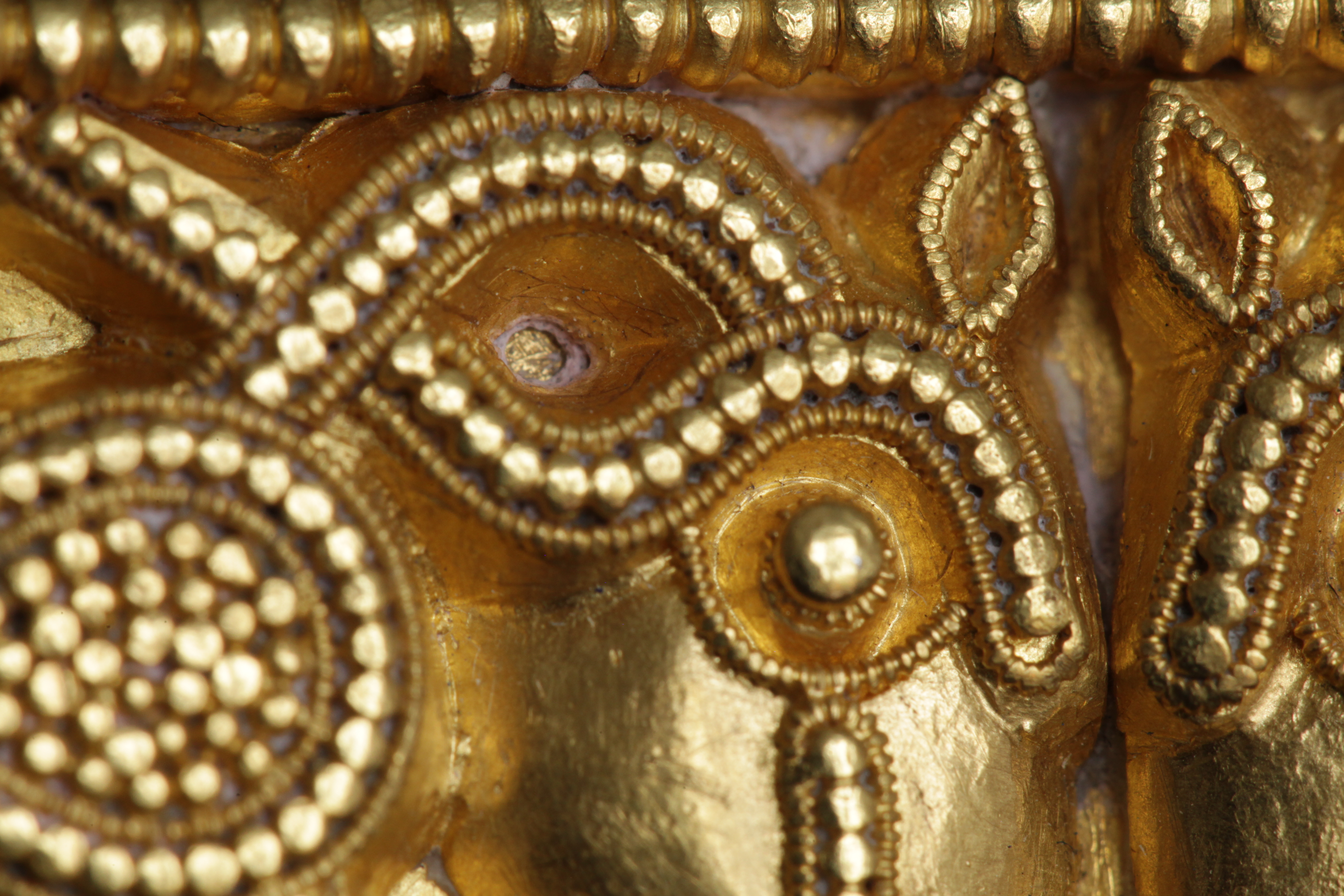Svärdsslidebeslag av guld med filigransarbete.