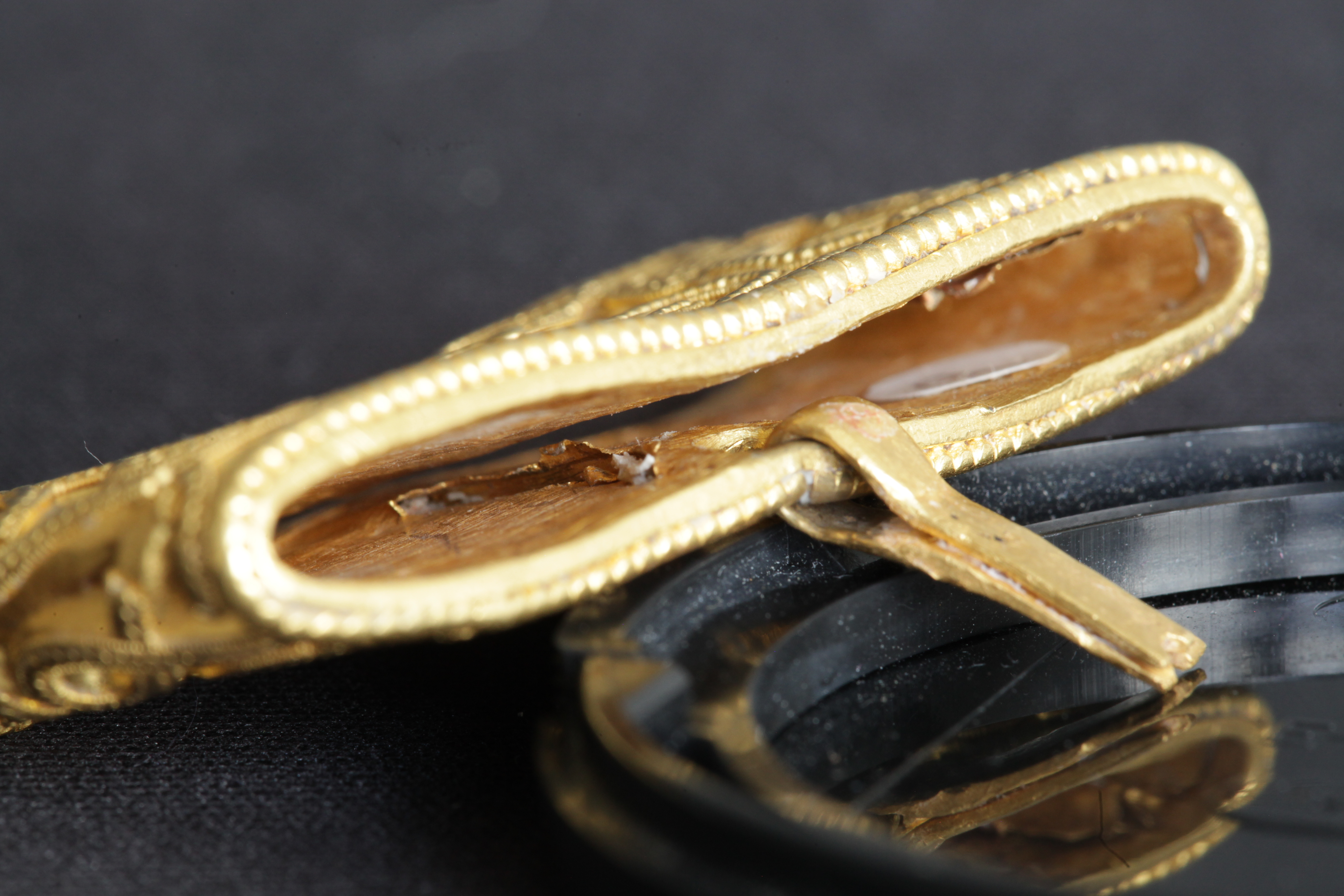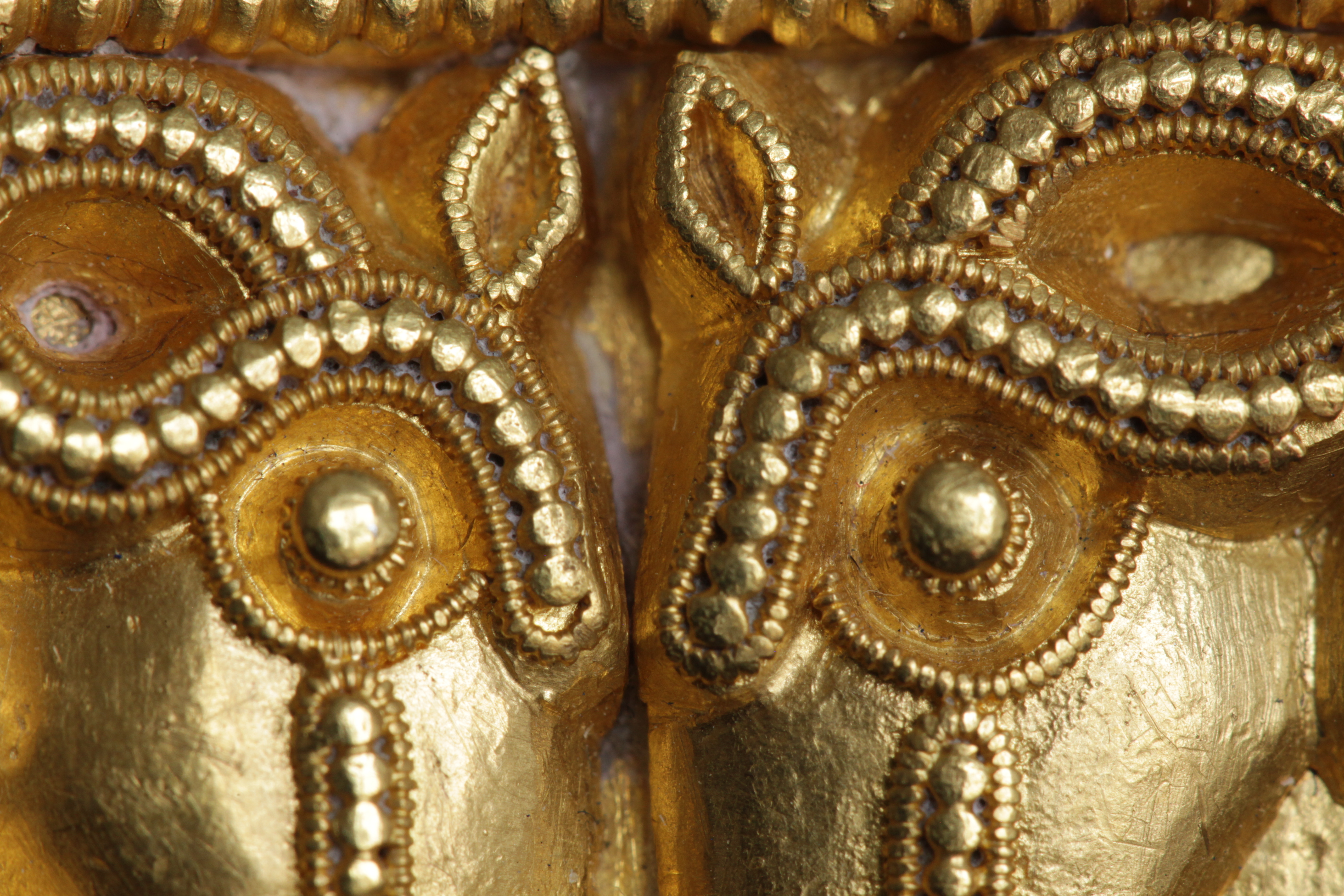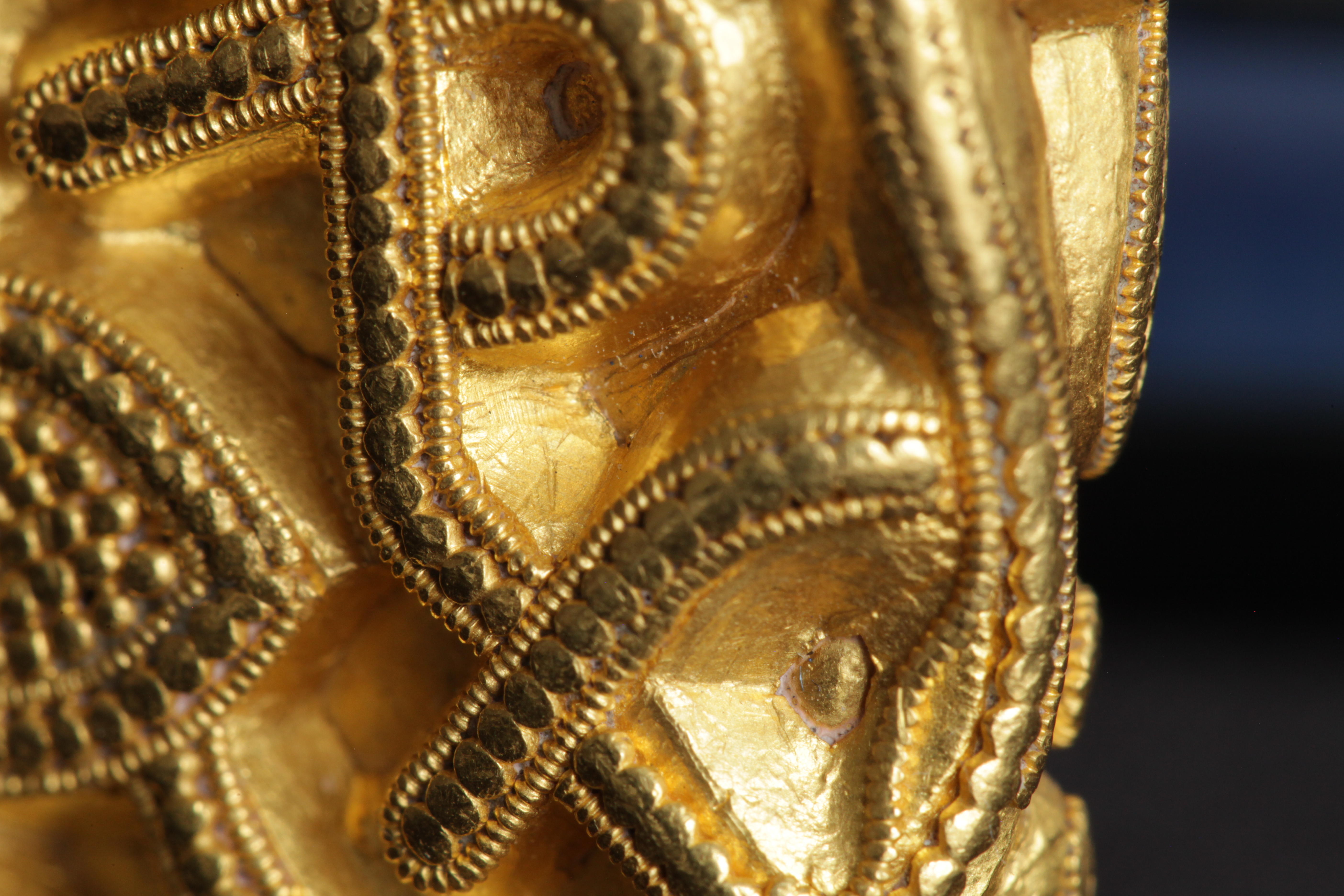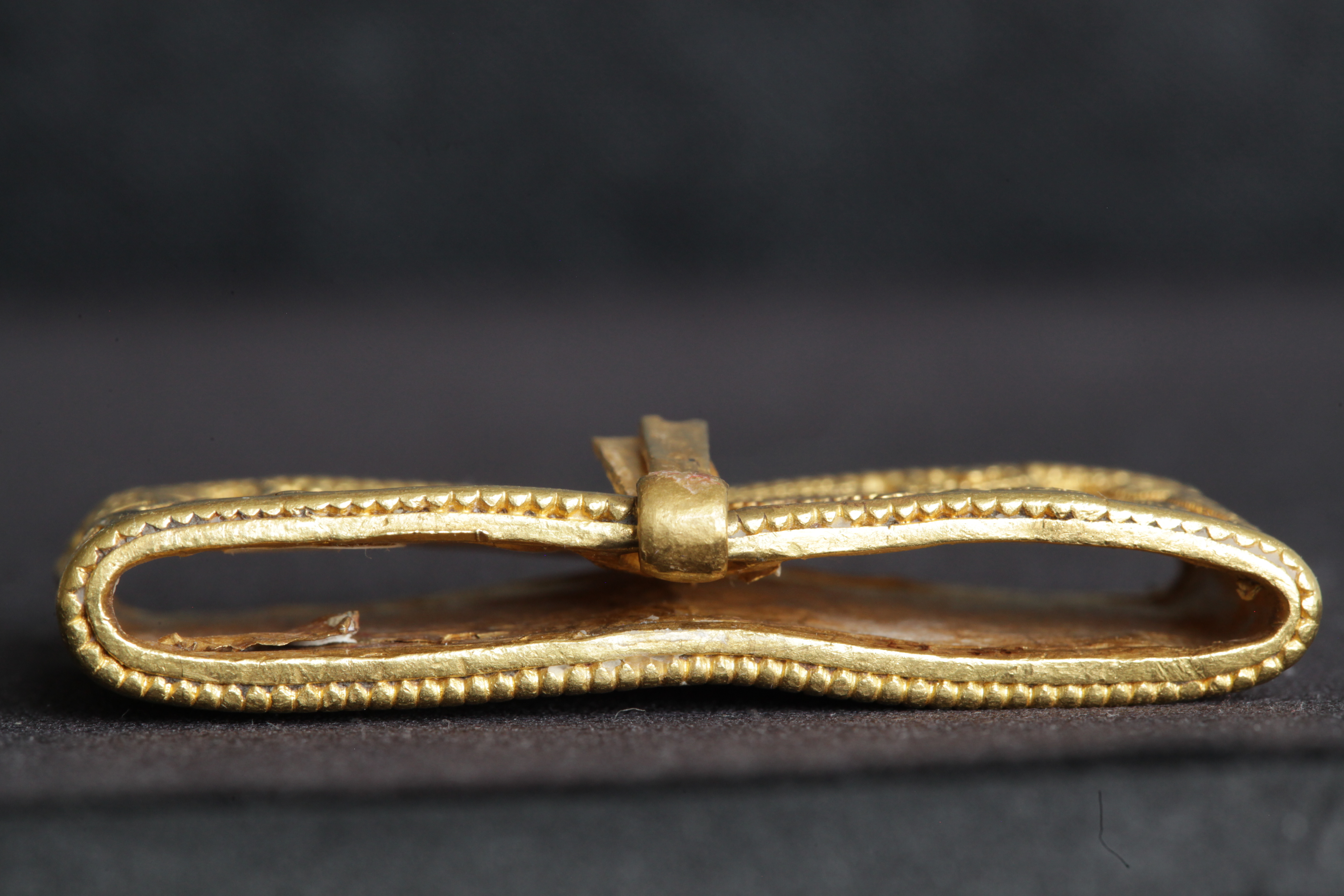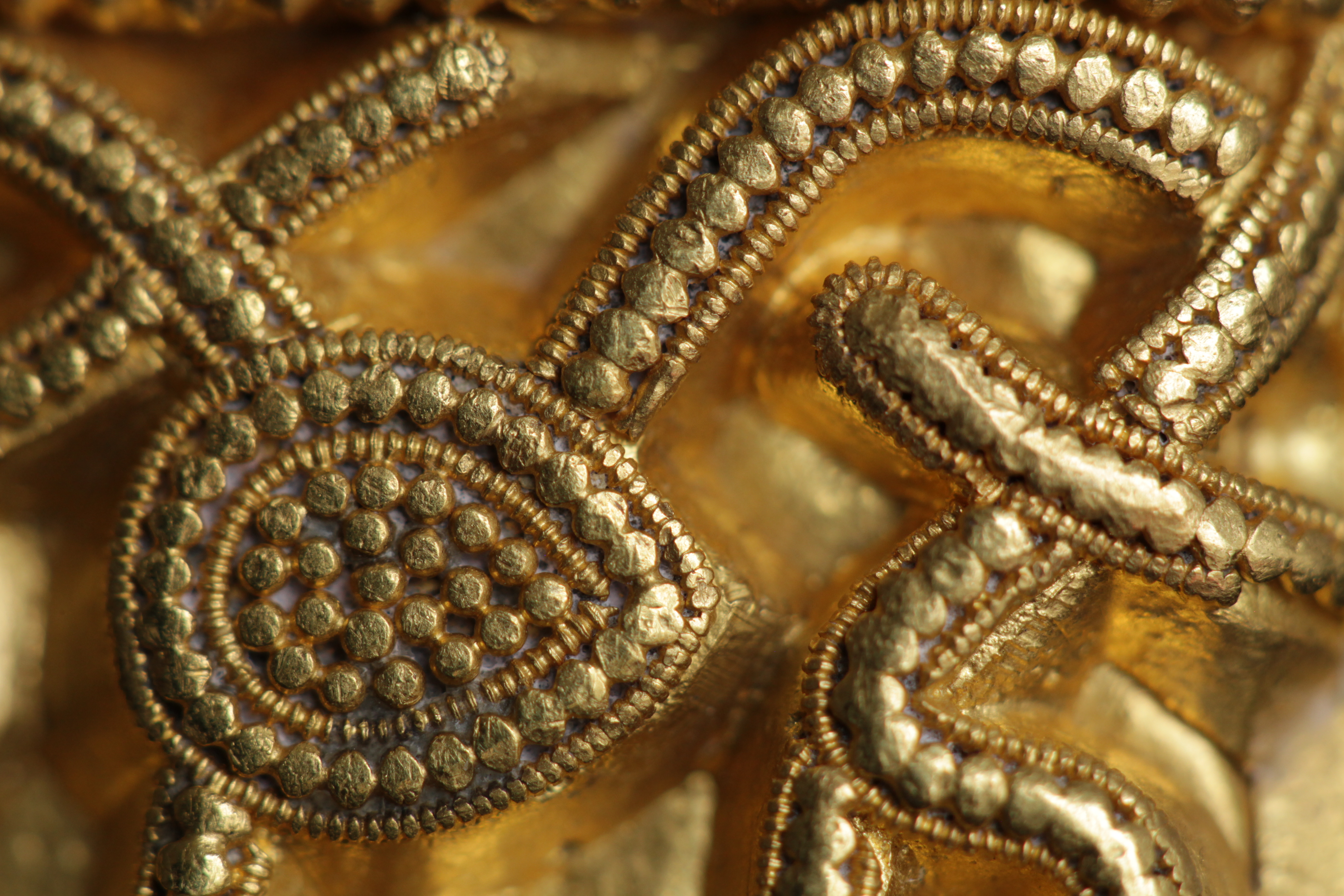 Svärdsslidebeslag av guld med filigransarbete.