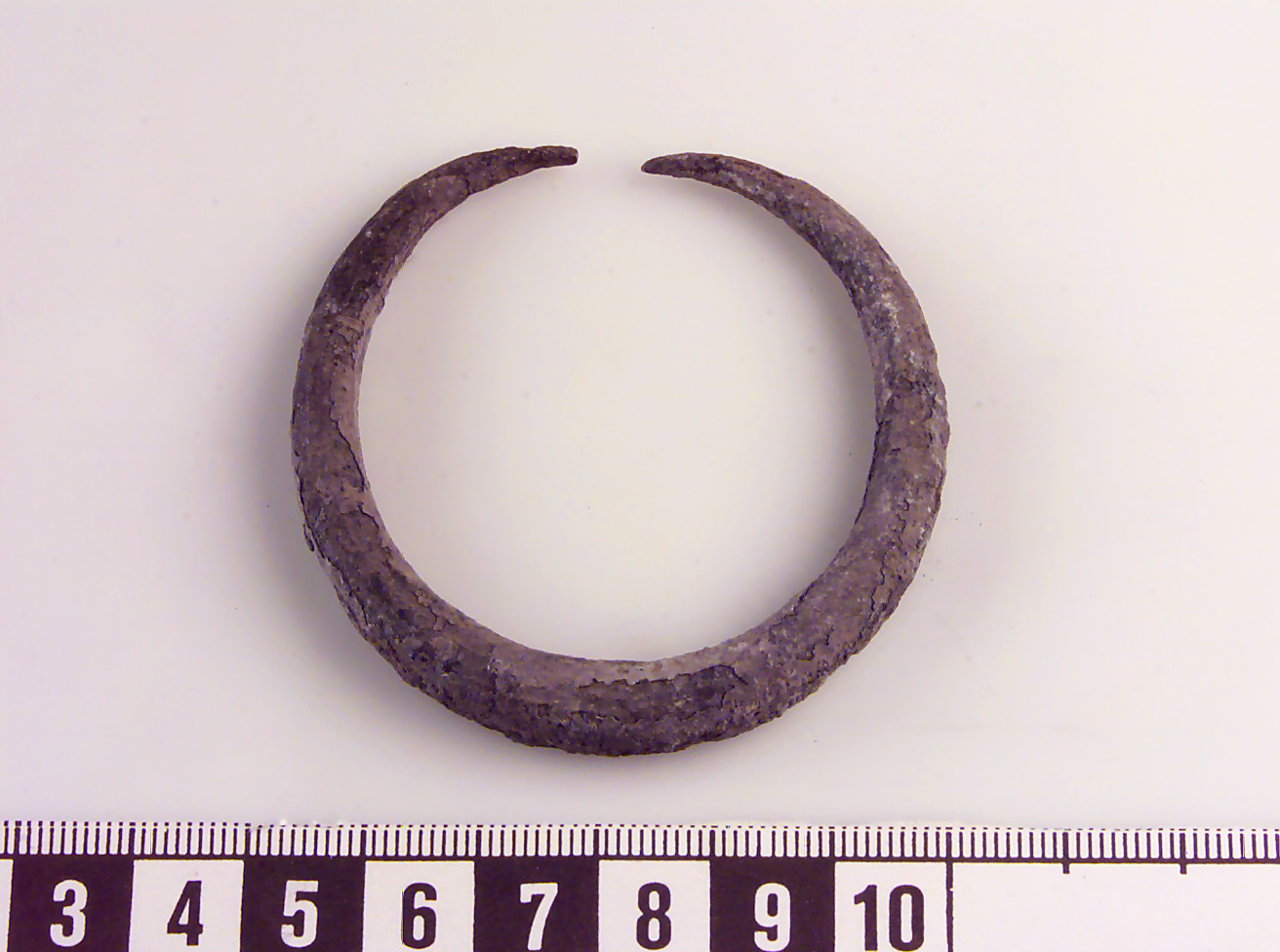 Av svagt mångkantig ten med avsmalnande, spetsiga ändar. Korroderat ytskikt. Spår av stämpelornamentik (trianglar?).