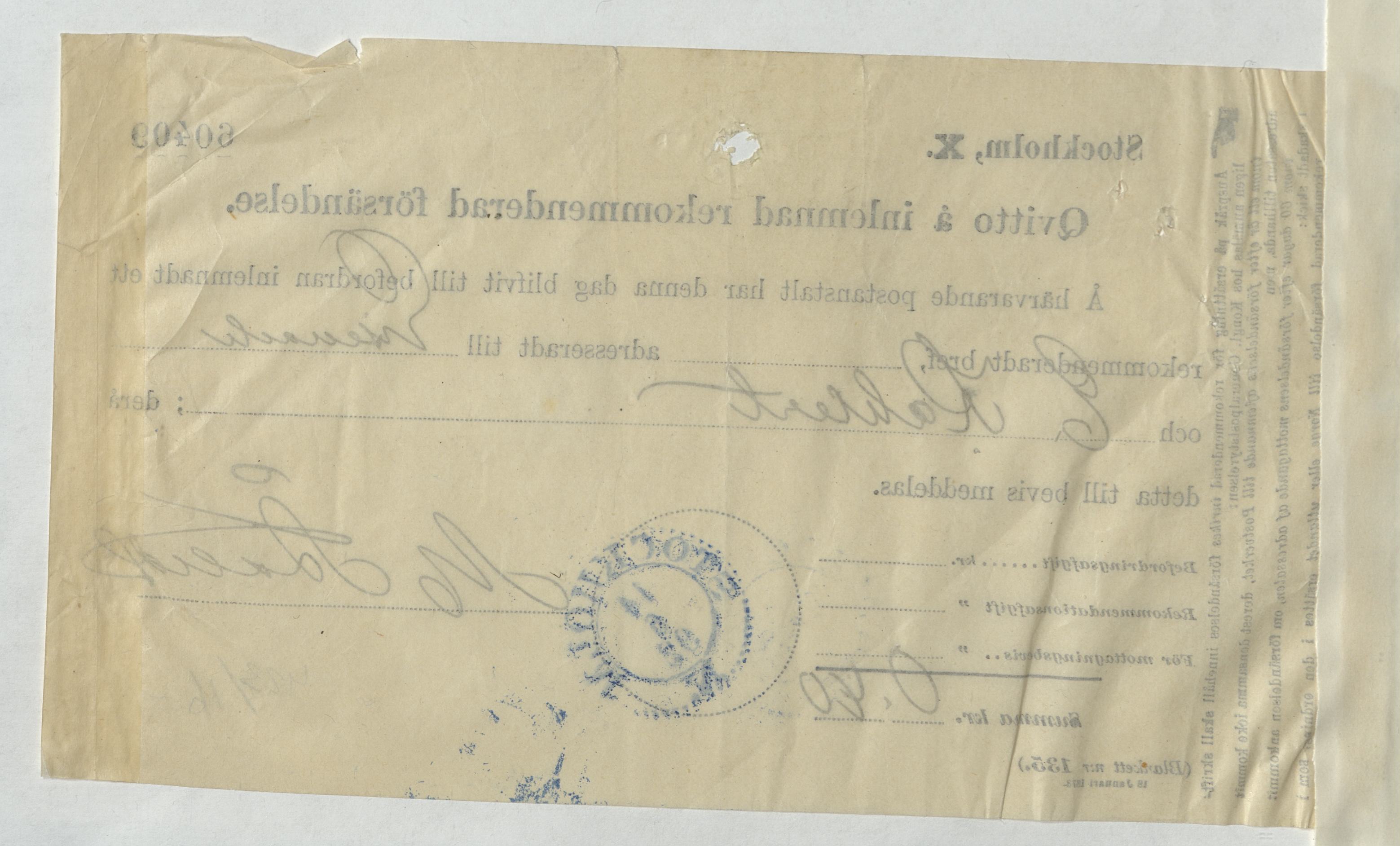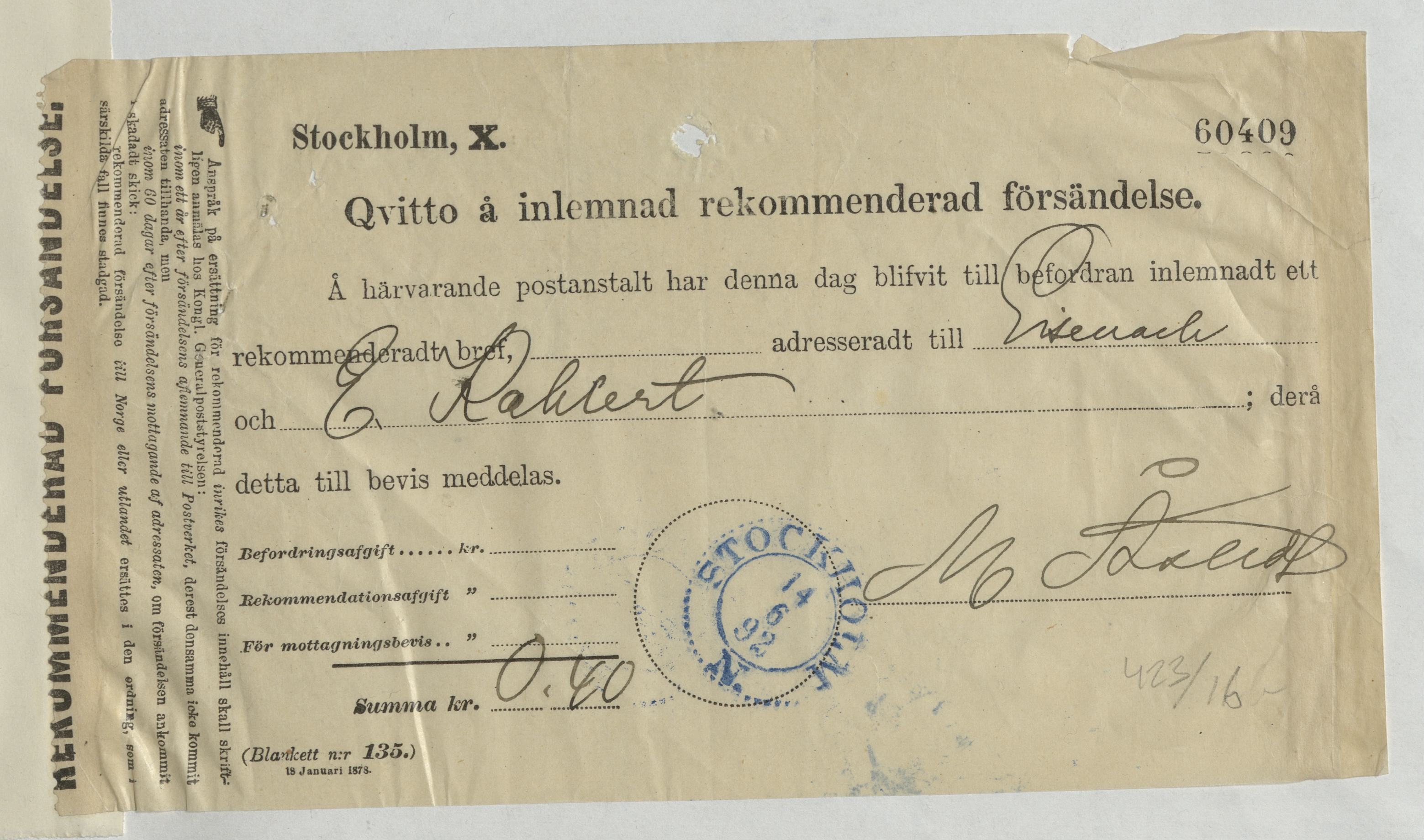 Kvitto för inlämnad rekommenderad försändelse gällande E. Kahlert