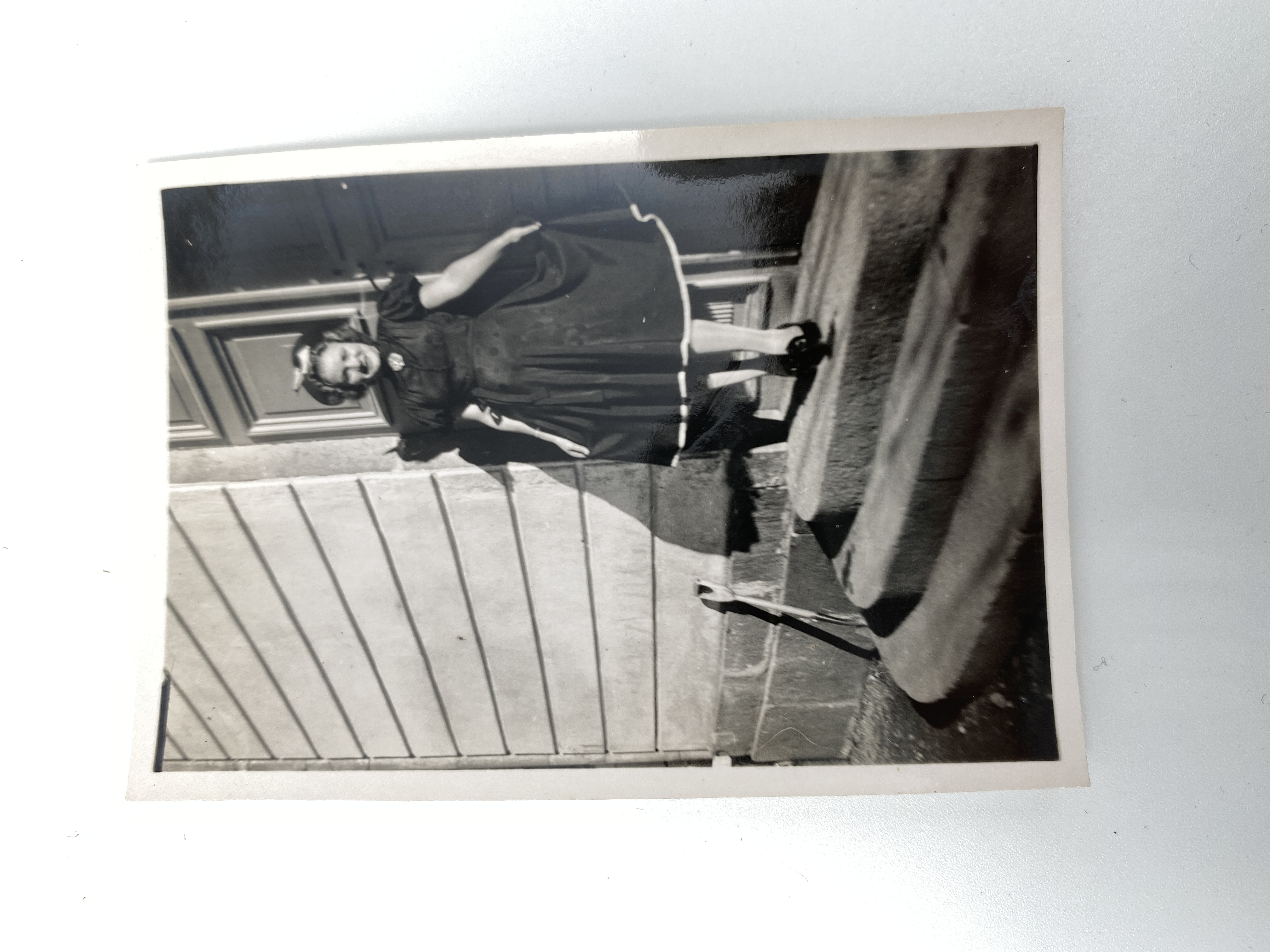 Svartvitt foto av en kvinna i utsträckt klänning ståendes på en trappa. Kan möjligtvis föreställa Lieselotte Haase.