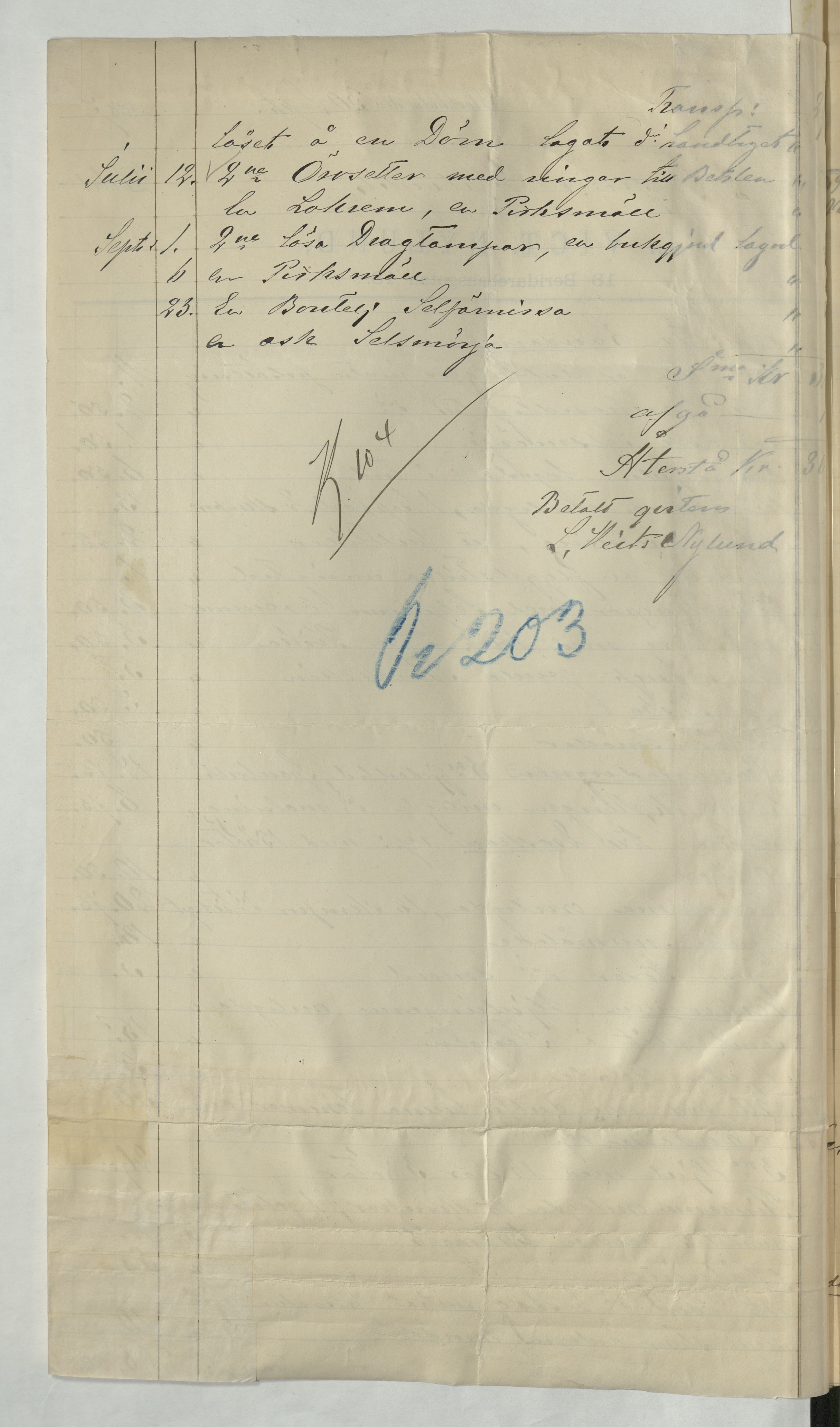 Kvitto från Victor L. Nylund, Sadelmakare, på en summa av 296:50Kr. Stockholm, 1887.