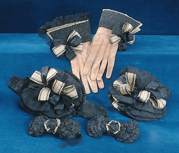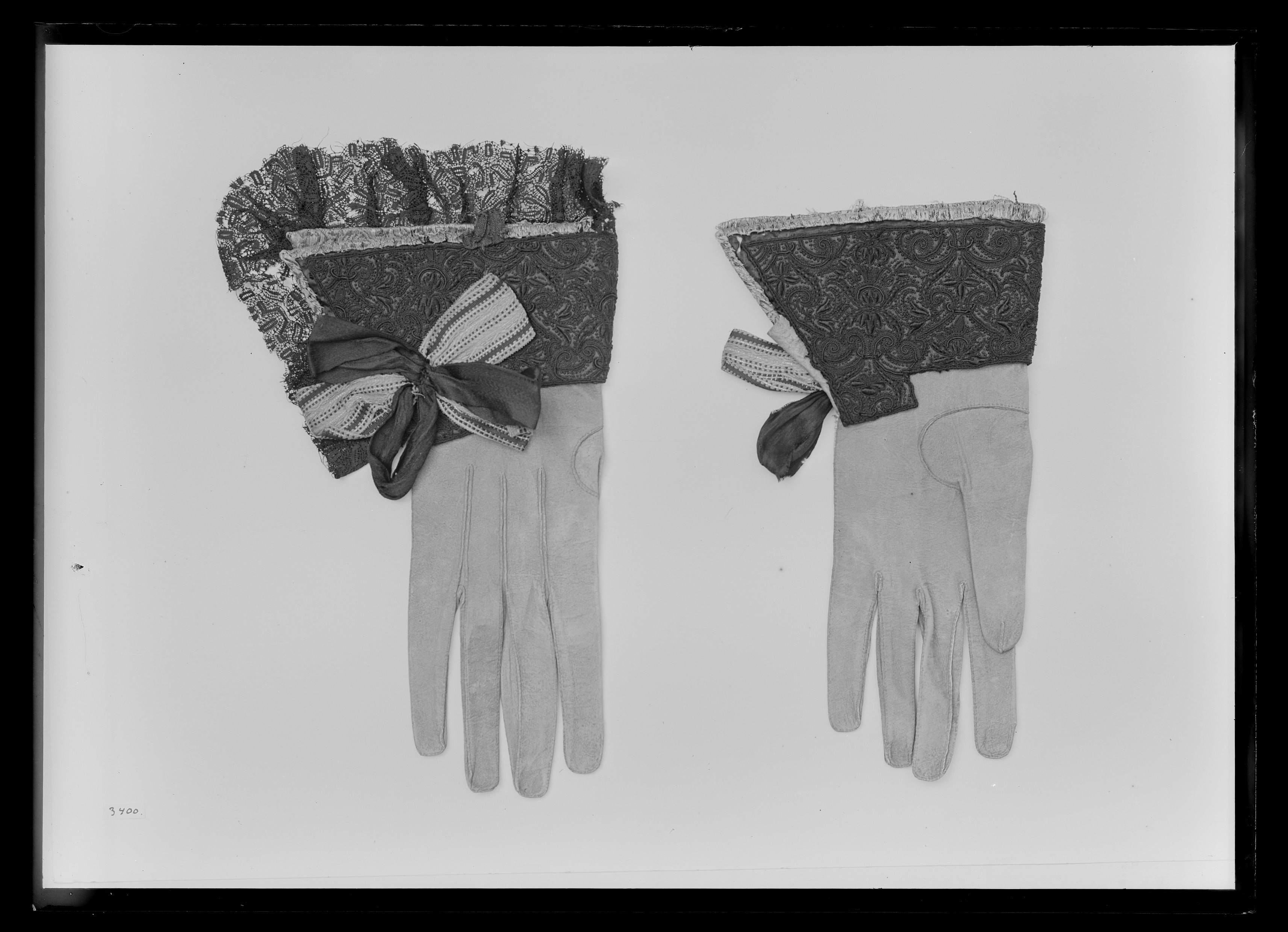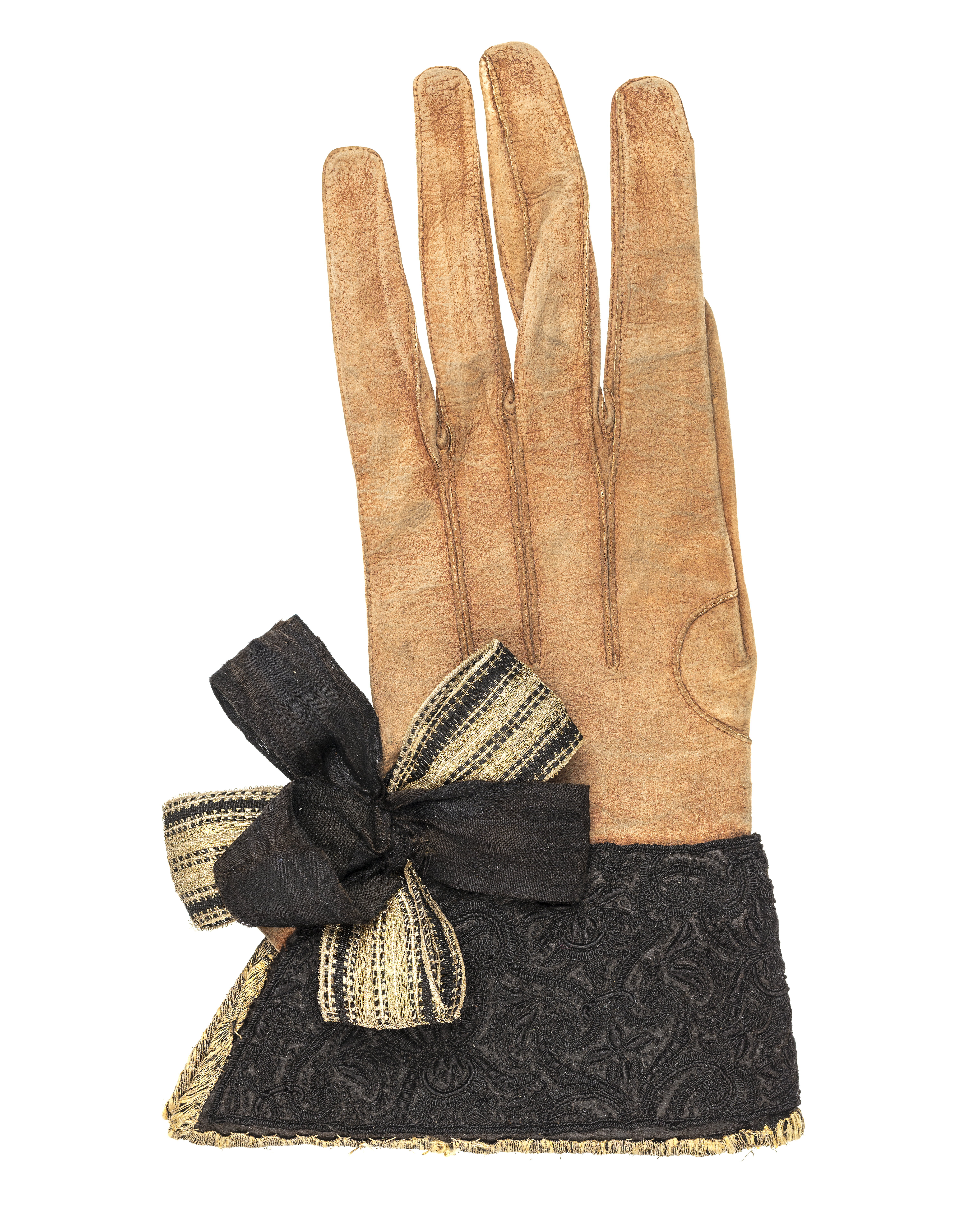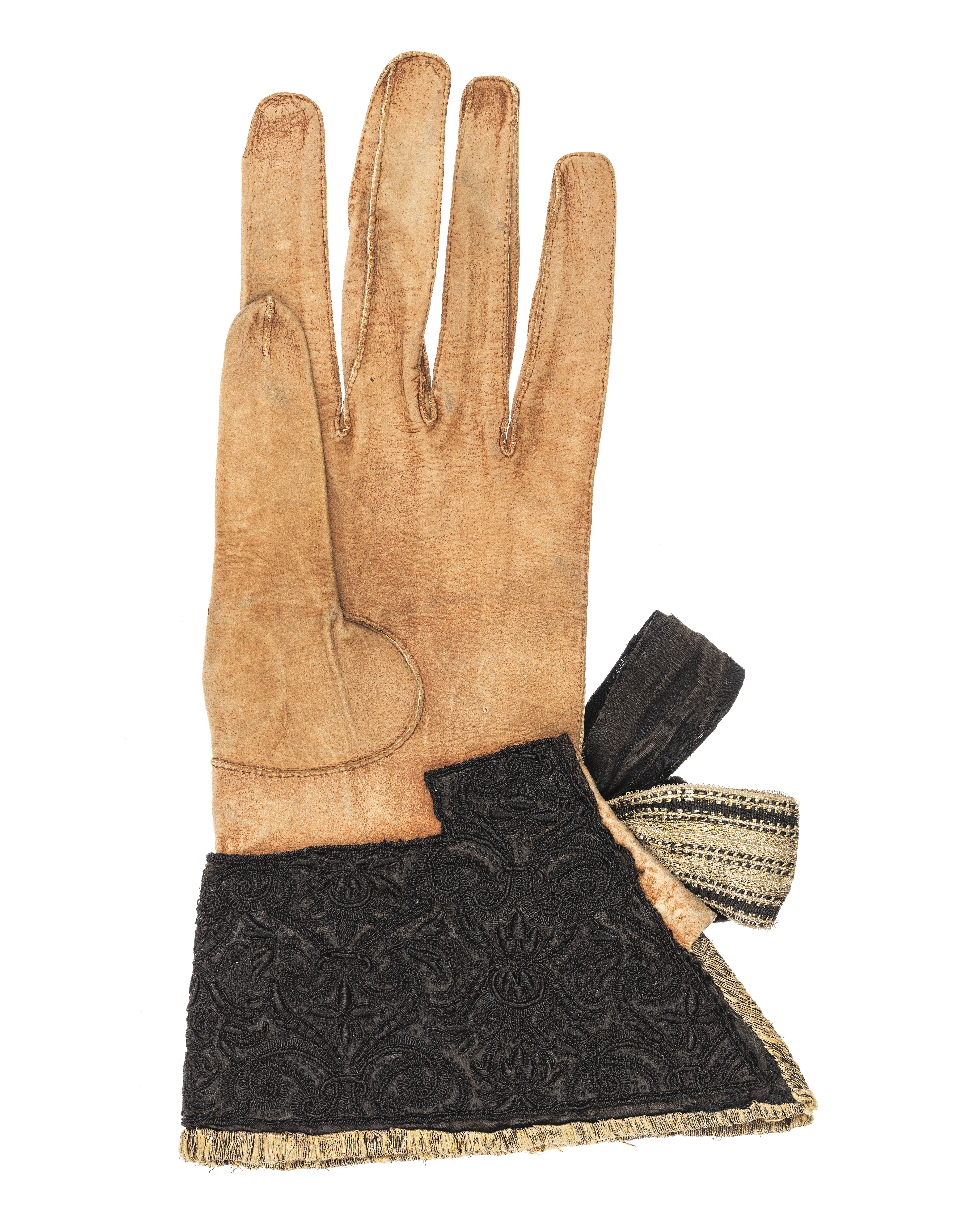 Handske med krage broderad med svart silke. Vid kragens sprund finns en rosett som består av totalt 6 stycken öglor: 3 öglor av svart atlas samt 3 öglor av metalltrådsband. Kragen är fodrad med guldbrokad av samma slag som kappans foder (se inv.nr 19297). Själva handsken är av brunt sämskat skinn med långa fingrar och ryggsidans fingersömmar långt neddragna. Handskar inv.nr 21039 och 21040 hör ihop och ugör tillsammans ett par. Handskarna finns nämnda för första gången 1654 i Klädkammarens räkenskaper. De beställdes från Frankrike 1654 genom Magnus Gabriel De la Gardie för Karl X Gustav inför dennes kröning och därefter följande bröllop. Ändringar av Friderich Feuerbrun. Det var troligen denna dräkt som bars av Karl X Gustav under ceremonien då drottning Kristina avsade sig kronan.