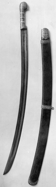 Balja klädd med svart läder, upptill avsmalnande. Beslag av silver med rankdekor i niello mot bakgrund av tätt graverat sicksackmönster. Munbleck, b: 59 mm, med rundad nederkant, därnedanför bandformigt beslag, b: 17 mm med bygel på baksidan. Mellanbeslag med koppelring på eggsidan, b: 16 mm. Rundad doppsko, b: 18mm. Museinämndens protokoll 1870-10-10, gåva av Konung Karl XV enligt gåvobrev av den 20 september 1870.