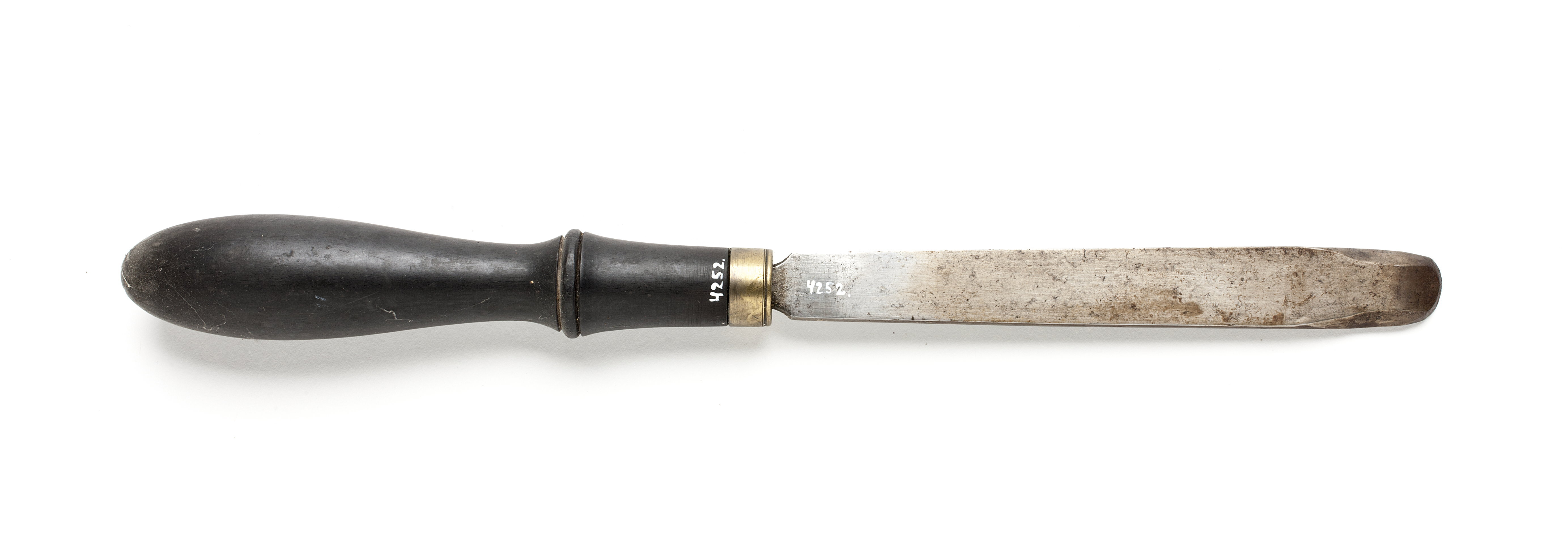 Klinga med rektangulär genomskärning. Rund. något uppåtböjd egg, slarvigt slipad. Svarvat skaft av ebenholts med en vulst. Mässingsring. Stämplat på stålet: kugghjul med åtta kuggar