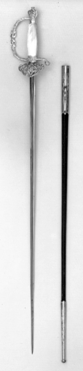 Fäste av förgylld mässing.Knapp, hjärtformig med gjutet och graverat harnesk och hjälm. Plan, rund nitknapp. Handbygeln intappad i knappen. Graverad och punsad reliefdekor i form av blommor och voluter samt på dess mitt ansvällningar i form av motställda lyror. Genombruten yttre parerplåt, nedåtböjd med vågig kontur. I centrum svenska riksvapnet med tre kronor och Bernadotte-hjärtvapnet, sköldhållare lejon. Nedåtböjd, bakre parerstång med kulformig ytterände med graverad dekor. Inre, smal parerplåt med graverade slingor. Rektangulär kavel med förgyllda smalsidor av mässing med graverade rankor och blommor. Bredsidorna av pärlemor med smala kantlinjer. Stukatklinga av stål utan ornering.