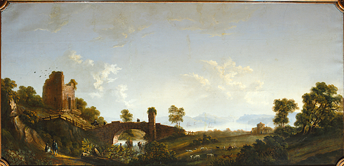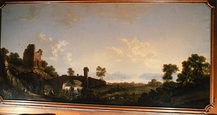 De båda landskapsscenerna (inv nr A.a.01. (I) - A.a.01.(III ) är målade antingen efter original utförda av den österrikiske landskapsmålaren Johann Christian Brandt ( 1722 - 95 ), eller troligare efter gravyrer efter dessa original utförda av Adrian Zingg (1734 - 1816 ). (Exemplar av gravyrerna finns i Hallwylska samlingen, B. c. 10 och B. c. II ) Inv.nr A.a.01. (I) - A.a.01.(III ) utförda av samme konstnär. --*-- These two landscape scenes (inv nr A.a.01. (I) - A.a.01.(III ) were painted either after originals by the Austrian landscape artist Johann Christian Brandt (1722 - 1795) or, more probably, after engravings by Adrian Zingg (1734 - 1816 ) from these originals. (Copies of the engravings are in the Hallwyl Collection, B.c. 10 and B.c. II.) Inventory nos. A.a.01. (I) - A.a.01.(III ) by the same artist. Inv.nr. A.a.01. (I) - A.a.01.(III ) utförda av samme konstnär. -*- Inventory nos. A.a.01. (I) - A.a.01.(III ) by the same artist.