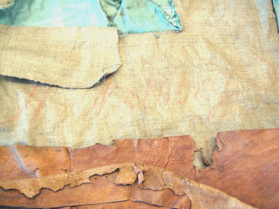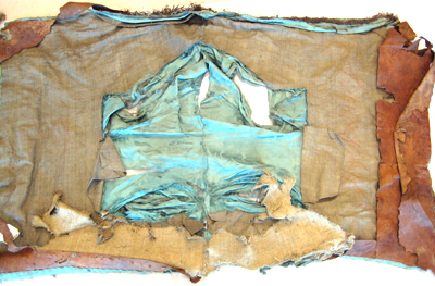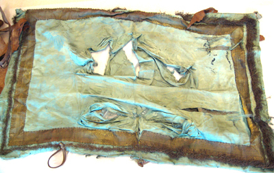 Rektangulärt sadelöverdrag av blå sidendamast, formsytt och med en ryggsöm. Överdraget garneras av en bred guldgalon, b. 70 mm, av förgylld koppartråd och förgyllda kopparlan. Runtom kantas sadelöverdaget av en drejad frans av förgylld koppartråd, l. 40 mm. Sadelöverdraget är på baksidan fodrat med grov gråbeige säckväv.