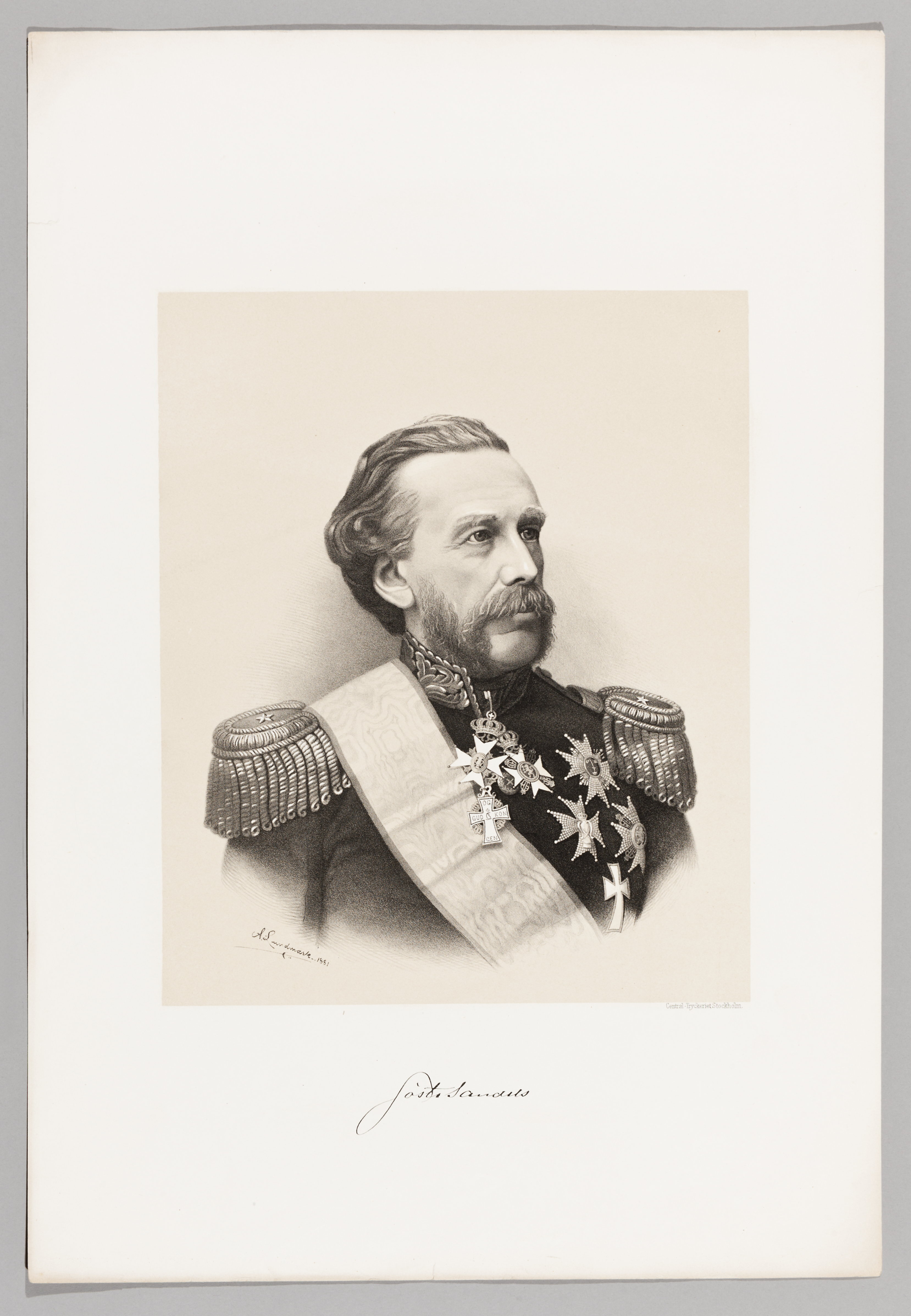 Bröstbild, kroppen en face, huvudet åt höger. Klädd i uniform. Ordnar, ordensband. Nedtill t v på bilden: "A. Lundmark. 1881". Under bilden: "Central-Tryckeriet. Stockholm" samt "Gösta Sandels".