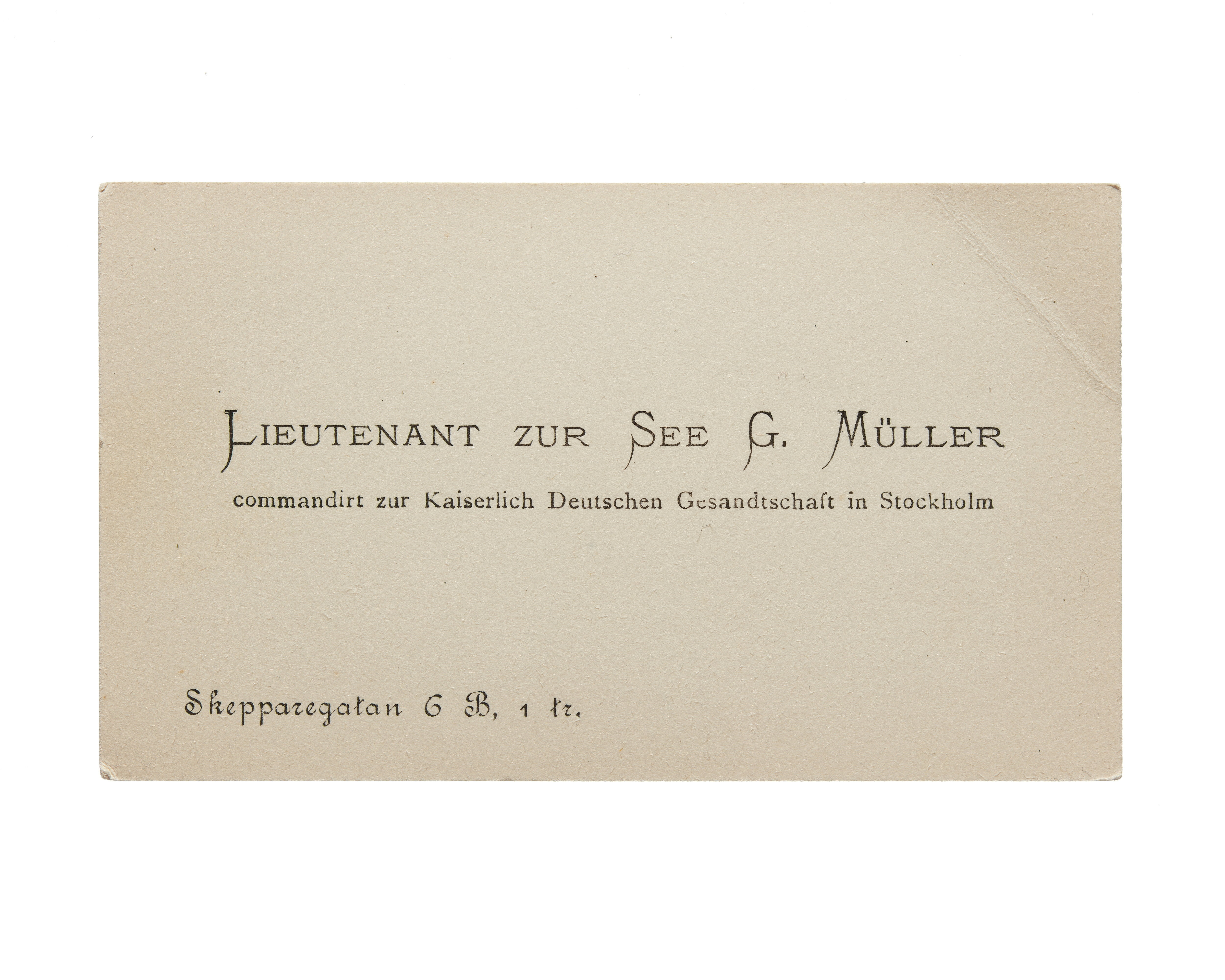 Ett visitkort från Lieutenant zur See G. Müller, commandirt zur Kaiserlich Deutschen Gesandtschaft in Stockholm, utan datum, vikt i övre högra hörnet. Adress (nedre vänstra hörnet) Skepparegatan C B, 1 tr.