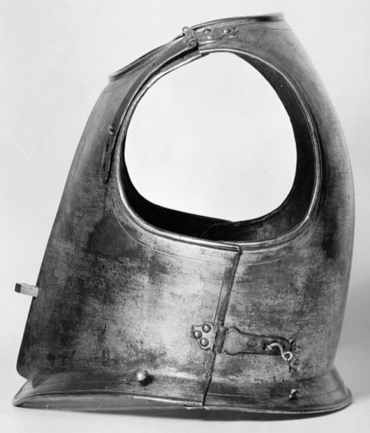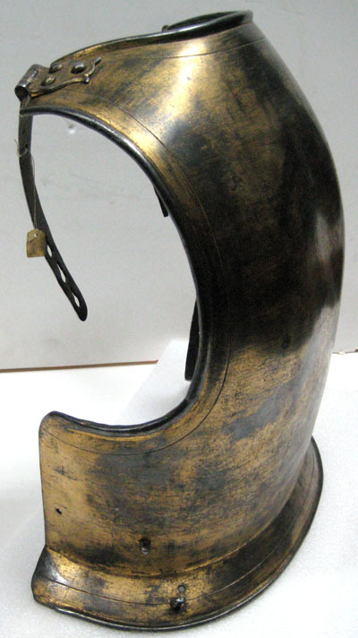 bröstharnesk med 2:ne sleifer af jern och jernhylsor, deraf 4 för tornerhaken och en för förstärkningsharneskets fästande