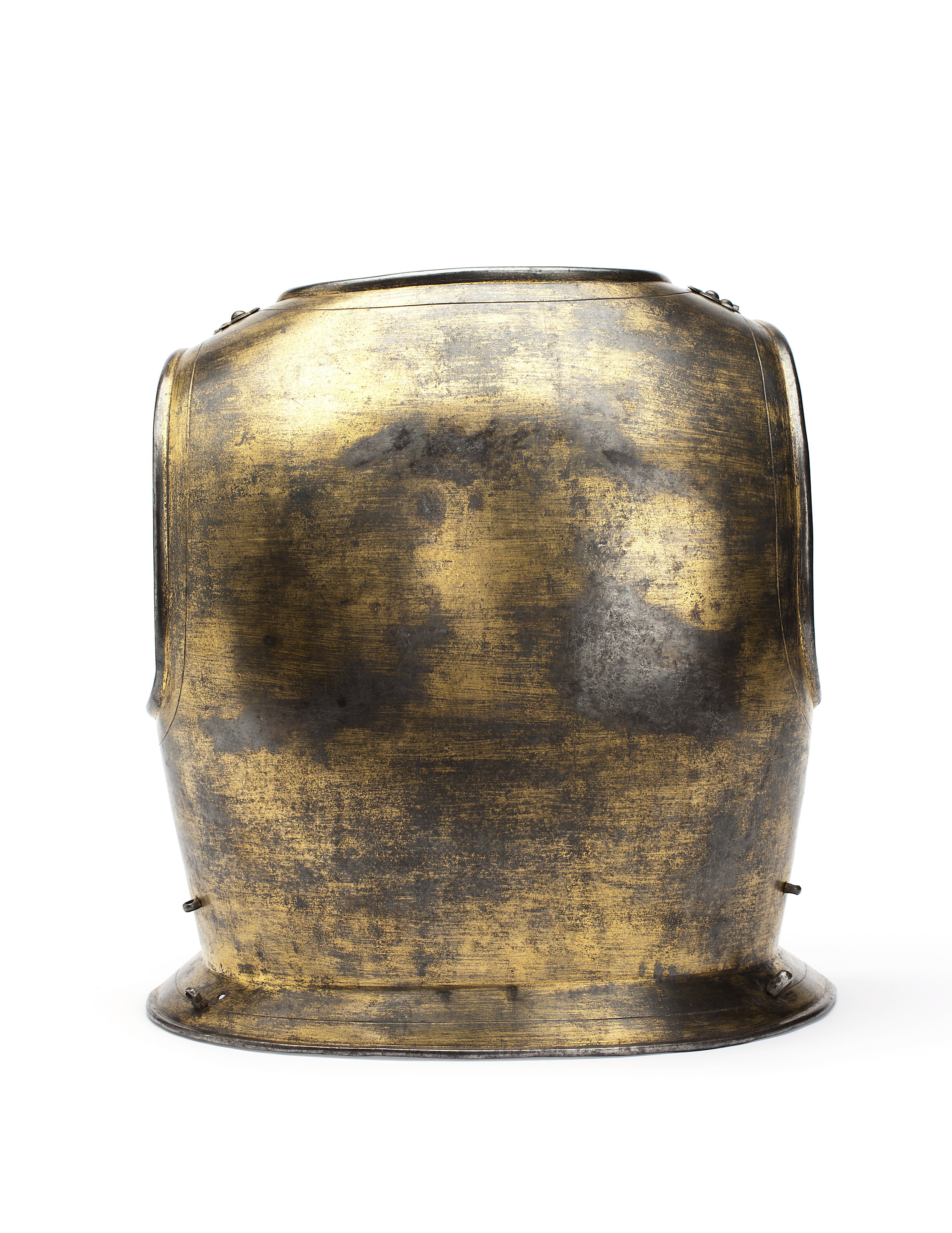Ryggharnesk, del av Hertig Karl Filips tornérrustning. Anskaffad av Louis de Geer och möjligen slagen i dennes faktori i Norrköping. Förgylld av Charles Dartné i Haag och levererad till Stockholm 1624.