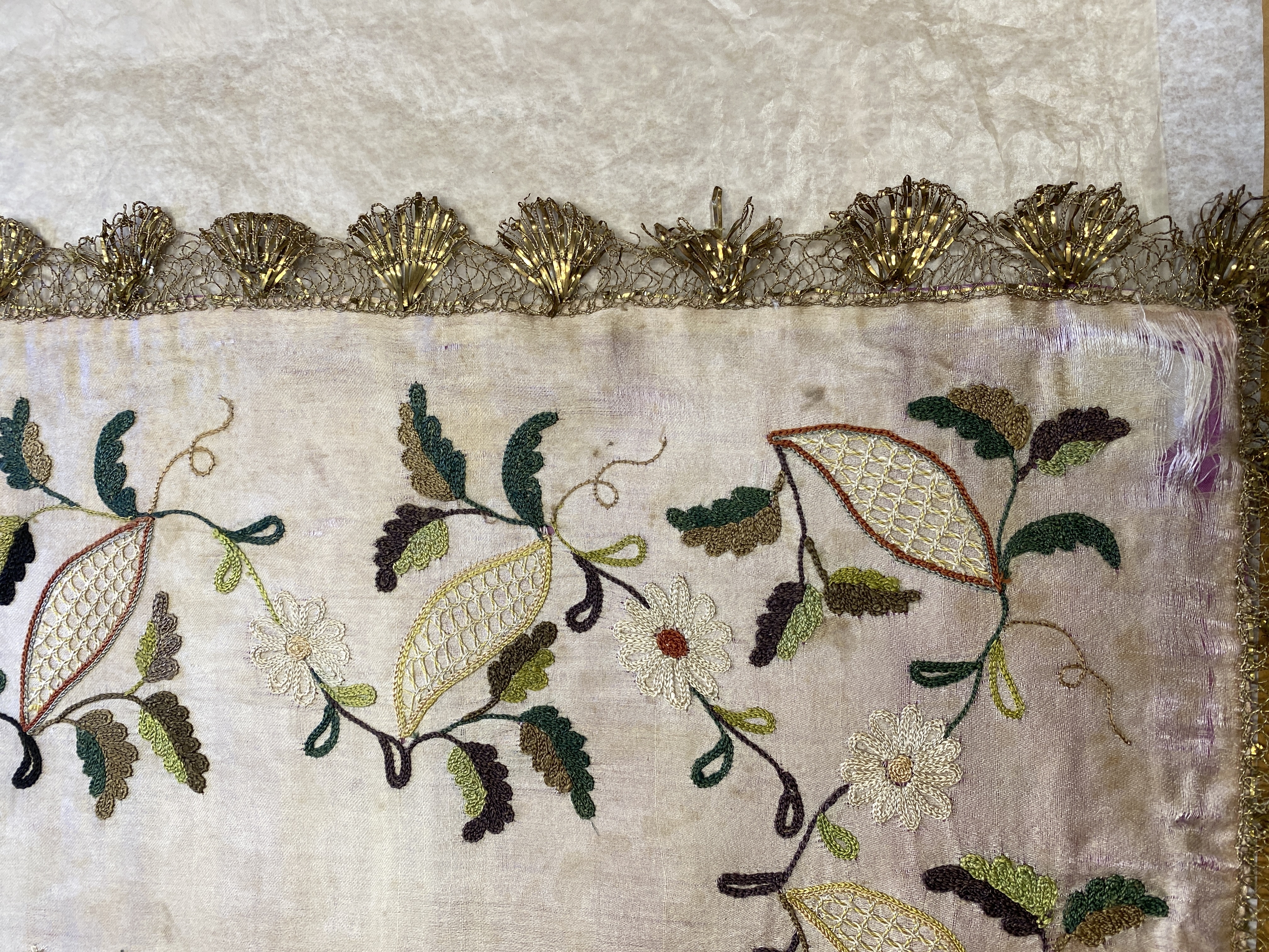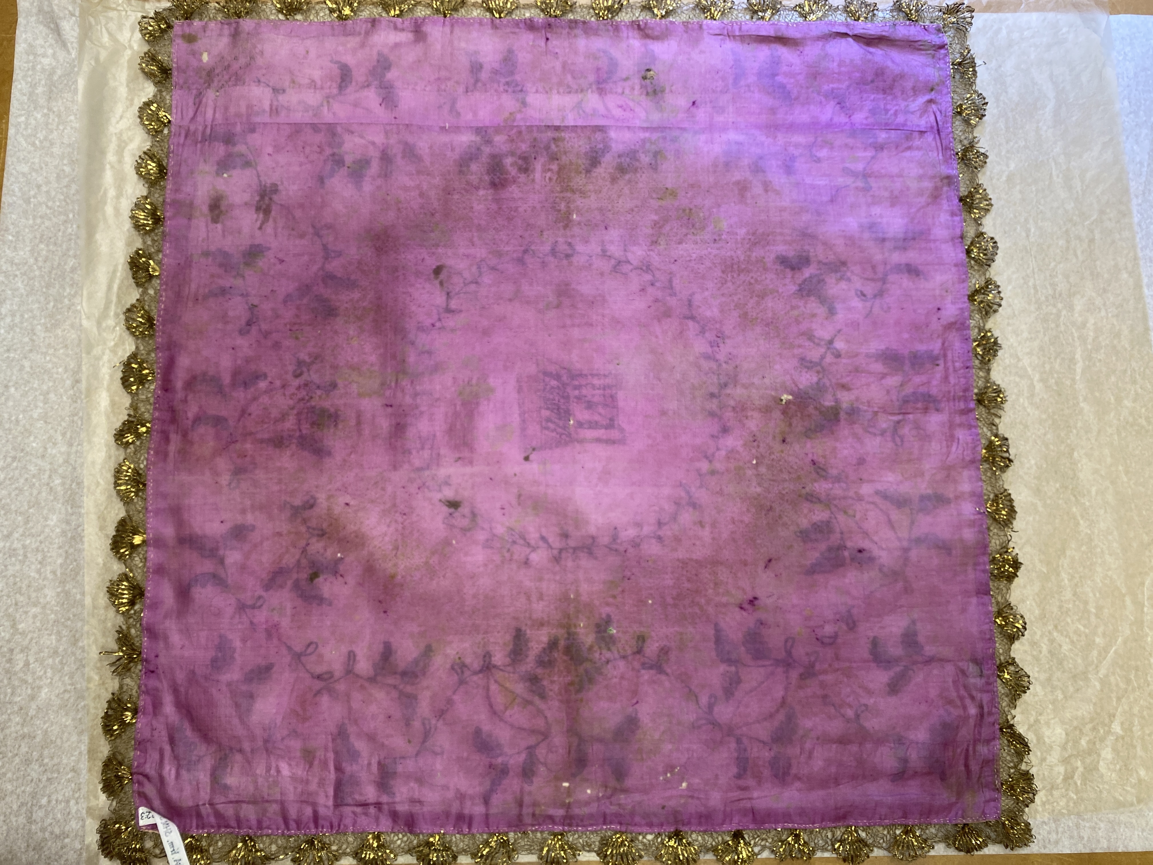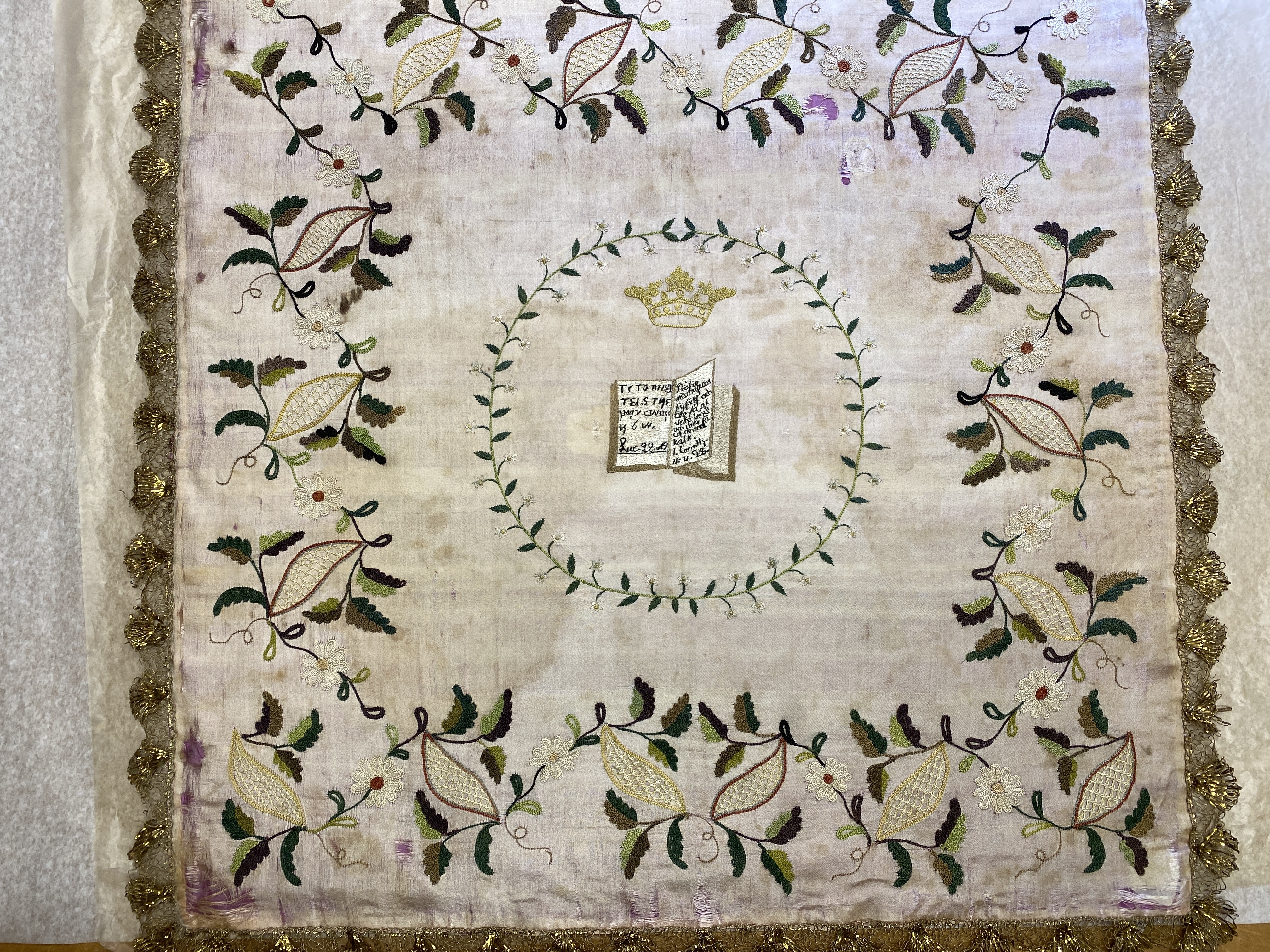 Benvit-gulaktig atlas med silkebroderi. Blomkrans med uppslagen bibel. Texter. Blomkvistsbård i silver. Knypplad guldspets. Cerisrosa taftfoder, E. Sofia Ekelund år 1816. Deponerad i SHM 1980.