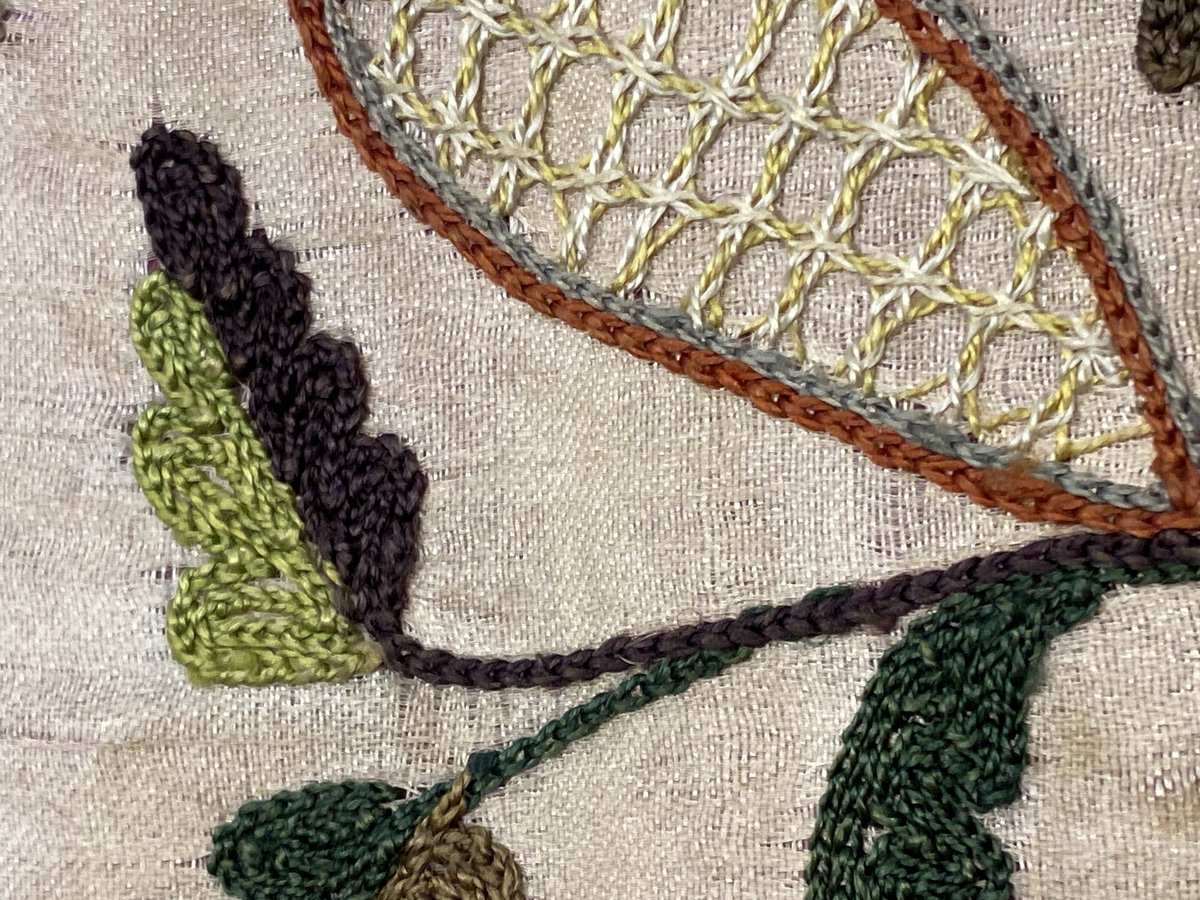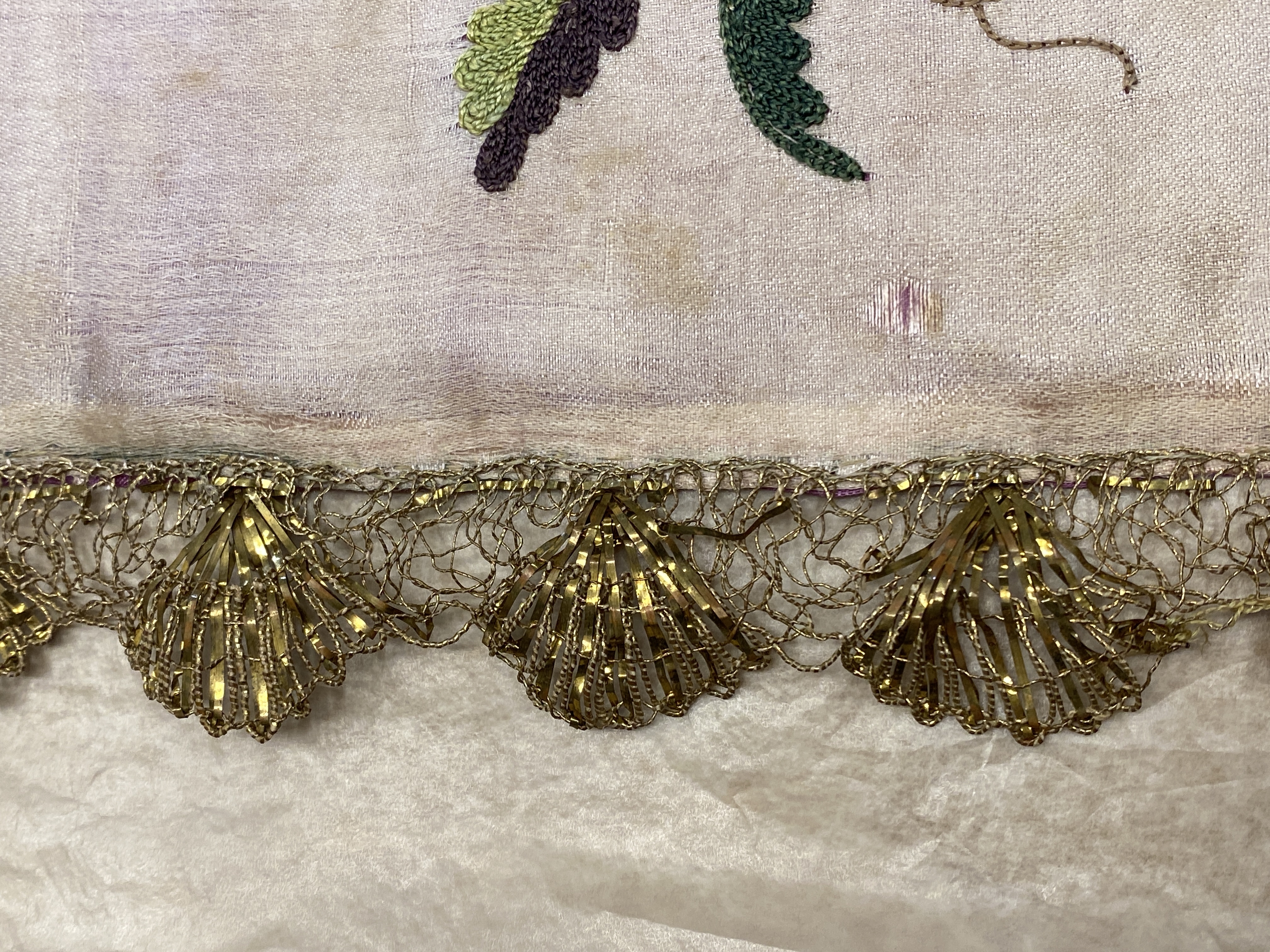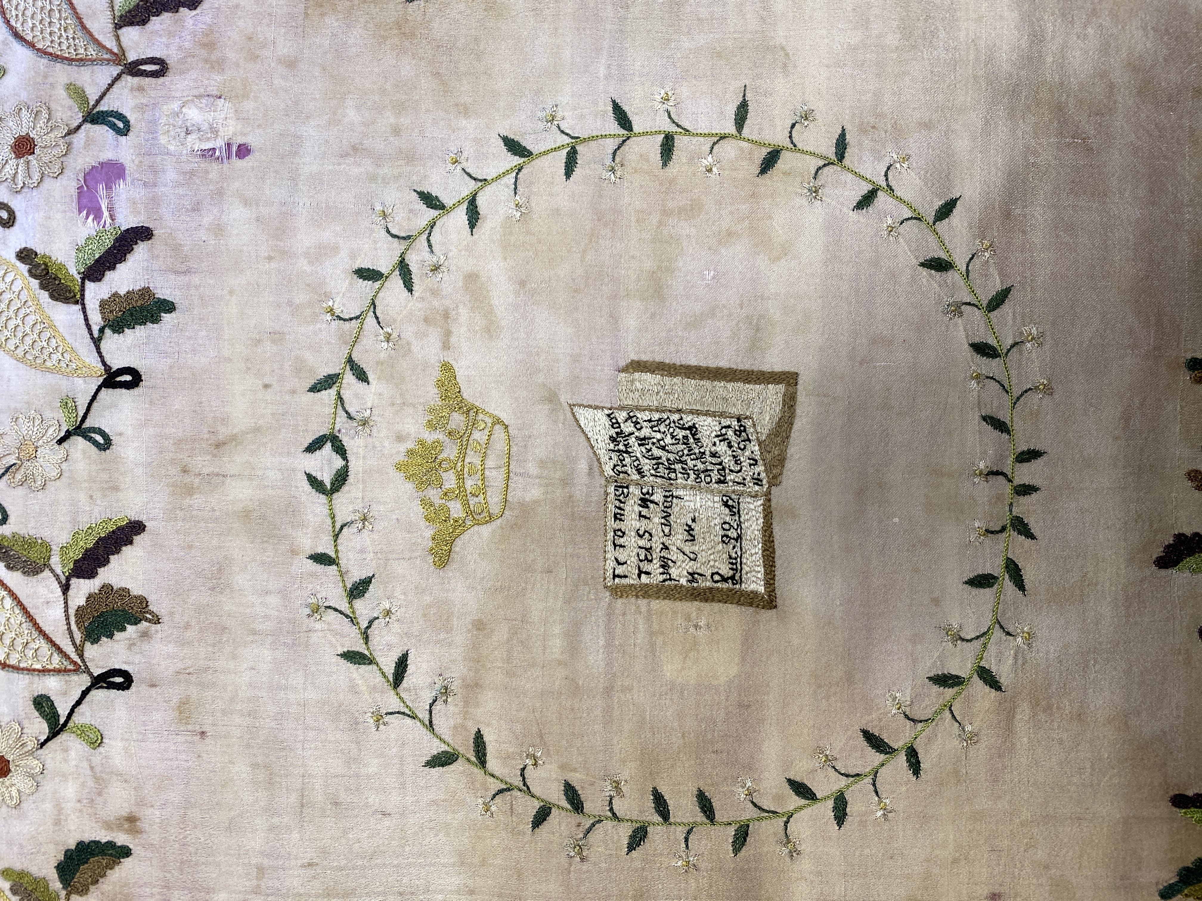 Benvit-gulaktig atlas med silkebroderi. Blomkrans med uppslagen bibel. Texter. Blomkvistsbård i silver. Knypplad guldspets. Cerisrosa taftfoder, E. Sofia Ekelund år 1816. Deponerad i SHM 1980.