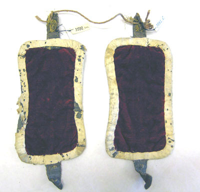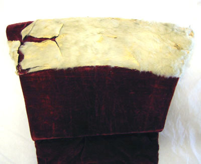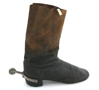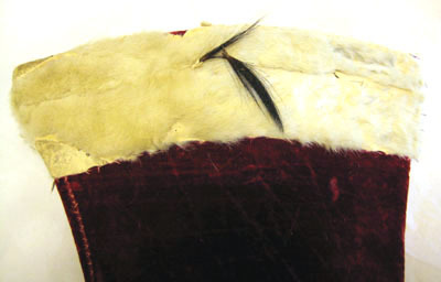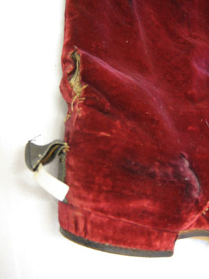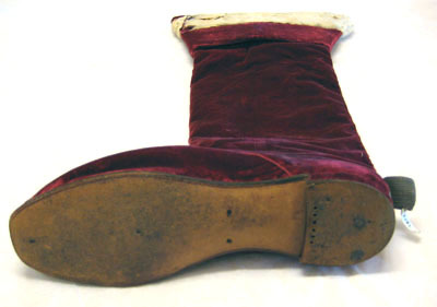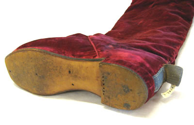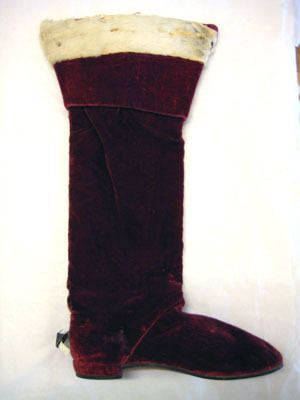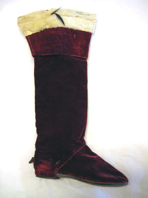 Stövel i röd sammet med krage dekorerad med en hermelinsbräm.Tillhörande sporrläder av rött sammet. På kragen är en 75 mm bred kant i hermelin-skinn. Kragen är 173 mm bred. På klacken är ett band vävt i guldtråd fastsytt för sporren. Bandet är 25 mm brett och 60 mm långt. Stövelns skaft har en söm mitt bak och fodret med ett kypertvävt. Klacken är gjort av läder och beklädd med rött sammet, 5 mm hög. Kragen är stärkt med ett kraftigt läder och fodrad med ett rött atlassiden. Sporrläder med gn 3582 g. är sydd i rött sammet som är 200 mm långt och 78 mm brett. Är kantad med vitt getskinn och fodret med rött sidentaft. Stroppar av guldbelagd kantiljtråd.