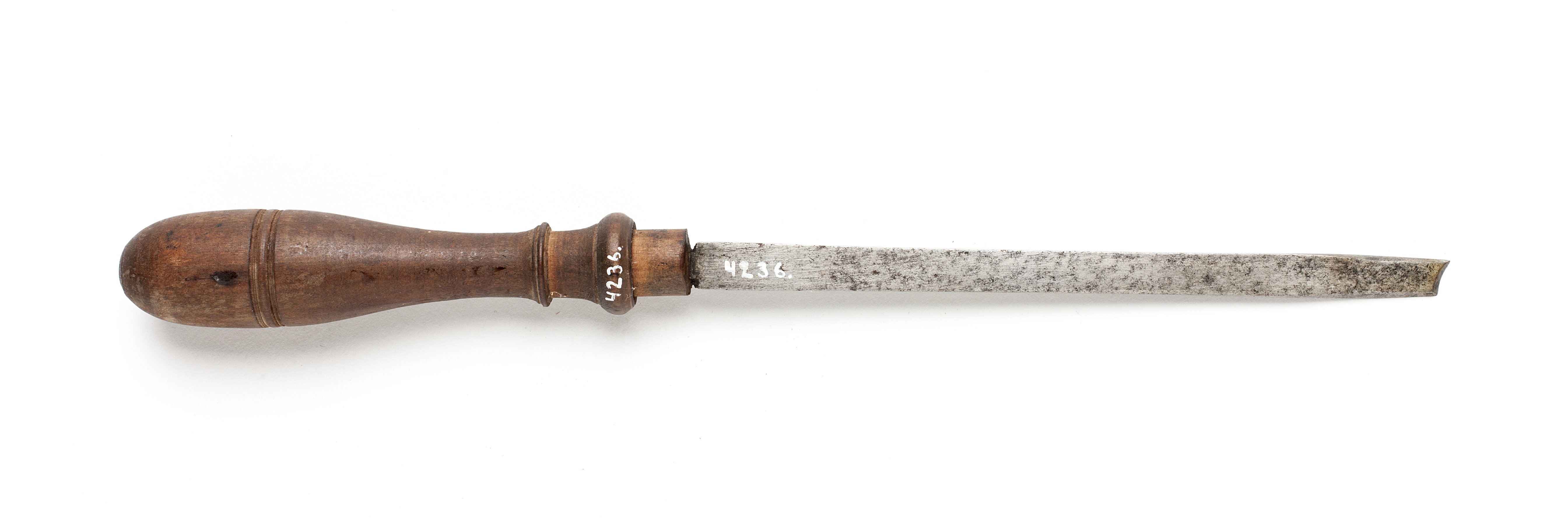Klinga med rektangulär genomskärning. Framtill avfasade kanter och sned, konkav egg. Svarvat skaft av päronträ med en vulst. Stämplat på klingan: "S B". (1930 års kat.: snett stavjärn)