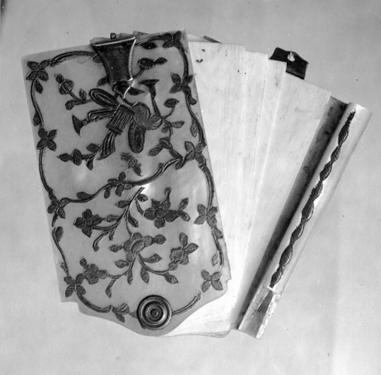 Skrivplån i form av sex elfenbensskivor med rundad överkant mellan skivor av pärlemor av samma form med inläggningar av förgyllt silver på utsidorna, blommönster, samt på vardera sidan en trofégrupp med musikinstrument, säckpipa, trumpet och trumma, på den bakre skivan dessutom en fågel (and?). Skivorna sammanhållna av stift i överkanten med brickor på utsidorna av förgyllt silver, pressad dekor av koncentriska cirklar. På den bakre skivans vänstra sida rörformig pennhållare av pärlemor. Skivorna nertill sammanhållna av knäpplås av förgyllt silver, på den uppfällbara låsdelens utsida kontrollstämpel, hundhuvud (Henry Clavel, S:t Germain-en-Laye, 1 dec. 1780-1789, se Carre, Les poincons de l orfevrerie francaise, s.123).