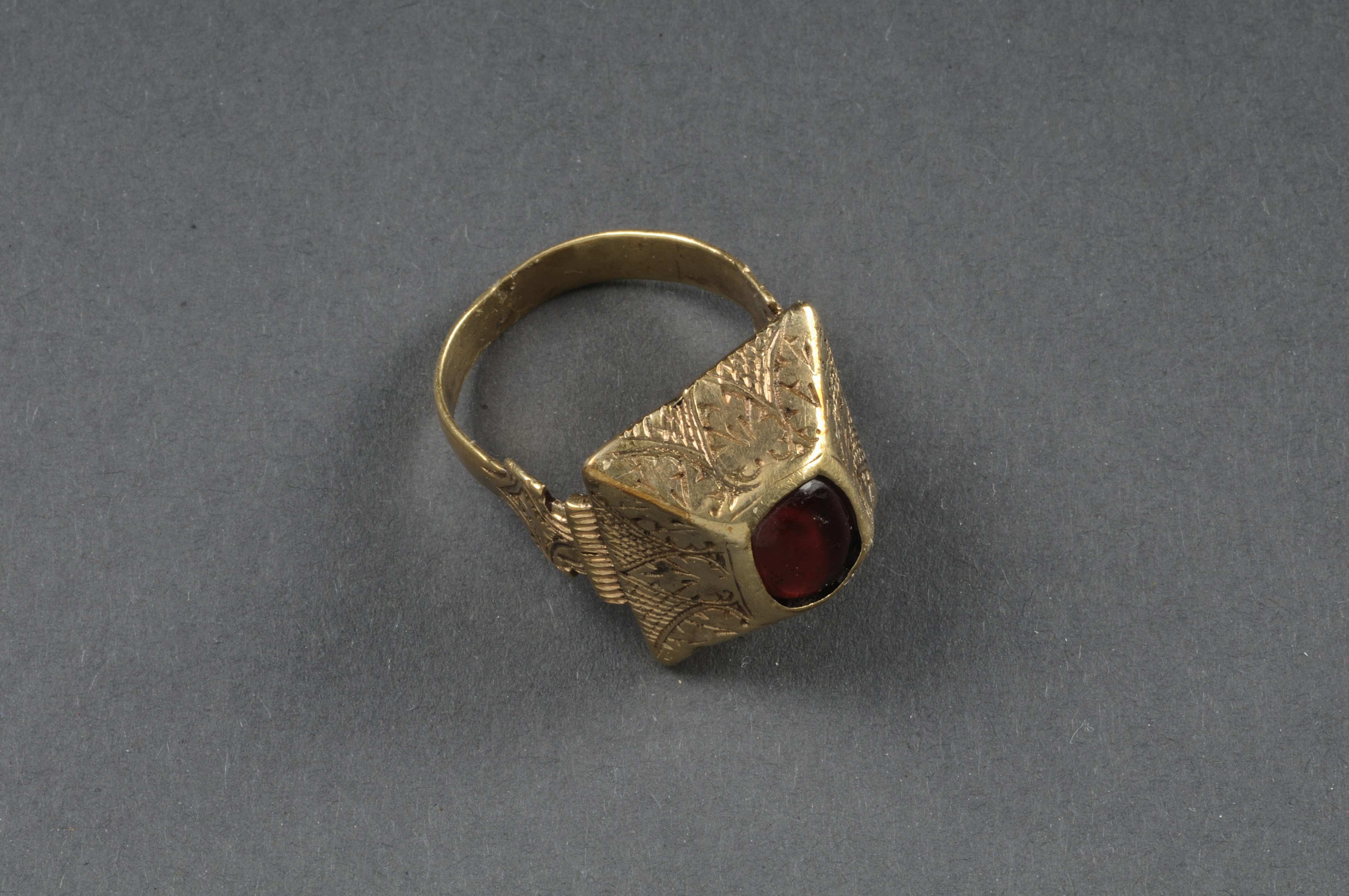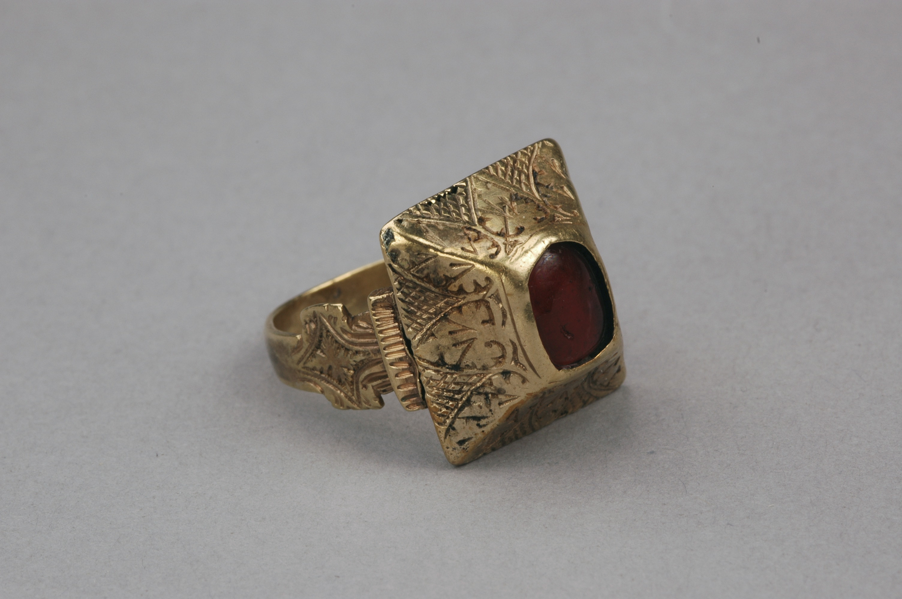 Själva ringen är smal och slät och har en kvadratisk klack med avfasade sidor i vilken en oslipad sten är infattad. Stenen kan vara en rubin. Klacken är graverad med bla palmetter och rosor.