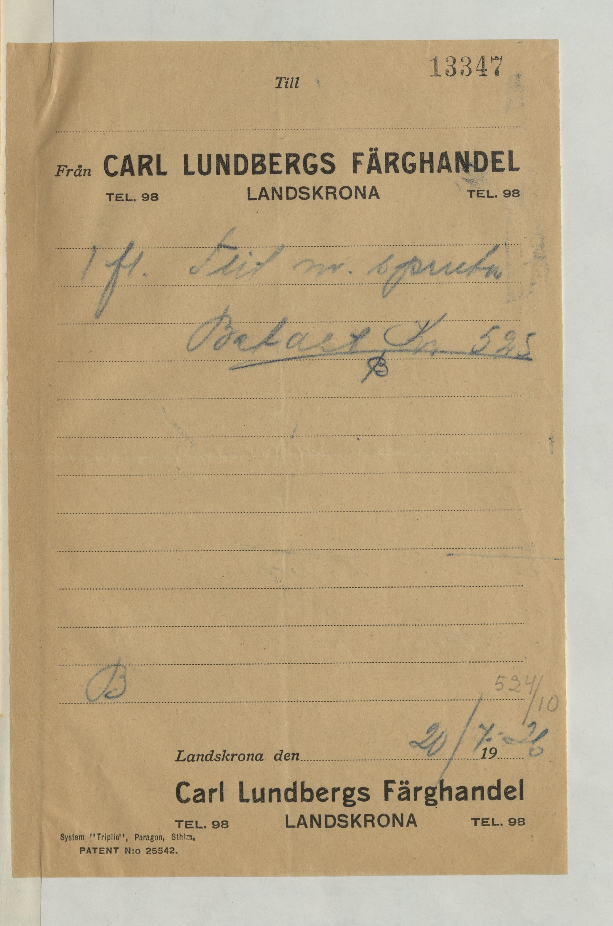 Kvitto från Carl Lundbergs Färghandel, 1926