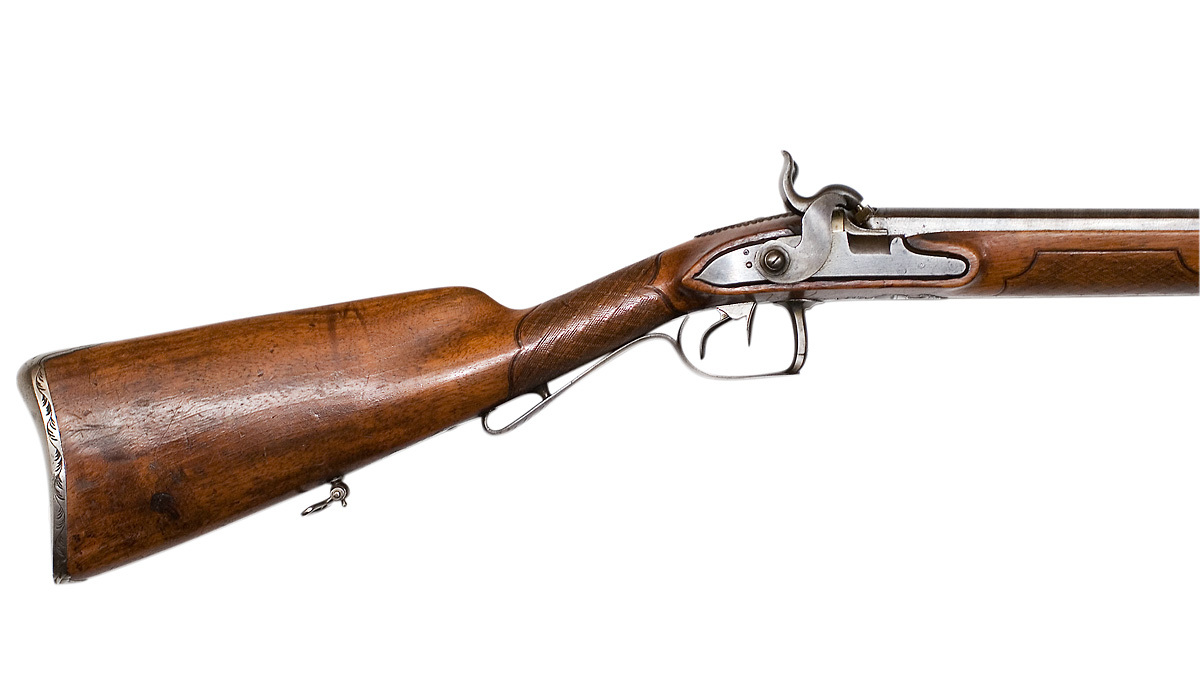 Runda, damaskerade pipor av stål förenade av över- och underspänger. Piporna förlängda baktill 21 mm med odamaskerat parti med baskylhakar urtag för tändhattsnipplarna. Skålad överspång, på underspången två häften samt kantig, balusterformig rörka med rembygel. Riktmedel: Djupt skålat sikte på baskylbladet. Knoppkorn av silver på överspången. Fästning: Pipan fäst med baskylhakar samt ett engelskt pipstift av stål (spetsen avbruten). Två slaglås med plana låsbleck, fasade kanter, igensatta hål för fängpanna och eldstål-eldstålsfjäder, rundad fasning b: ca 20 mm på överkanten över fängpannans igensättningsklack. Platta, s-formiga inåtsvängda hanar med släta s-formigt svängda slaghuvuden. Fästning: En låsskruv från v. låsbleck. Dubbla avtryckare. Profilerat avtryckarbleck. Halvstock av ljusbrunt trä (valnöt ?), kolv med kindstöd, kolvhalsen skuren i nätmönster med fem linjer i varje knippe, silverstift (?) i mellanrummen, samma dekor på framstocken. Bakplåt av stål med omvikt kant kort flik på kolvryggen, ände i form av palmett, vid hälen fågel, längs kolvändens sidor djupt graverade rankor. Två skruvar. Baskyl med graverad dekor, runt baskylbladet inslaget 35 silverstift med välvda huvuden. Kantig, balusterformig spetsrörka av stål vid övergången till spetsen nedsvängd i rundad spets, kraftigt profilerad spets med graverad dekor. Varbygel med bred, platt bygel, kantig framstolpe, kluven bakre stolpe, på bygeln graverad oval med sittande räv i landskap. Fri bakre arm med omvänt c-formig stolpe, profilerad ändplatta, enkel, graverad dekor. Kraftigt profilerad främre arm med graverad dekor. Bakom varbygeln en rembygel av stål, den andra på mellanrörkan. Tillbehör: Laddstock av trä, l: 834 mm, framtill konisk hornskoning, l: 23 mm.