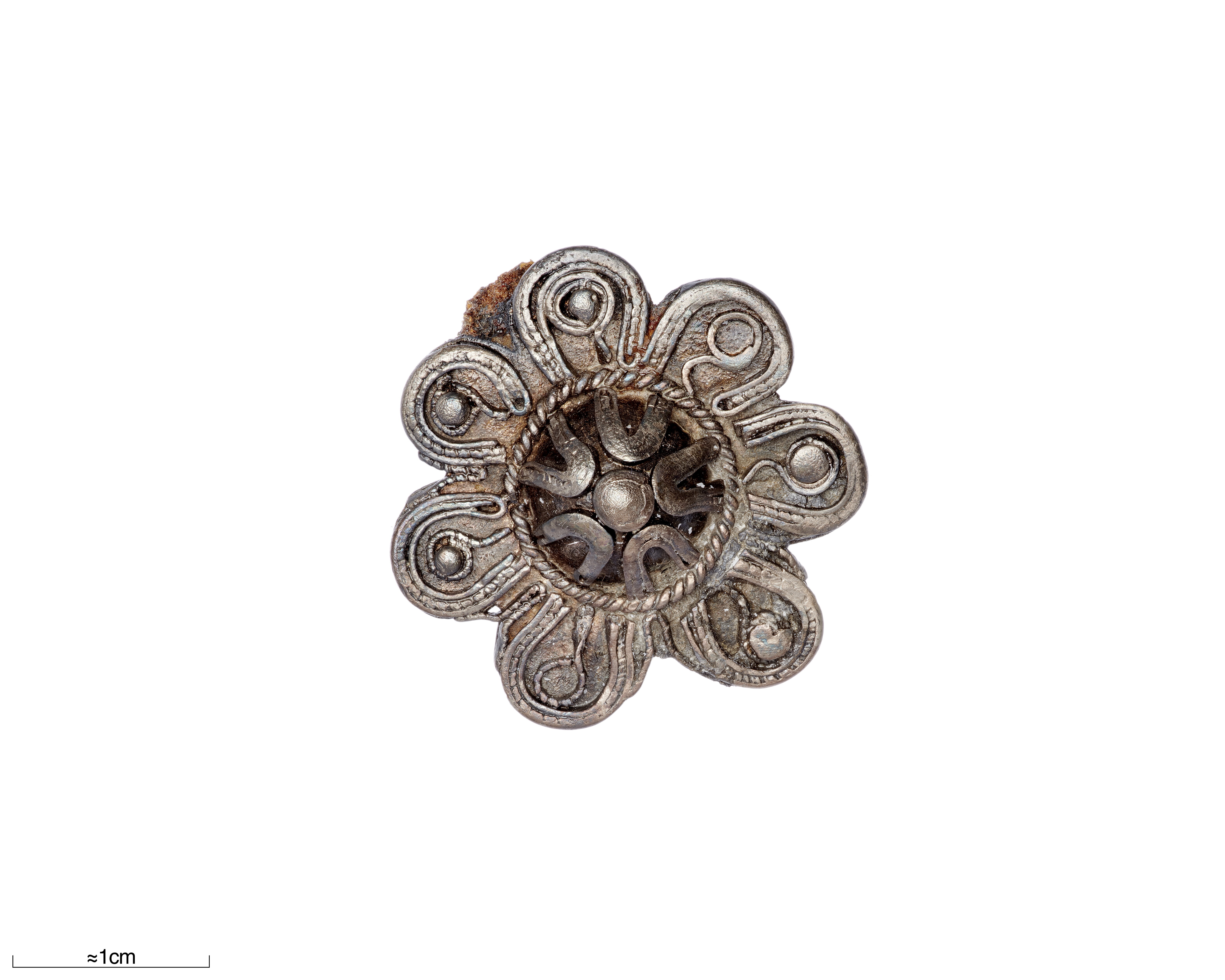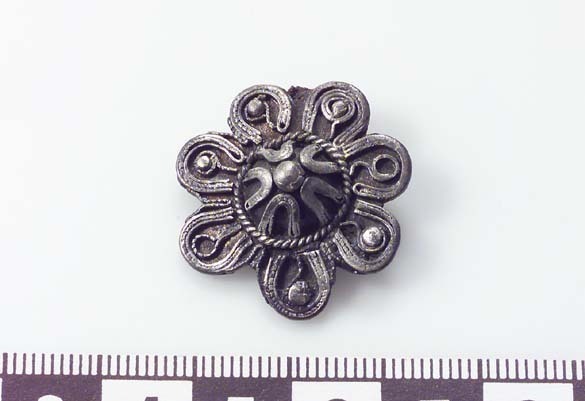 Runt blomformigt sjuflikigt silverspänne med grov filigranornering