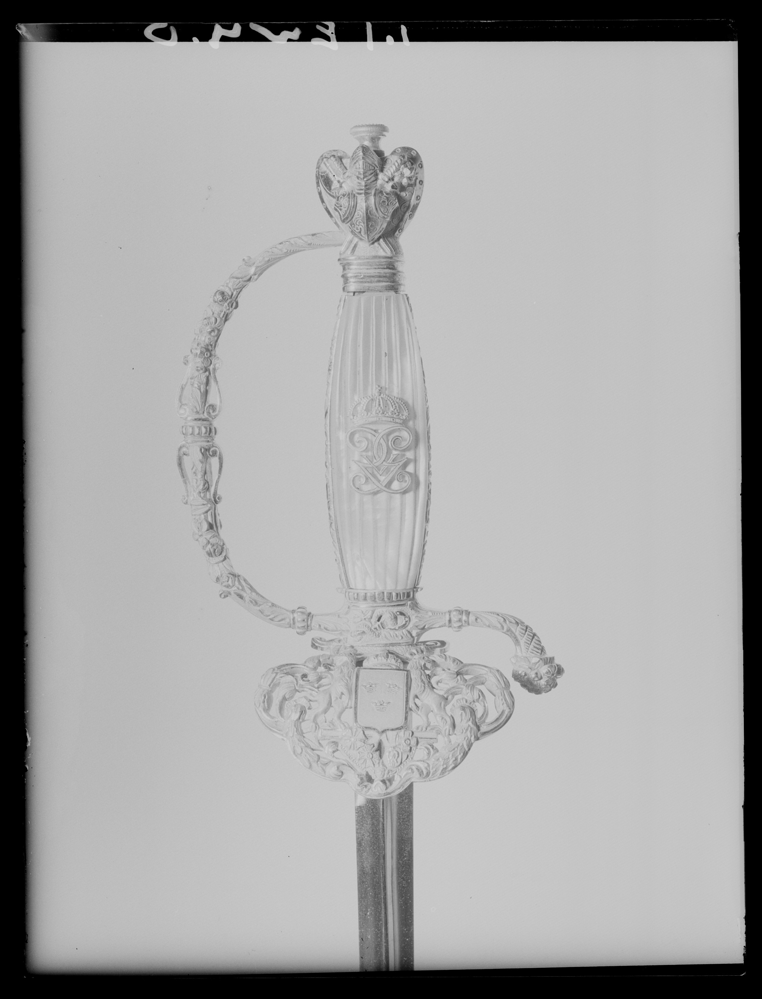 Fäste à clavier av förgylld, reliefornerad mässing. Knapp, hjärtformig med bröstharnesk och hjälm över korslagda vapen, svärd, yxa och stridsklubba. Nitknapp tämligen hög, utsvängd upptill och med plan översida. Nitknappen lös, skruvad på tångens gängade övre ände. Handbygeln med reliefdekor i form av blommor och blad samt slingrande orm. Bakre parerstång med bladdekor, nedböjd och avslutad med reliefornerad knopp. Genombruten yttre parerplåt, nedåtböjd med vågig kontur. I centrum lilla svenska riksvapnet med tre kronor i krönt sköld, sköldhållare lejon, nedanför vapenskölden olika ordensstjärnor samt vase. Rektangulär kavel med förgyllda smalsidor av mässing med graverade rankor och blommor. Bredsidorna av pärlemor med vertikala räfflor. På utsidan Gustav V:s krönta namnchiffer av förgylld mässing. Klinga rak, treeggad s.k. stukatklinga av stål utan ornering.
