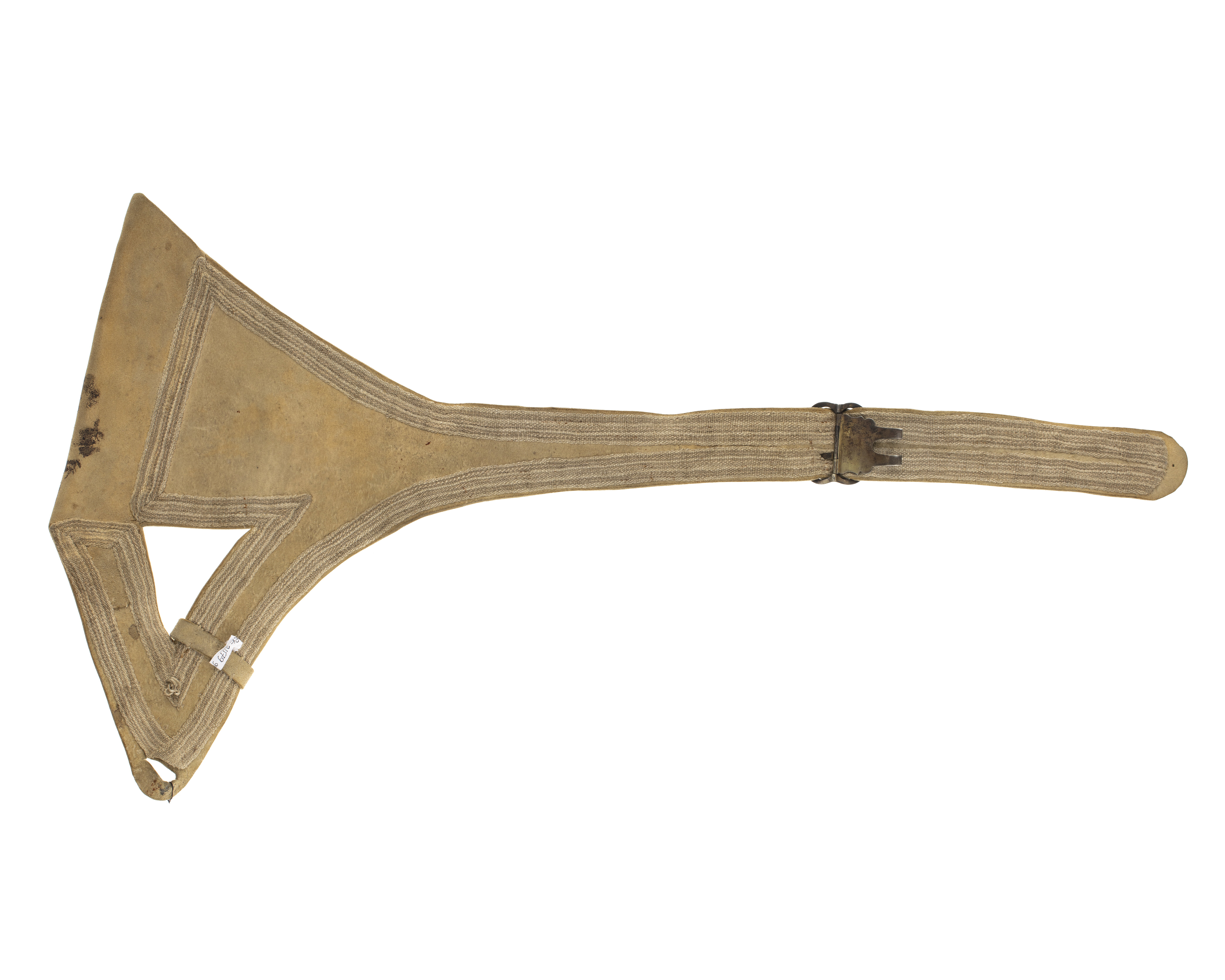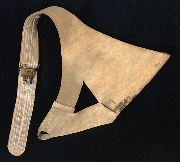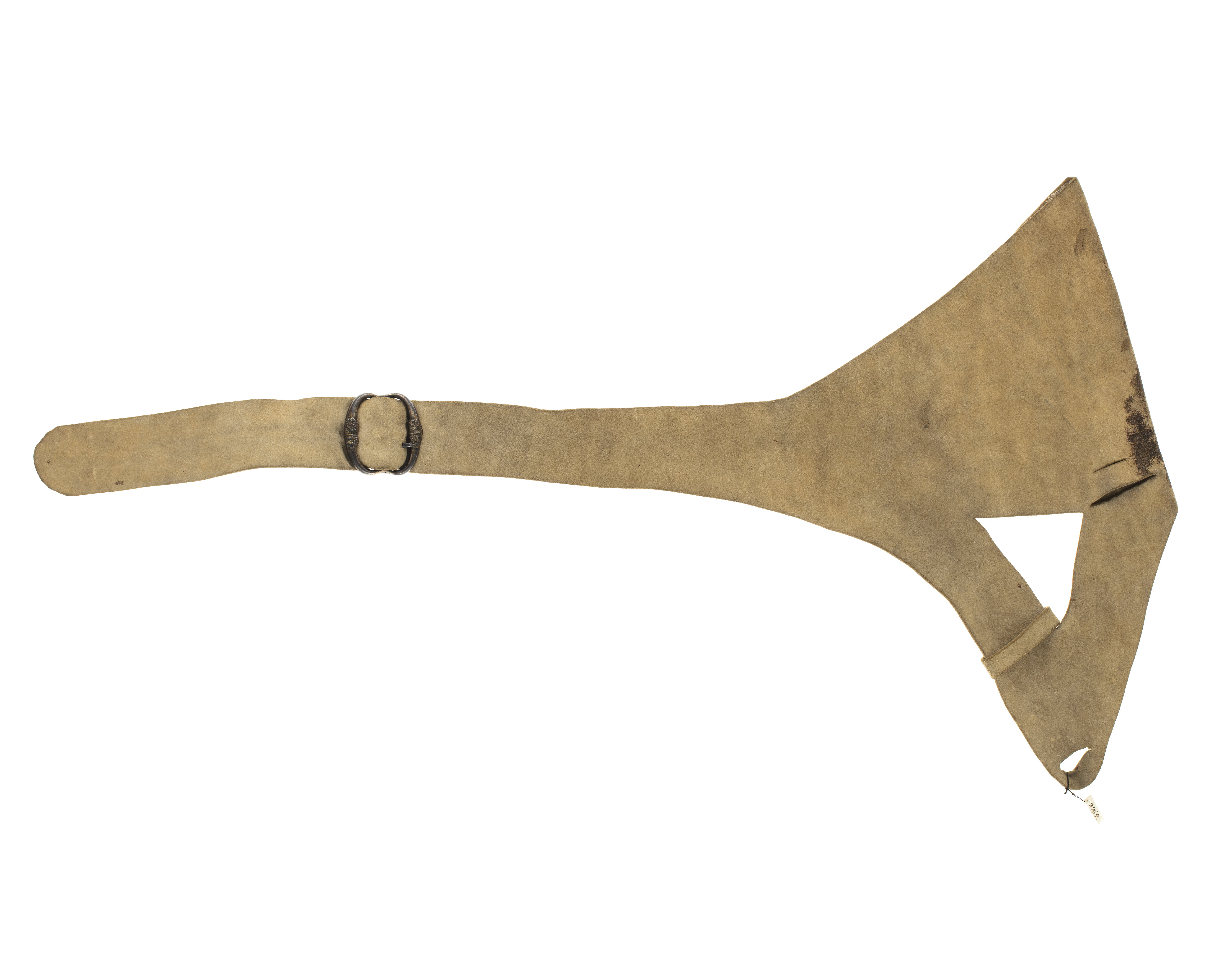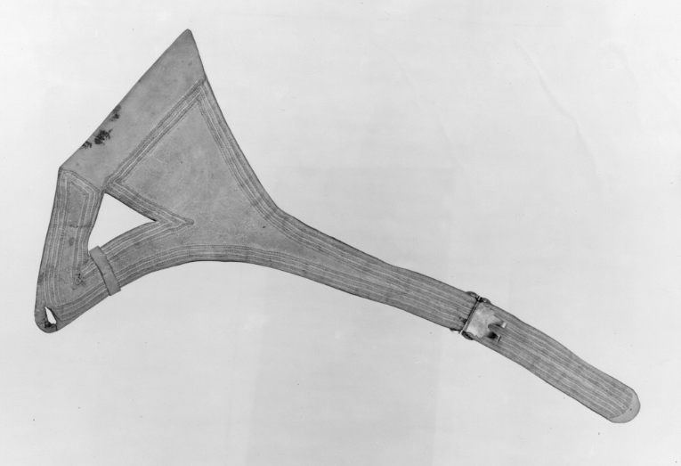 Midjegehäng tillverkat av 5 mm tjockt sämskat älgskinn. Gehänget hålls på plats med ett förgyllt silverspänne. Baksidan är förstärkt med ett 25 mm brett, randigt linneband i naturfärg och grått.