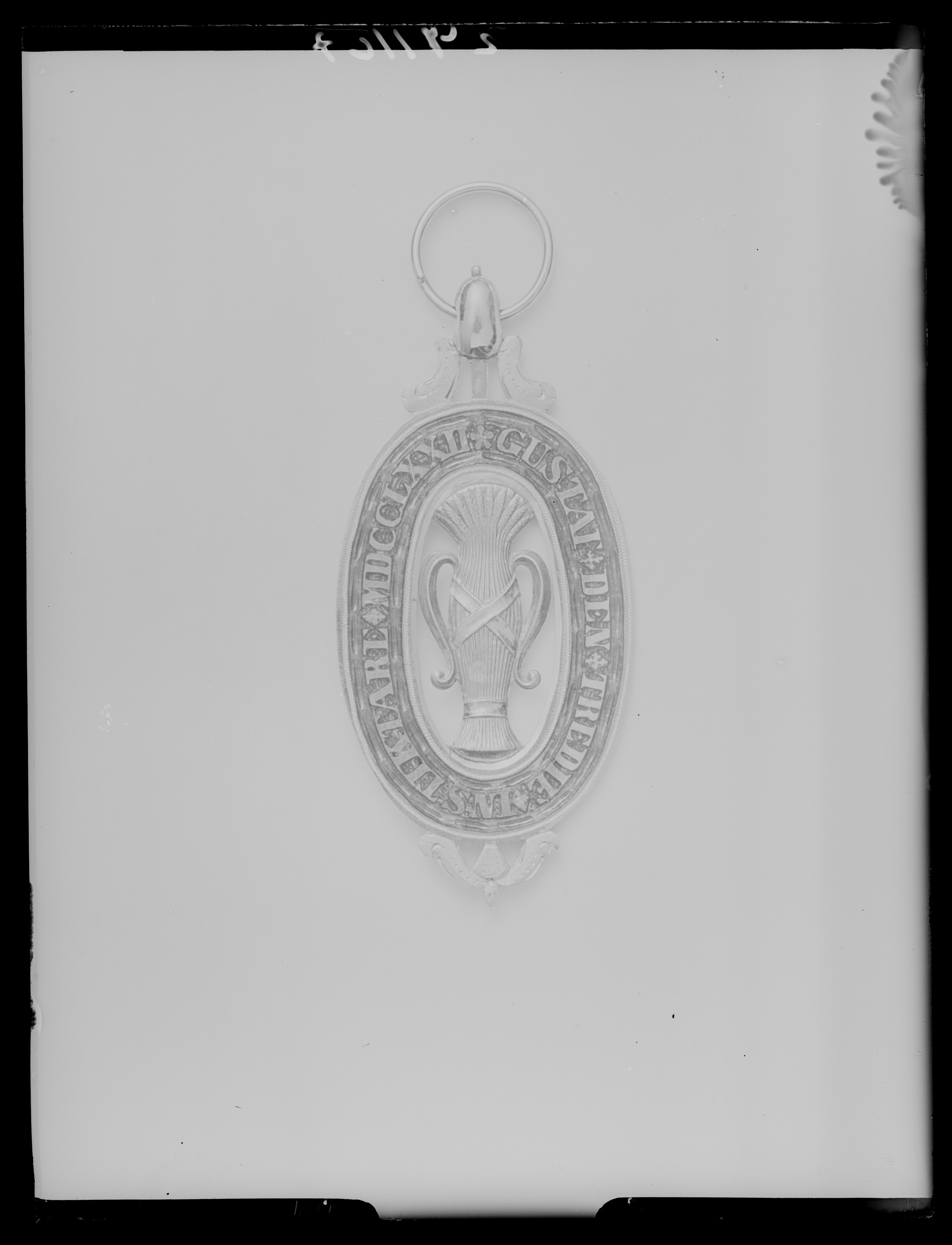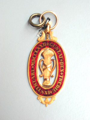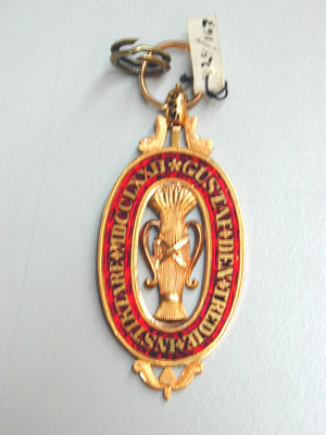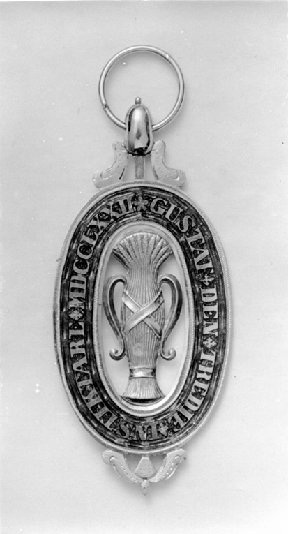 Dubbelsidigt tecken, i mitten vase av guld, omgiven av oval ring av guld, delvis täckt med röd genomsynlig emalj, guldtext: "GUSTAF DEN TREDIE INSTIKTARE MDCCLXXII". Nertill bladornament av guld, upptill oval kula, flankerad av nedåtriktade vingar, igenom kulan draget en spiralformig rund bandring.