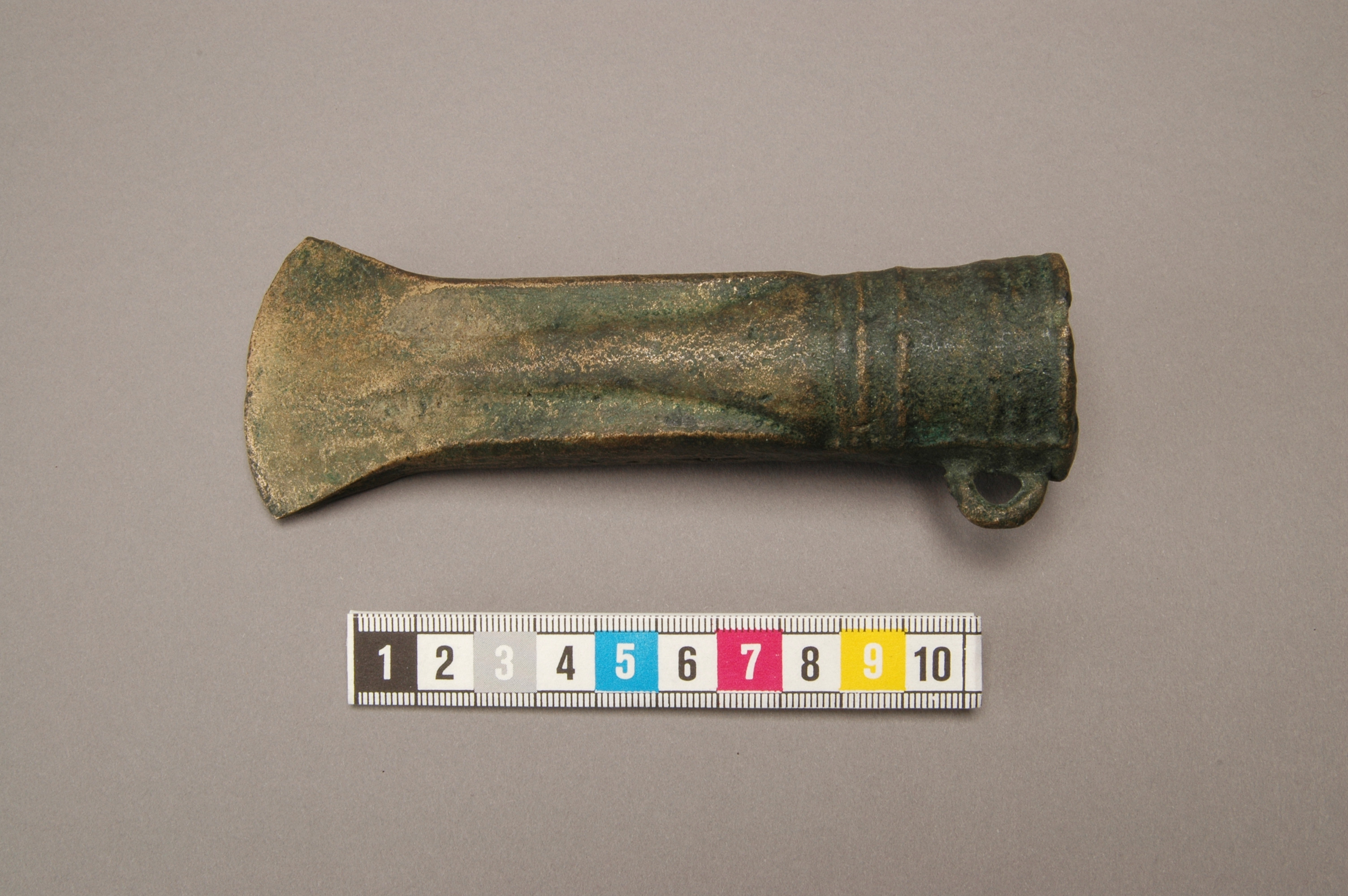 Holkyxa av brons med litet öra och med upphöjda ränder kring övre delen.