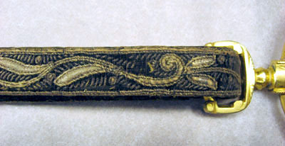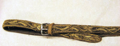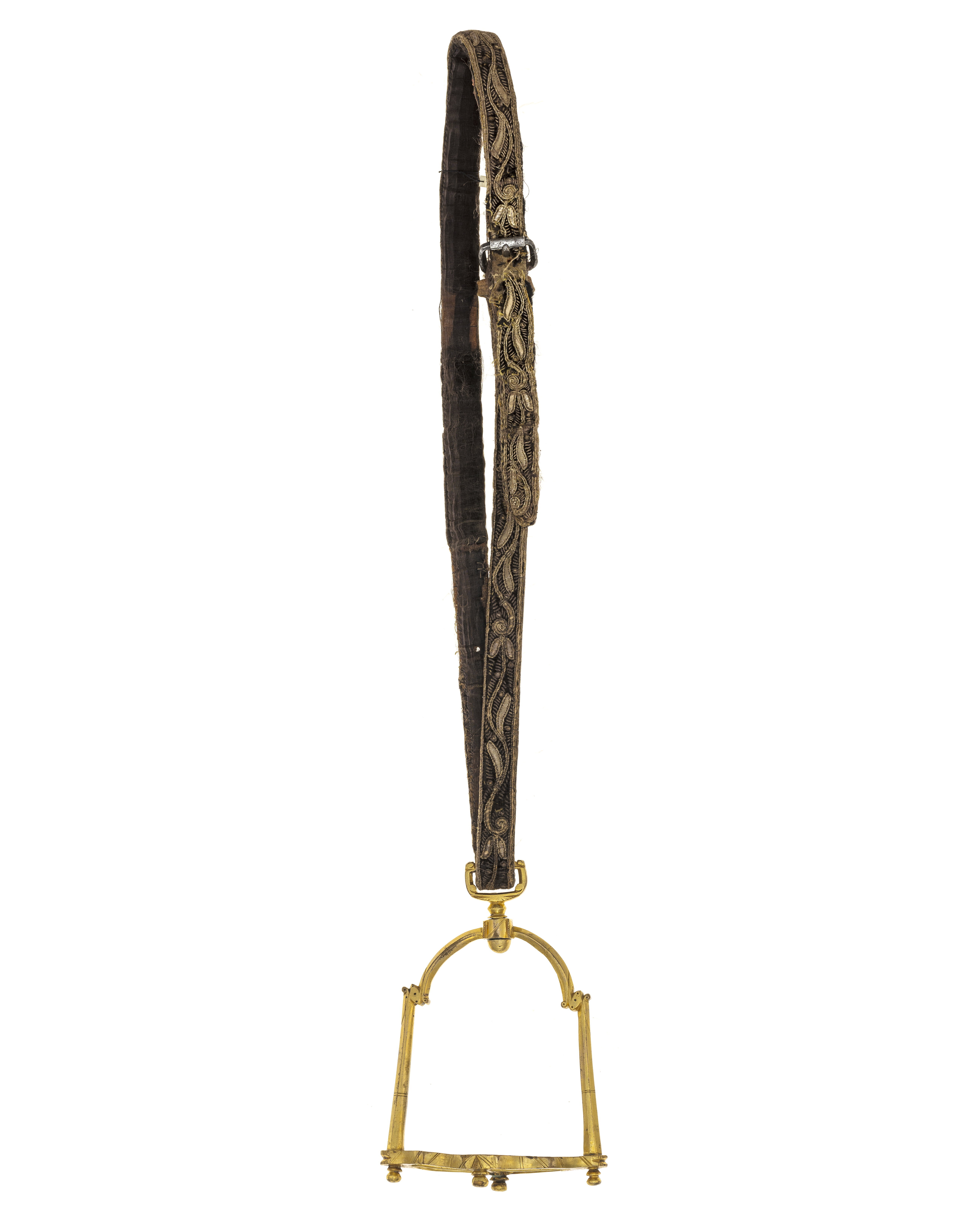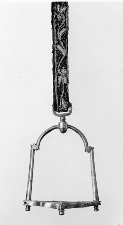 Långt jämnbrett stigläder av brunt läder på undersidan och på ovansidan ett tunt lager av ljust sämskskinn klätt med svart silkessammet och broderier. Broderiet är utfört i guld och silvertråd samt lan och gul silkestråd i upphöjd relief på silkeskärna. Broderiet löper i en smal längsgående rad på stiglädrets mitt, på båda sidor inramat av ett smalt band av tvinnad gul silkestråd. Broderiet föreställer stiliserade spolformiga blad och voluter klättrandes på en ranka. Som utfyllnad för att täcka ytan har broderats små strimmor av silvertråd. Mellan lädret och det sämskade skinnet sitter i ena änden av stiglädret fastsatt en hälla, troligen en gång svartmålad men numer brun sedan den svarta färgen skavts av. Ytterst sitter ett silverfärgat spänne av stål med en rektangulär ram. Ett litet skärphål 155 mm från spännet och fyra skärphål mot stiglädrets mitt. På stiglädret sitter en förgylld stigbygel nnr 31464.