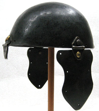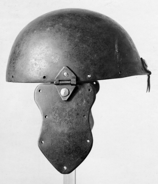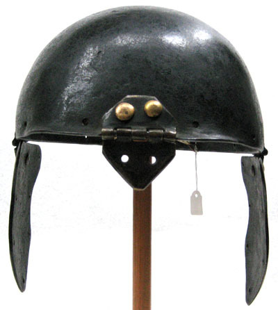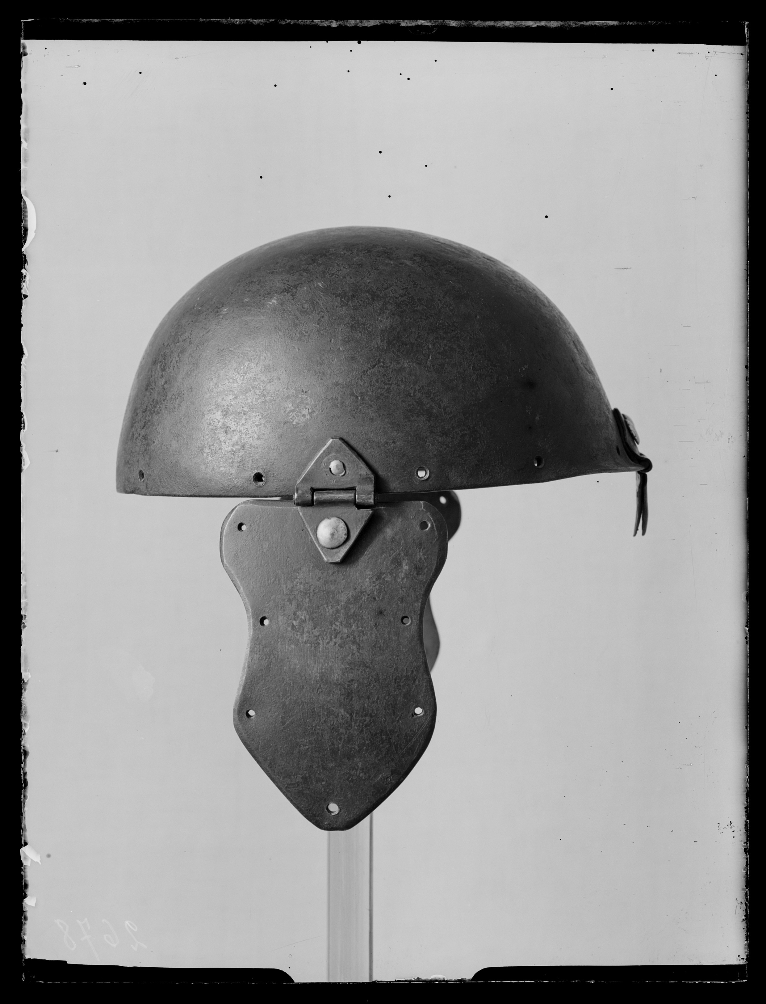 Av stål, både ut- och insidan svärtade / svartmålade. Halvklotformig klocka, något längre än bred. I mitten ett koniskt hål, diam 5 mm. Rak nederkant, på ena kortsidan (framåt?) utsmidd till en endast 7 mm bred skärm. I skärmens mitt en urtagning, i denna ett gångjärn av svartmålad gulmetall med avklippta hörn, fäst i klockan med två kullriga gulmetallnitar (förgyllda?). I klockans nederkant jämnt fördelat elva hål. Öron/kindskydd nitade i klockans kant med samma typ av gångjärn av gulmetall som framtill. Formen avlång, svagt välvd med rundade urtag i sidorna och spetsigt avslut. Kanterna fasade med sammanlagt sju hål.