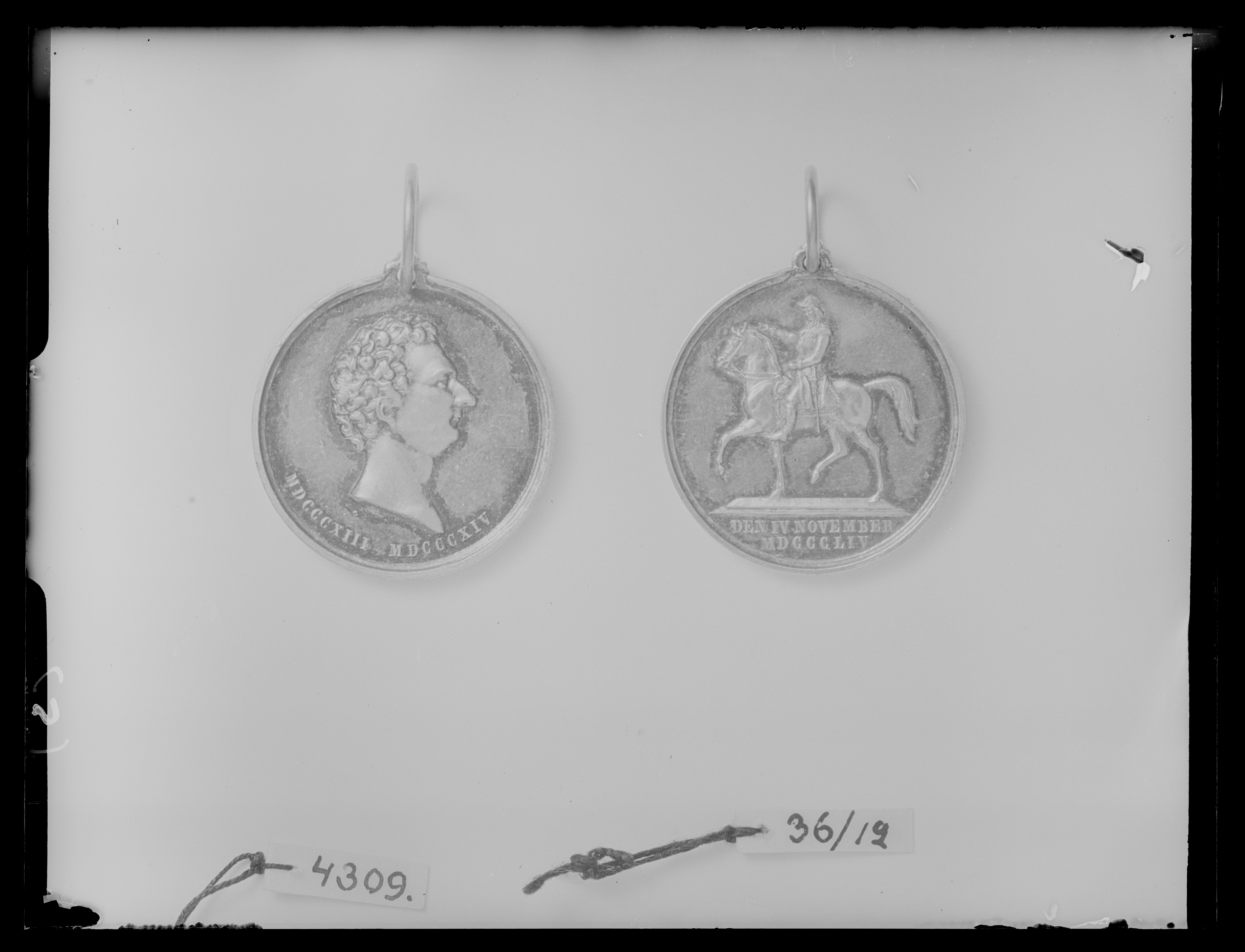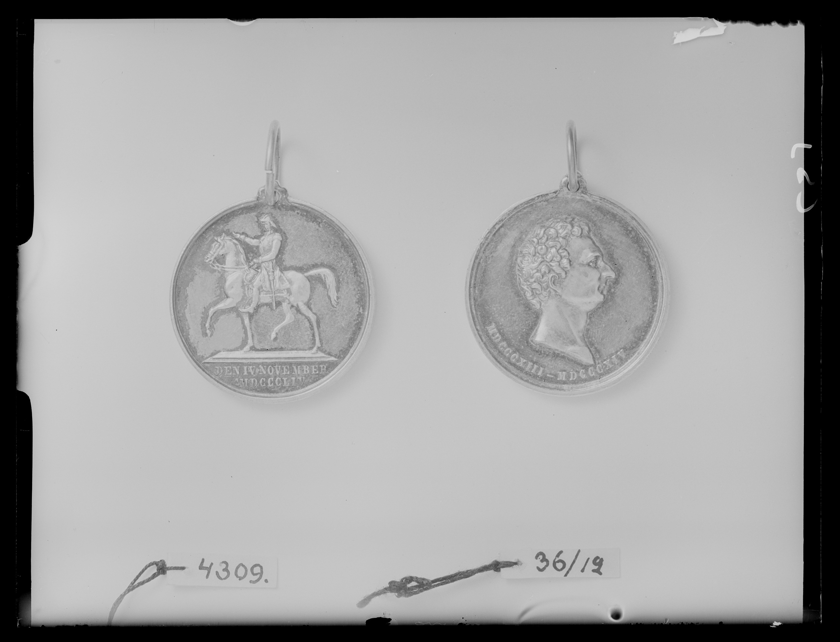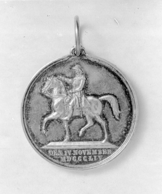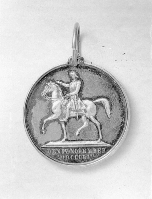 Åtsida: Karl XIV Johan, halsbild, profil h, omskrift nertill: "MDCCCXIII MDCCCLIV". Frånsida: Karl XIV Johans ryttarstaty vid Slussen, Stockholm, i avskärning nertill text: "DEN IV NOVEMBER // MDCCCLIV".