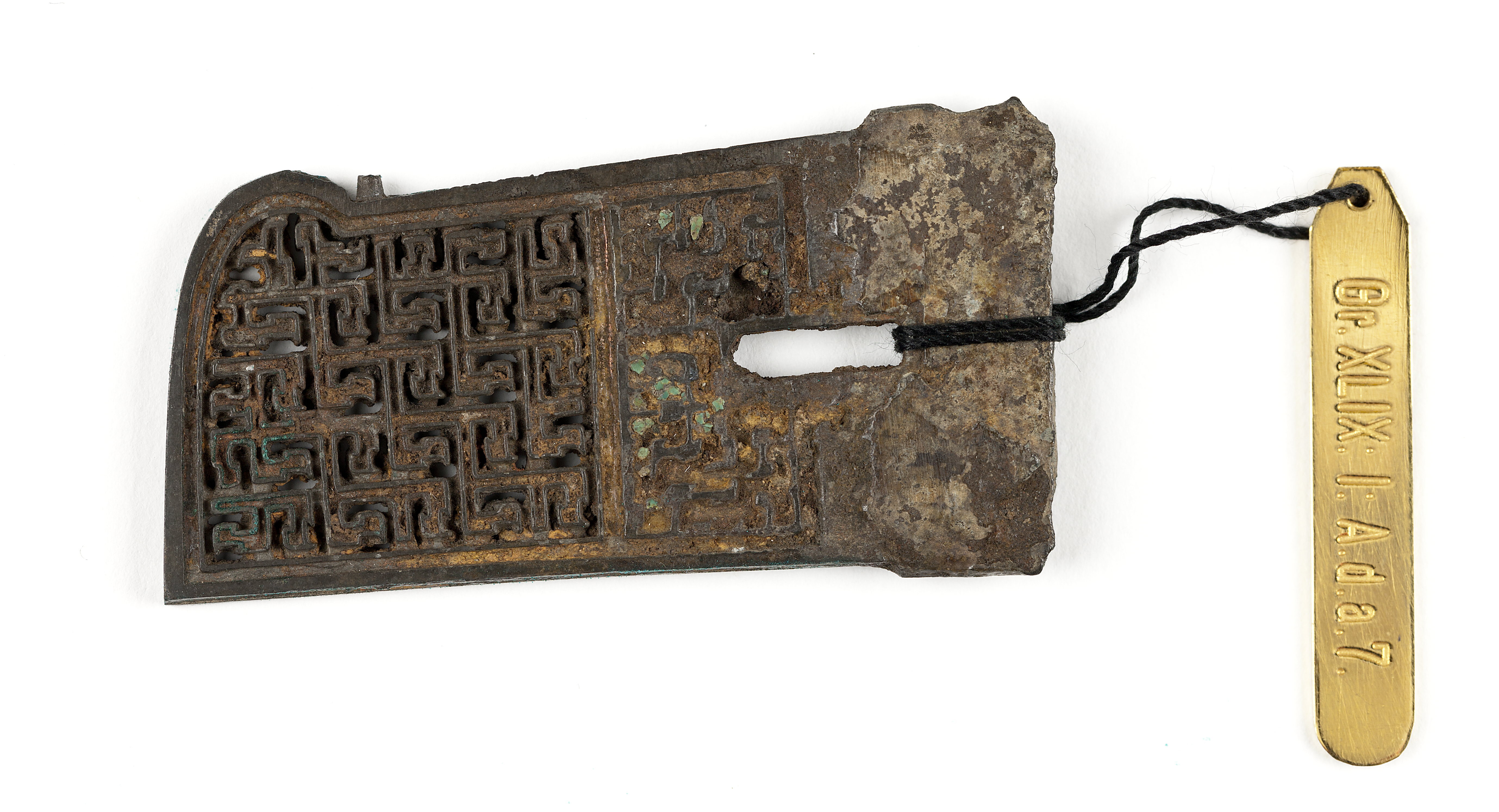 TILLÄGG: Fragment av dolkyxa (ge) daterad till Östra Zhou dynastin (770-256 f.v.t.). Fyndplats Shouzhou (Shou, Anhui provinsen). Fragment av dolkyxtånge. Sannolikt abstrakt drakmönster. Föremålet kan ha varit försett med inläggningar med turkos eller annan sten. I Östasiatiska museets samlingar finns en dolkyxa (ge) med genombruten dekor och turkosinläggning (OM-1974-0371) och som daterats till Östra Zhou dynastin.