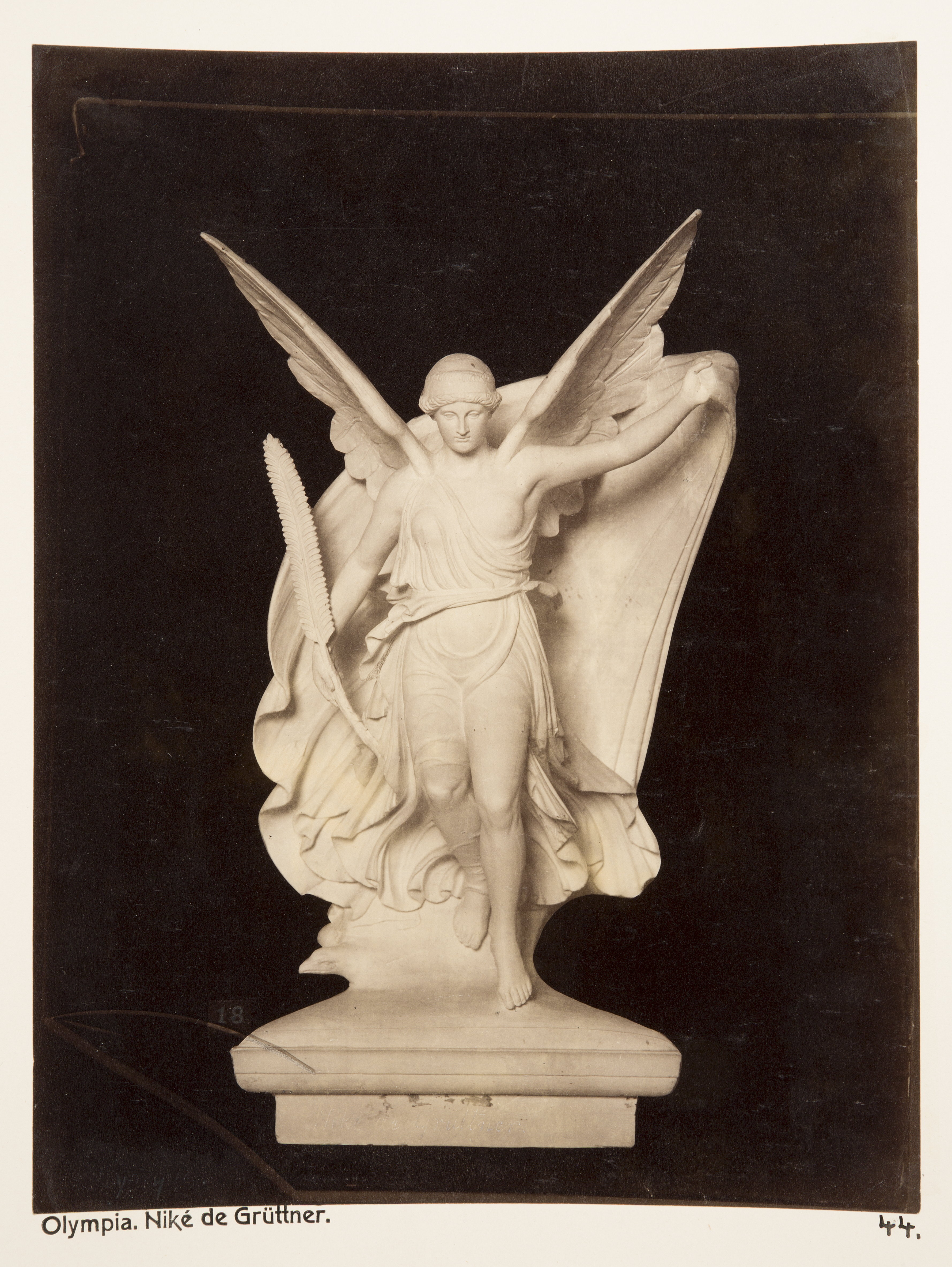 Nike av Paionios, rekonstruktion av Richard Grüttner. Text på originalet: "Olympia. Niké de Grüttner." Foto från resa genom Grekland, Makedonien och Serbien, 15 mars-6 juni 1896. Fotografierna LXVI:K.18.-147. är köpta av Wilhelmina von Hallwyl, f. Kempe på Korfu samt i Patras, Nafplion, Aten, Thessaloniki och Belgrad. Med på resan var maken Walther von Hallwyl och fröken Ida Uhse. Uppgifterna kommer från Ida Uhses reseanteckningar.