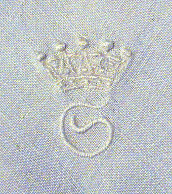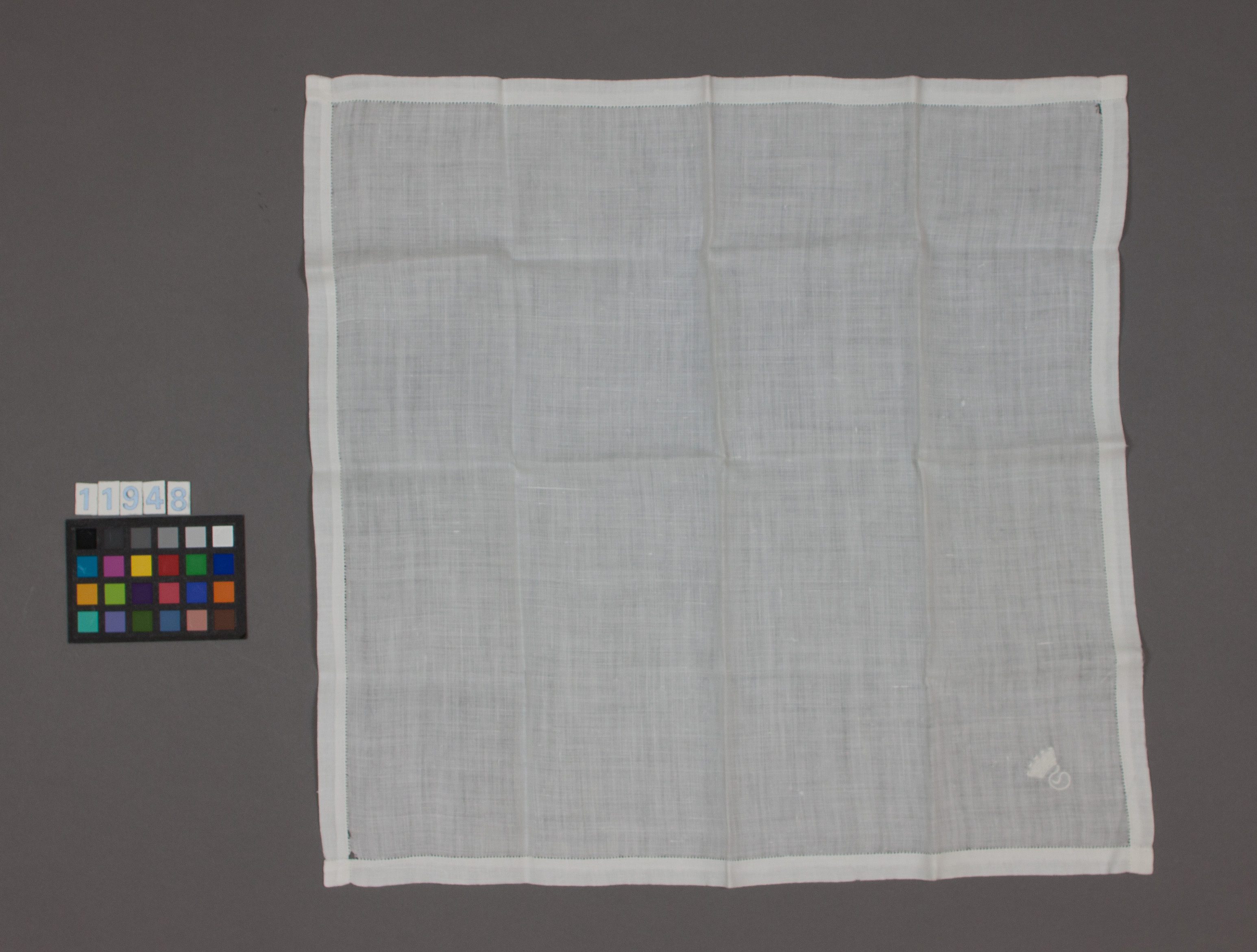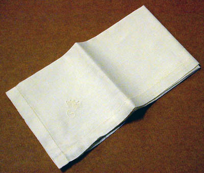 Näsduk av vit linne med bård av tjockare vit bomull. Vid ena hörnet Sibyllas monogram, krönt S.