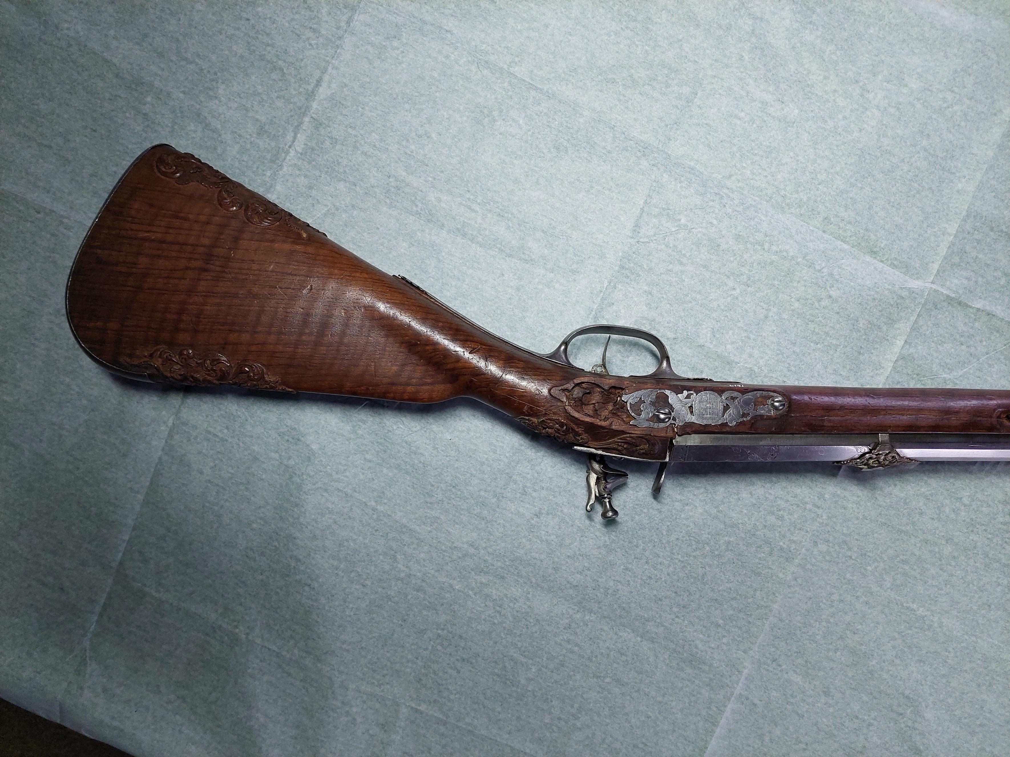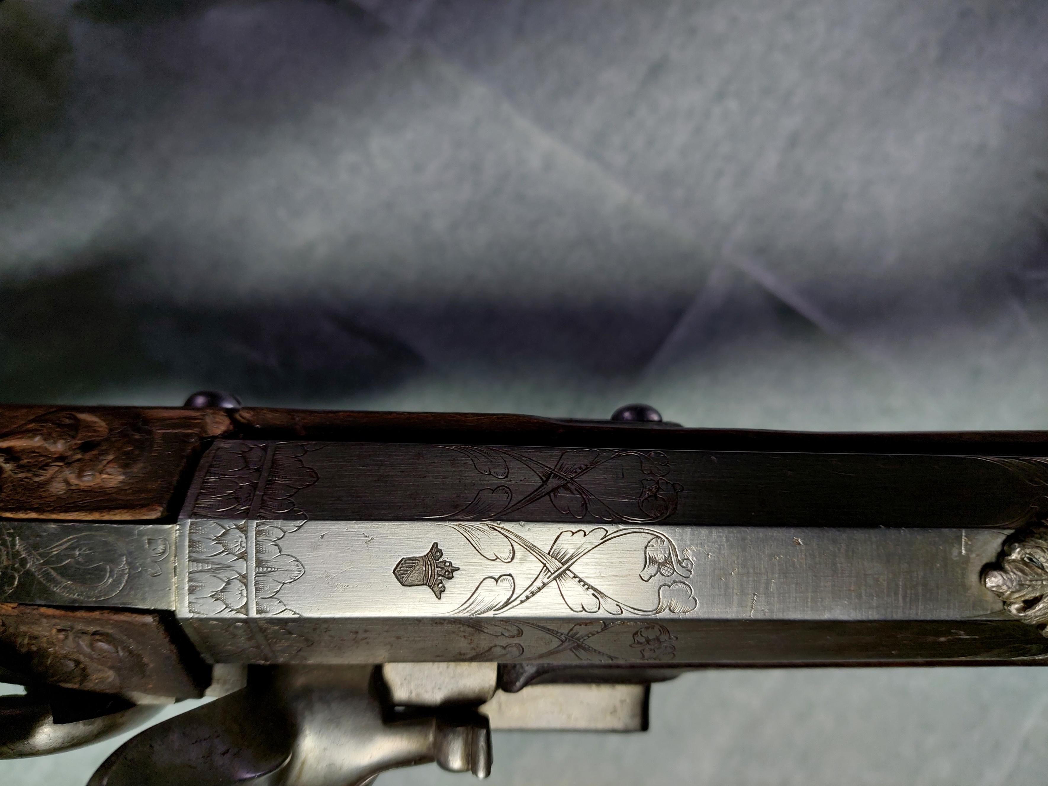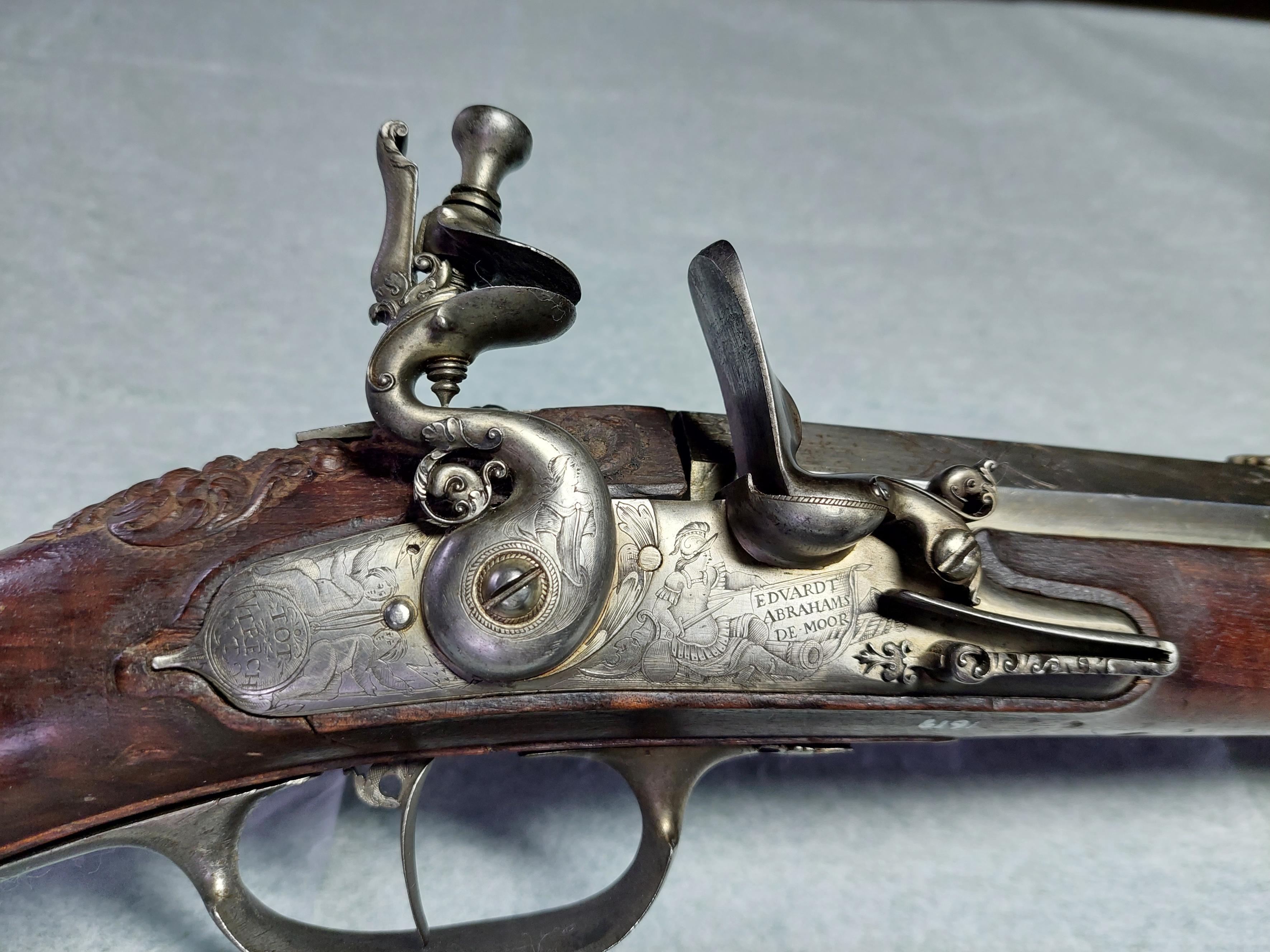 Flintlåsbössa signerad Edvardt de Moor, Utrecht. Tillhört K.G. Wrangel, i par med inventarienummer 5517. Rund, över kammarens bakre del åttkantig samt vid främre kammaren sextonkantig pipa av stål. Slätborrad. På kammaren finns en stämpel med Utrechts vapen (Stöckel nr 1744, ca 1665). På kammaren finns graverade blommor. På pipans främre del är graverat band av pilblad. Gördelsikte av silver, rikt utskutet i bladornament. Knoppkorn av mässing, 65 mm från mynningen. På pipans undersida finns en smedsstämpel. Tre piphäften. Flintlås. Svagt kullrigt låsbleck, baktill avslutat i liten spets. Under fängpannan är signerat: "EDVARDT - ABRAHAMS - DE MOOR" och på låsbleckets bakre del är graverat innanför en cirkel: "TOT - VTRECHT - T". S-formig hane med ornament mellan hals och kropp. Lös överkäke. Graverad dekor: två putti, kvinna, antikiserande krigare med trofégrupp. Eldstål med gåsbuk, upprullad eldstålsklack. Utvändig eldstålsfjäder. Nöt med studel. Hel stock av valnöt, fransk kolvtyp. Bakplåt av stål, som fortsätter in över hälen. Kolven har snidad dekor: lejonmaskaron respektive antikiserande krigare. Sidbleck av stål, föreställande havsväsen hållande en lagerbekransad sköld med Wrangels stora grevevapen krönt av en grevlig krona. Smalt näsband av stål och tre rörkor av svarvat stål. Fransk varbygel med på undersidan graverad blomma. Tillbehör: Stålskodd laddstock. Märkt: 118 bakom låsblecket, stanstyp 5376.